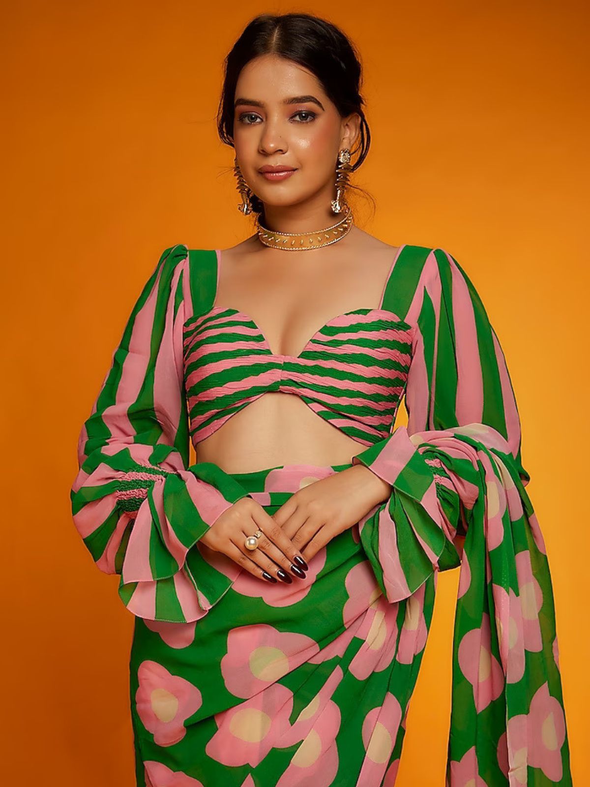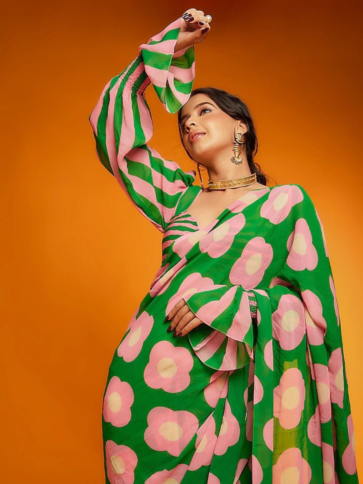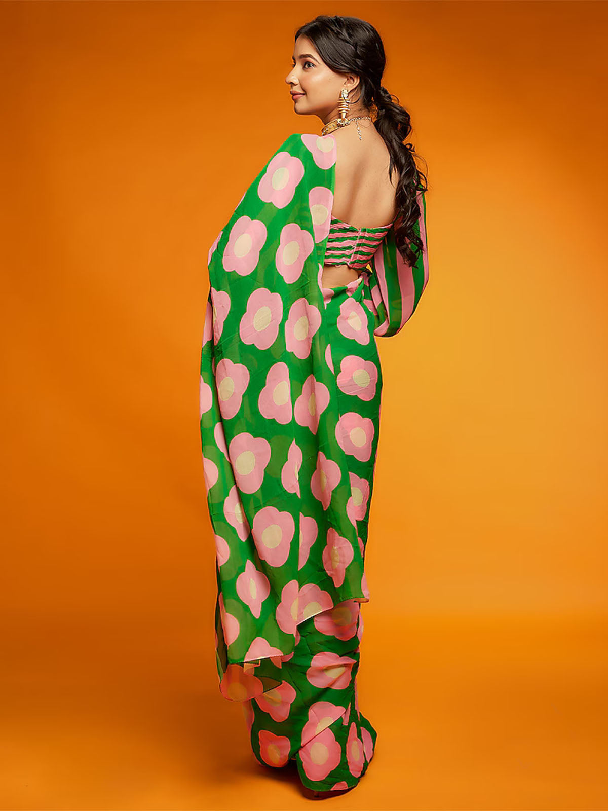 Re-Define Your Style In The Beautiful Printed Saree With A Printed Matching Blouse Pieces. Match It With A Clutch And A Pair Of Heeled Sandals And You Are Ready To Slay.
