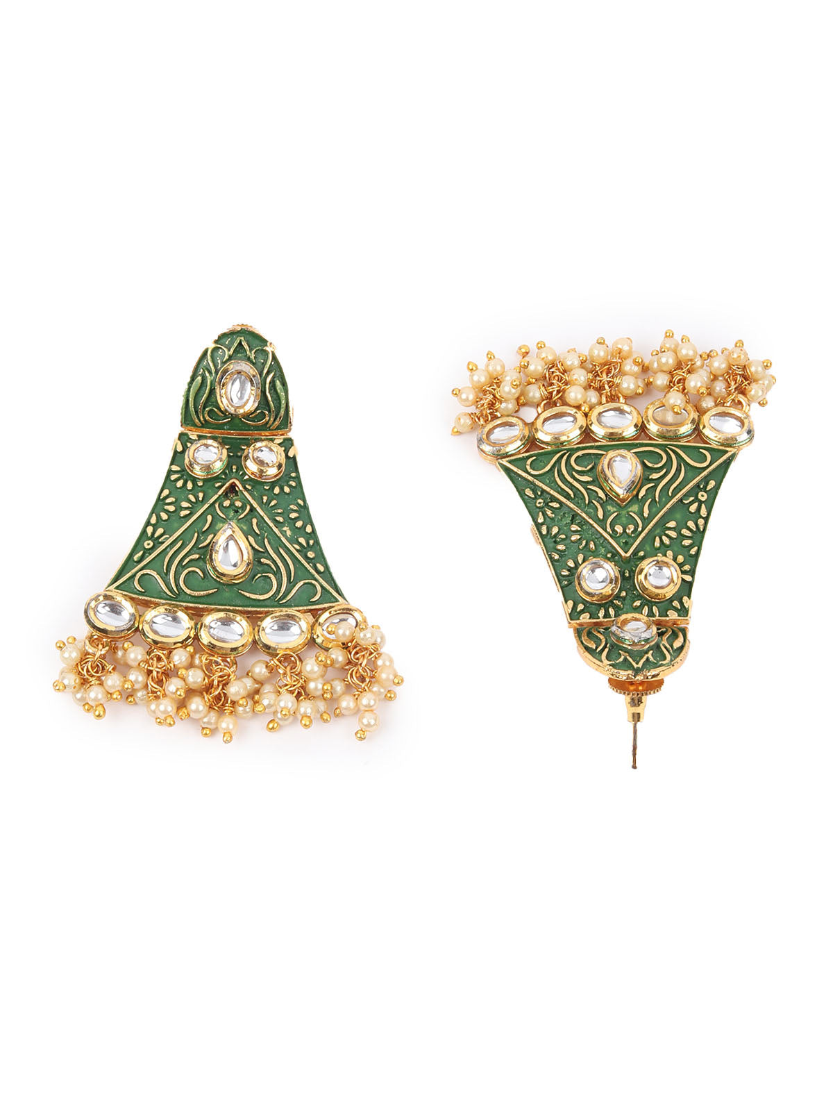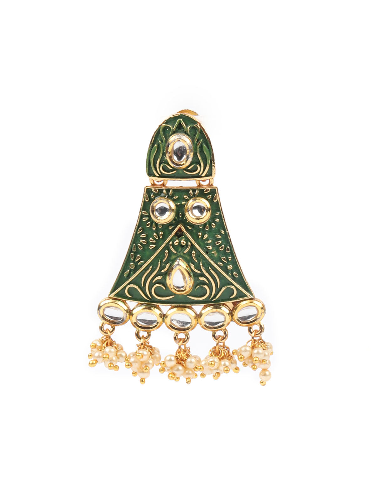 The designer earrings are a show-stopper. Wear this versatile piece of jewelry with Indian and Indo-Western dresses to add some panache to your dress.