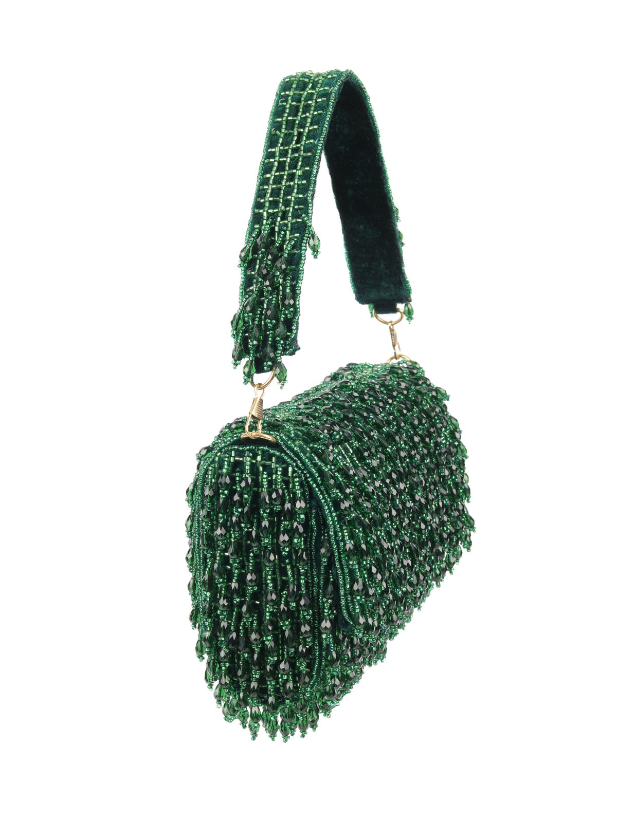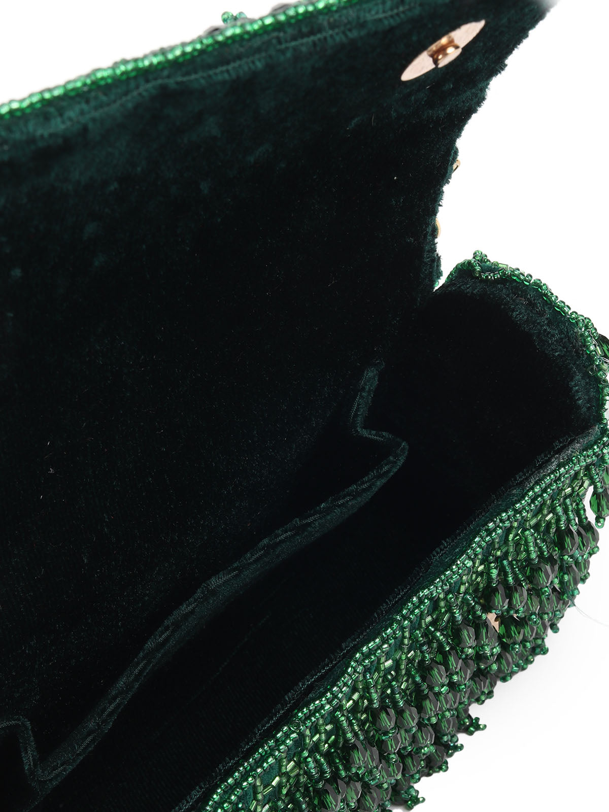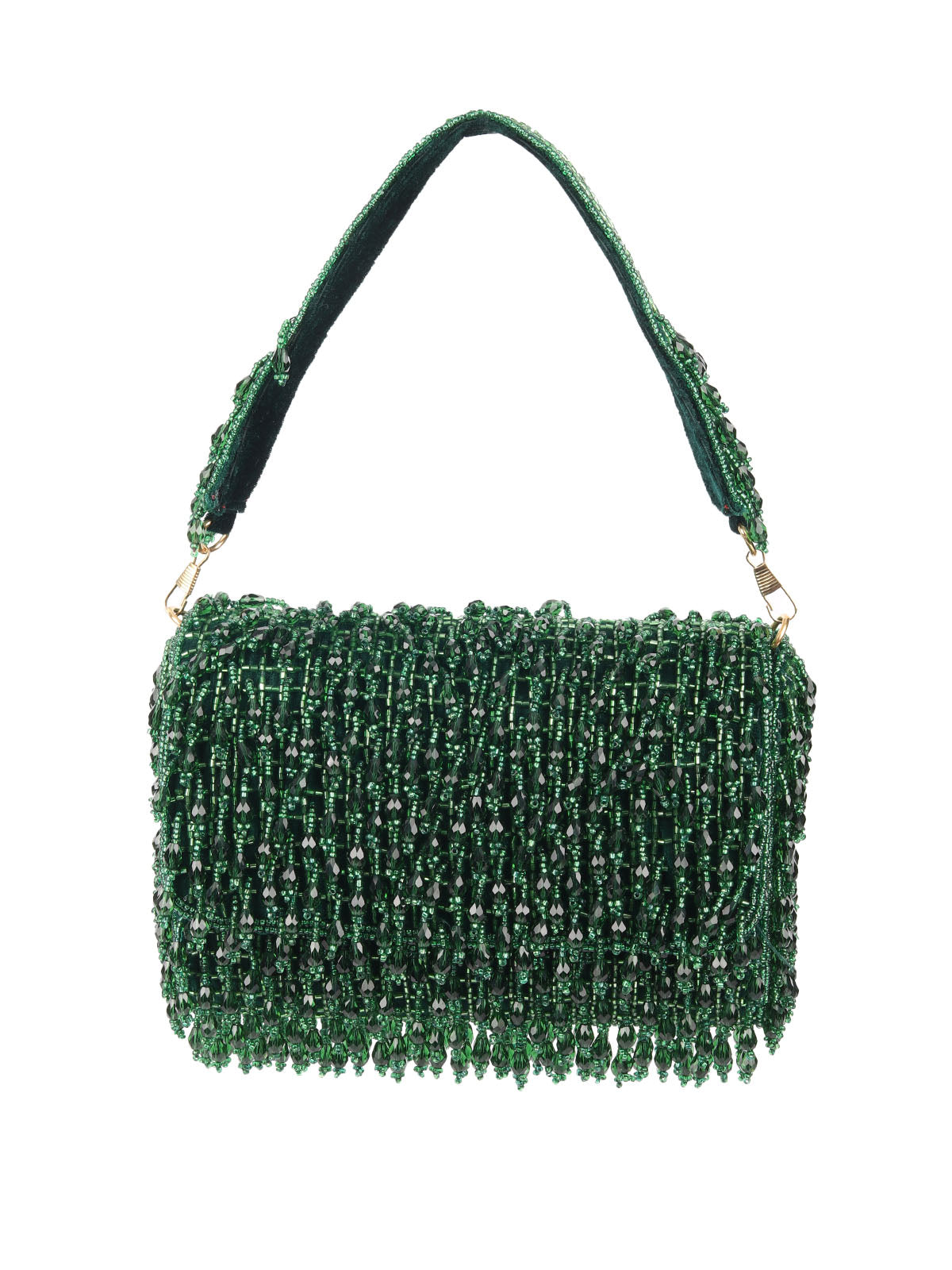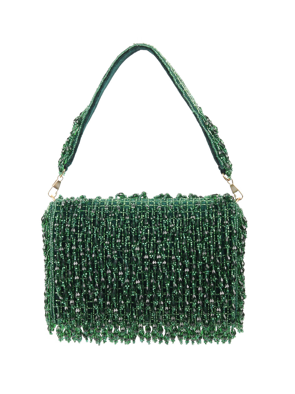 A stunning green partywear handbag, exquisitely crafted with intricate pure cutdana work and elegant tassels. A perfect blend of luxury and charm for any special occasion!