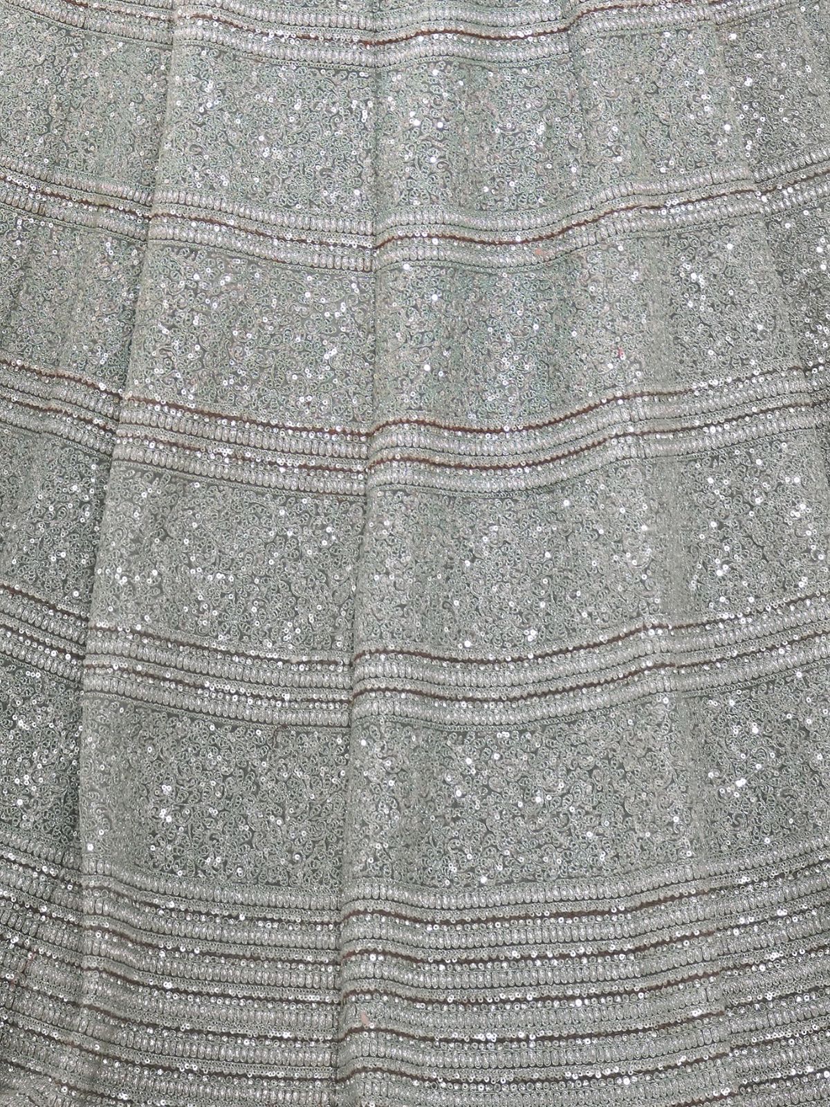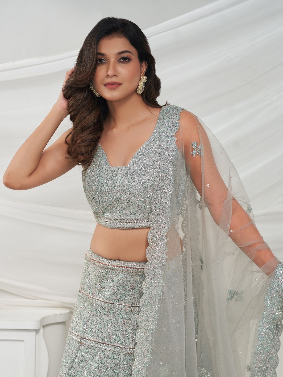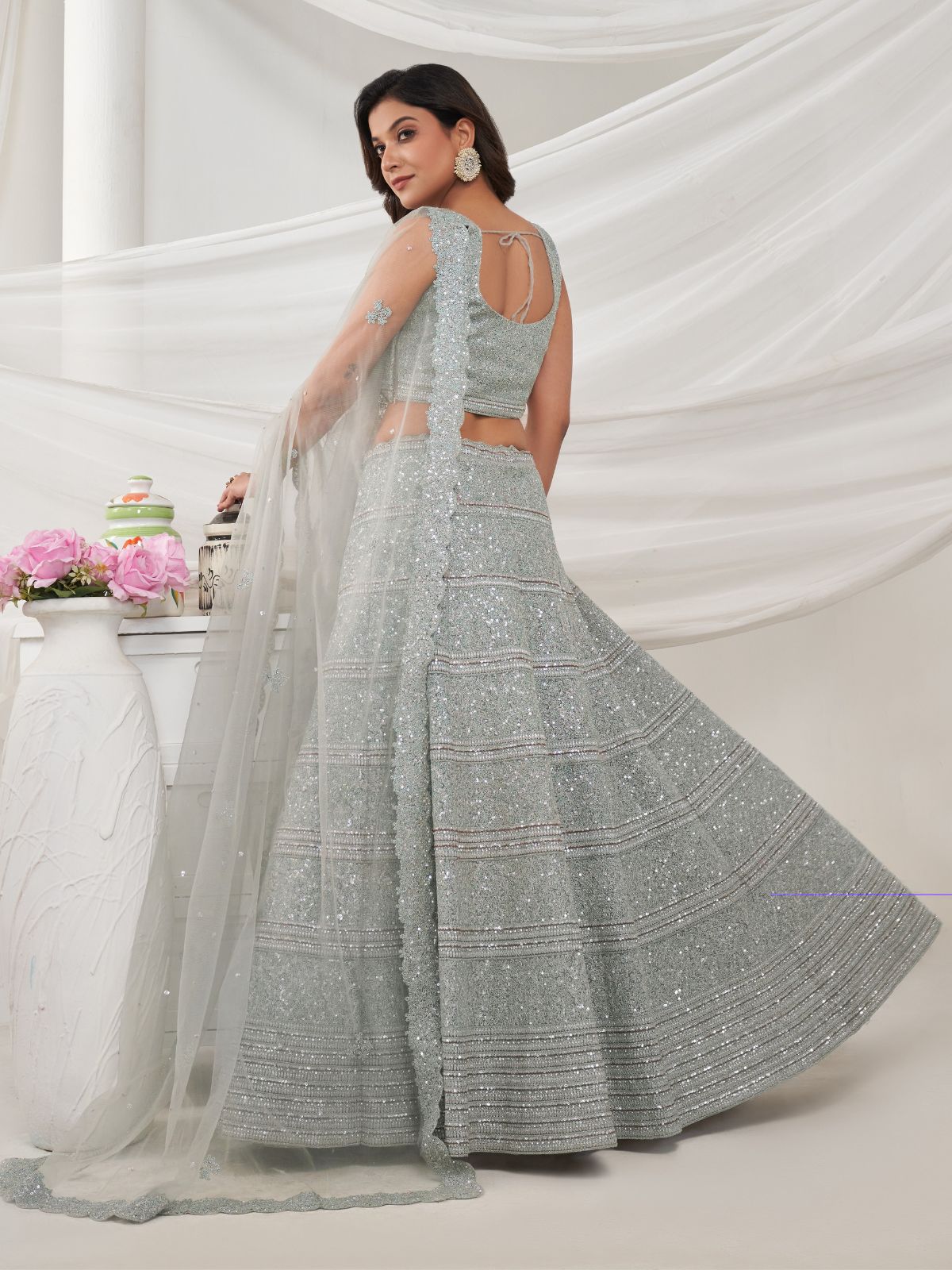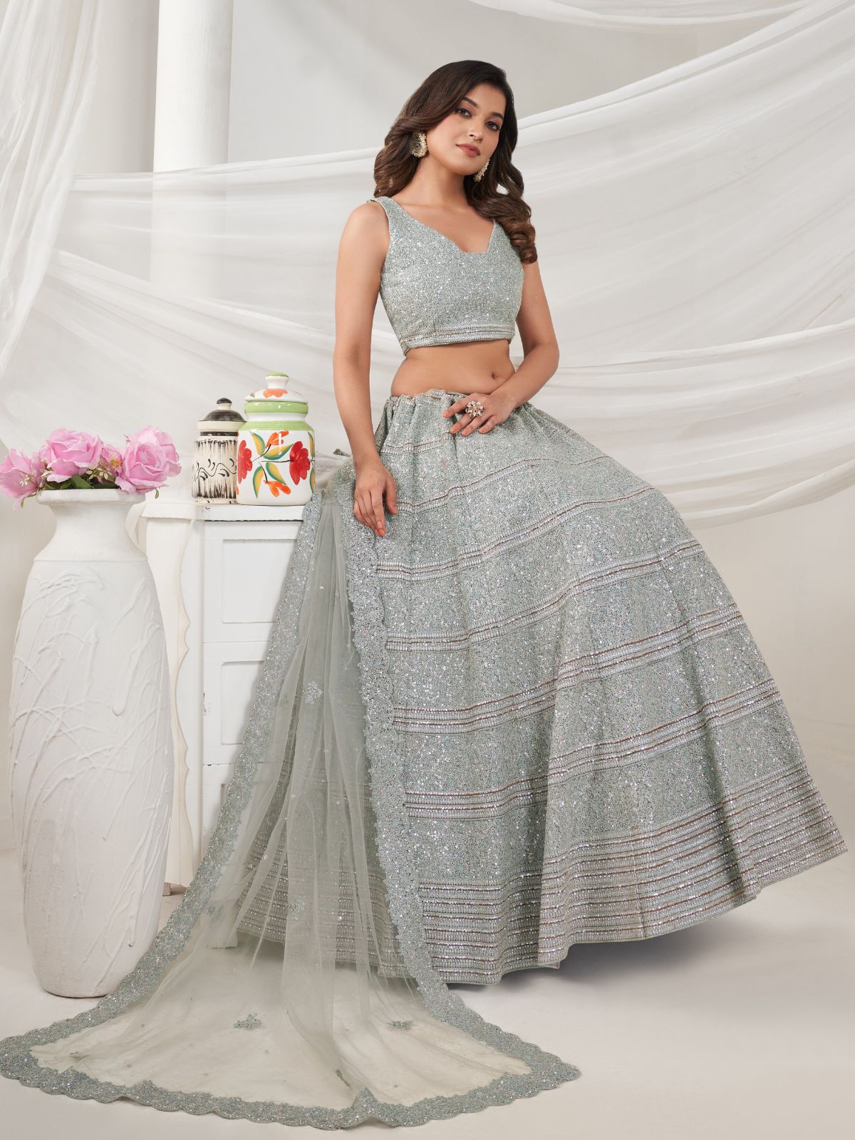 A Grey lehenga with horizontal sequin and thread work embellished with shimmering stones. The embroidered net dupatta and blouse, accentuated with stone work on the border.