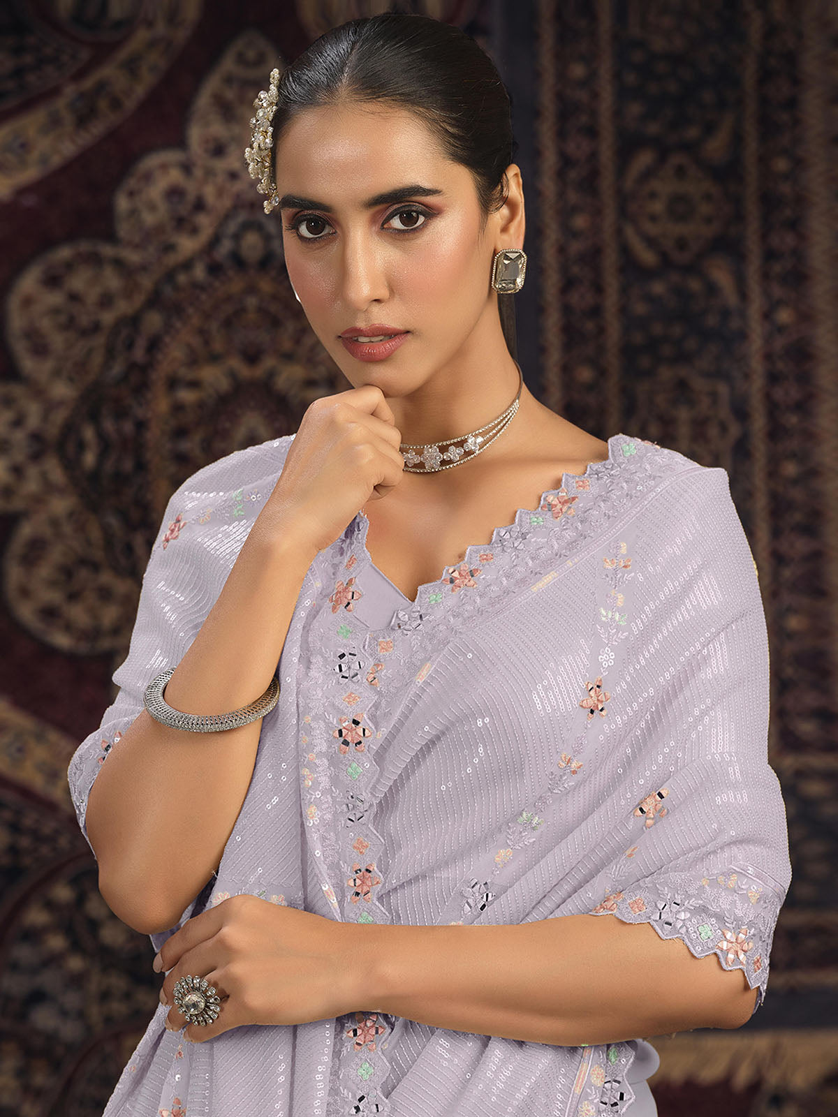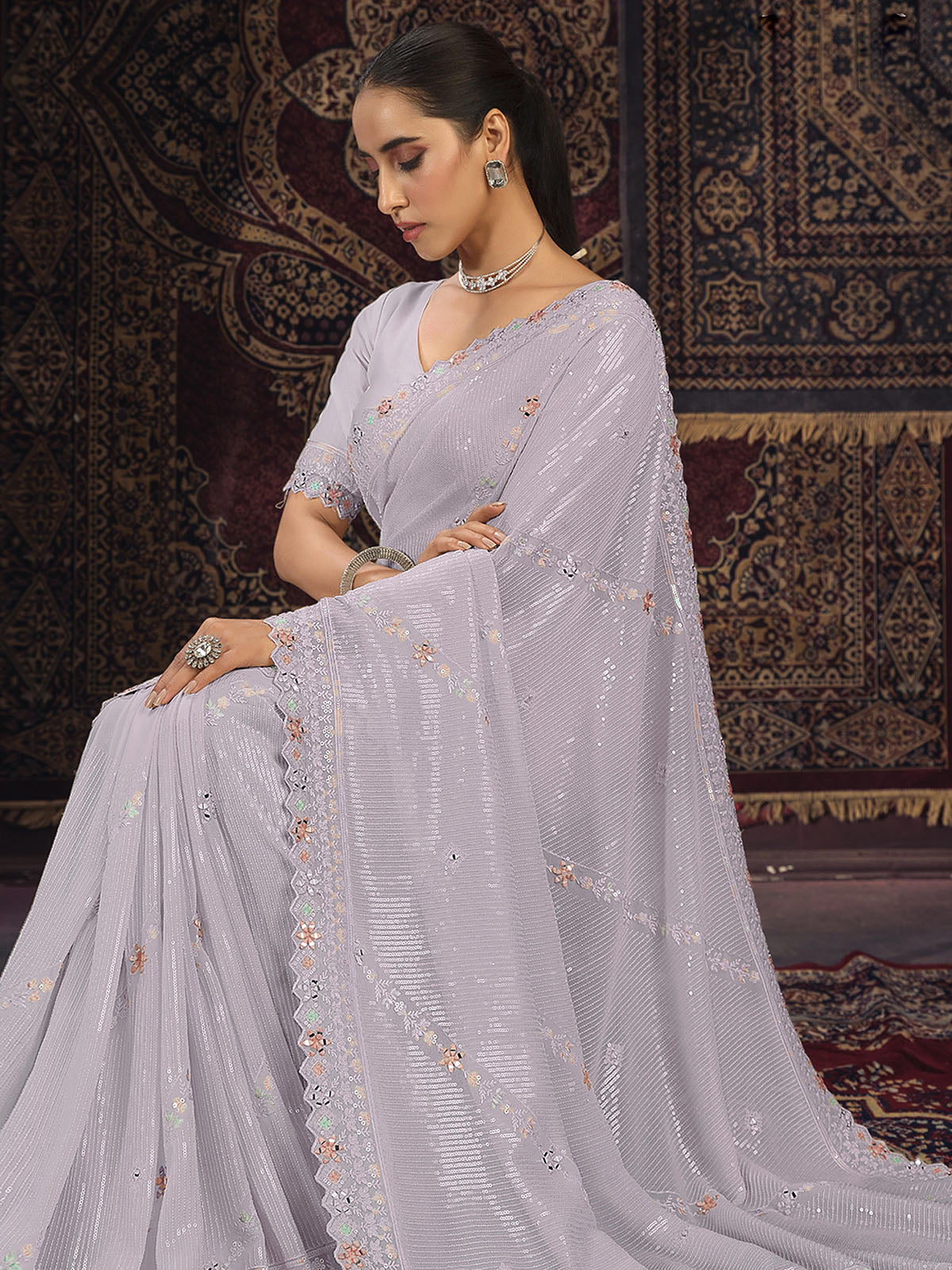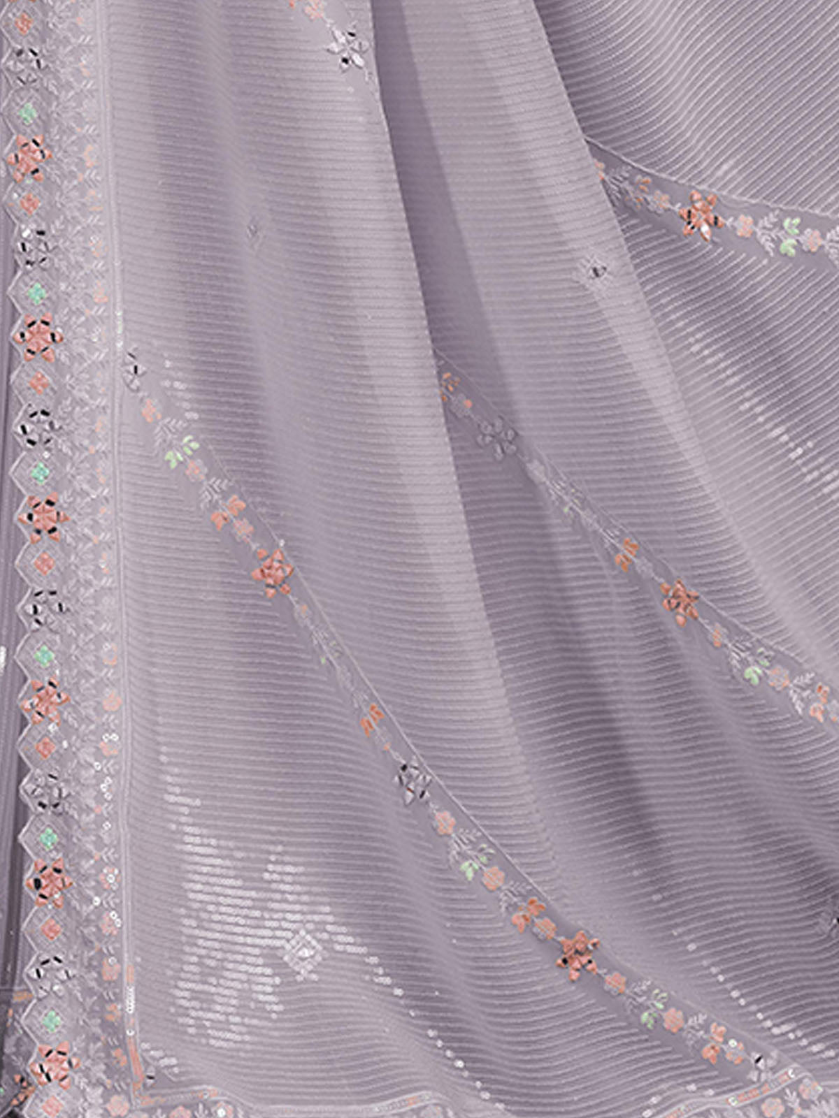 Re-define your style in the beautifully Sequins, Thread, Mirror saree with a matching blouse. Match it with a clutch and a pair of heeled sandals and you are ready to slay.