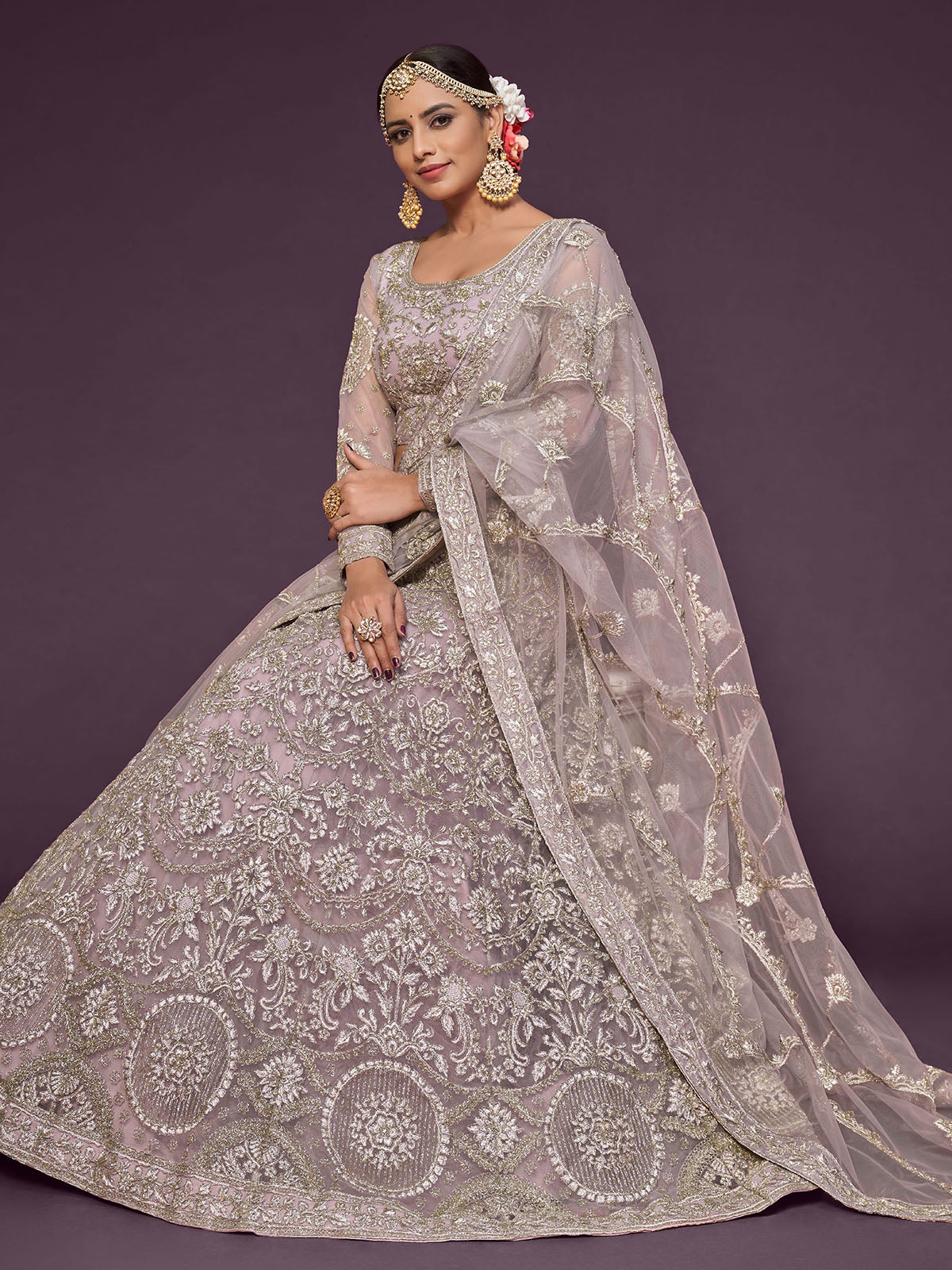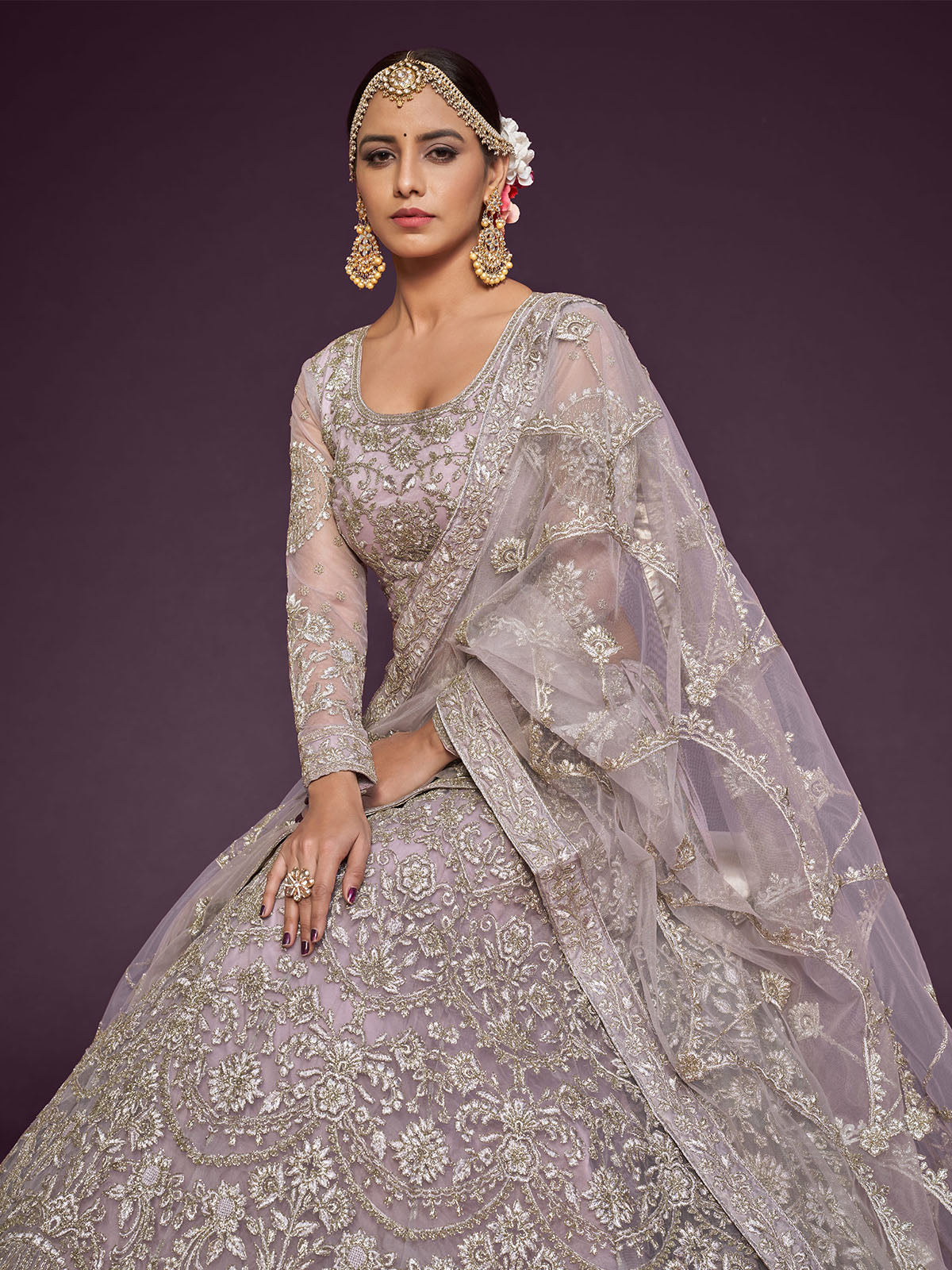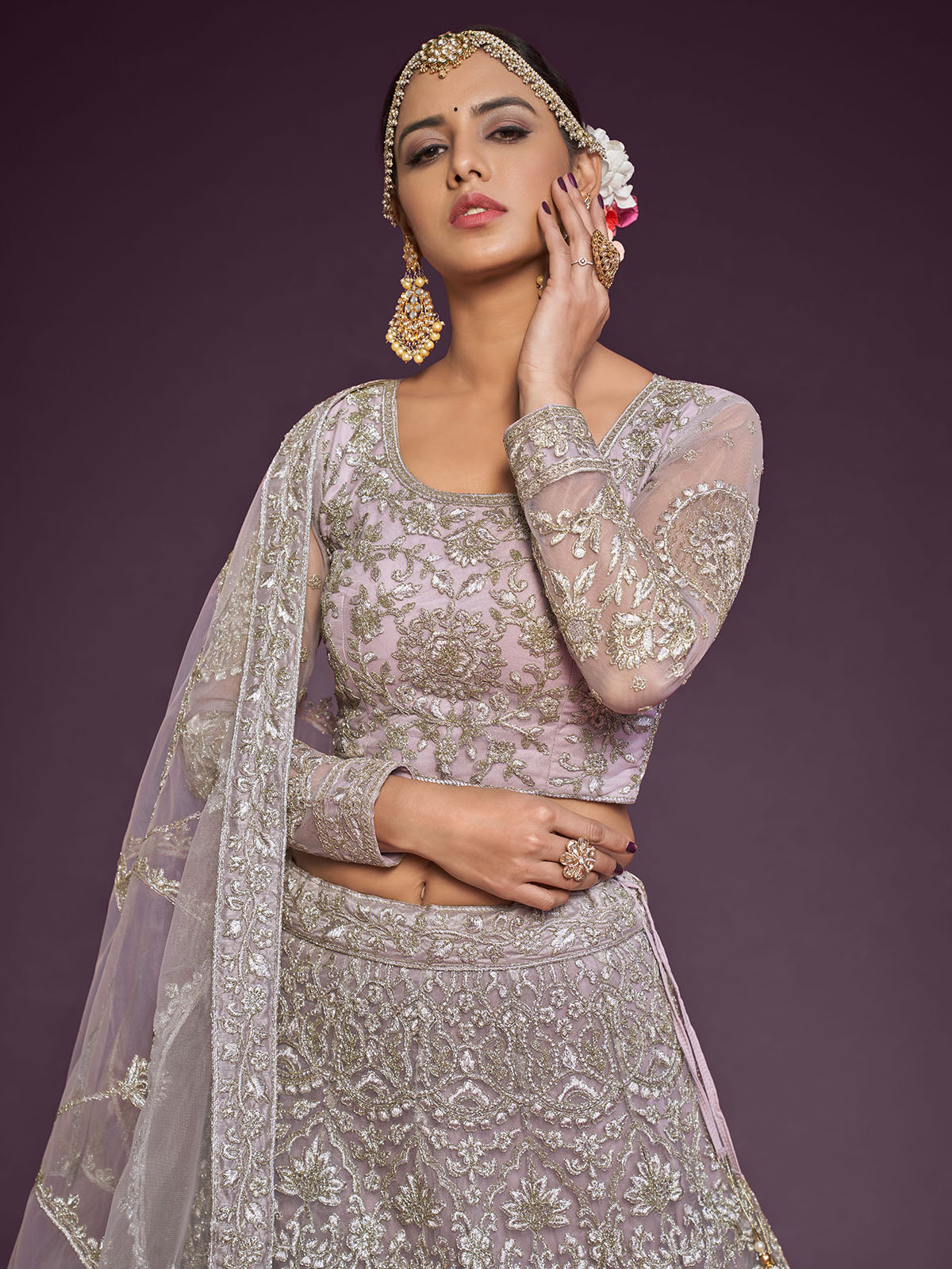 Rajwada Lavender Soft Net Embellished Semi Stitched Lehenga With Unstitched Blouse For Women