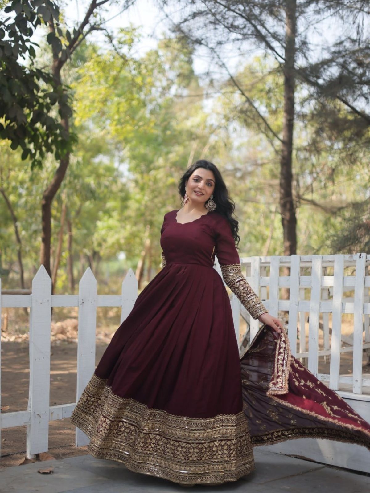 Rajwada Maroon Georgette Embroidered Stitched Gown With Dupatta For Women