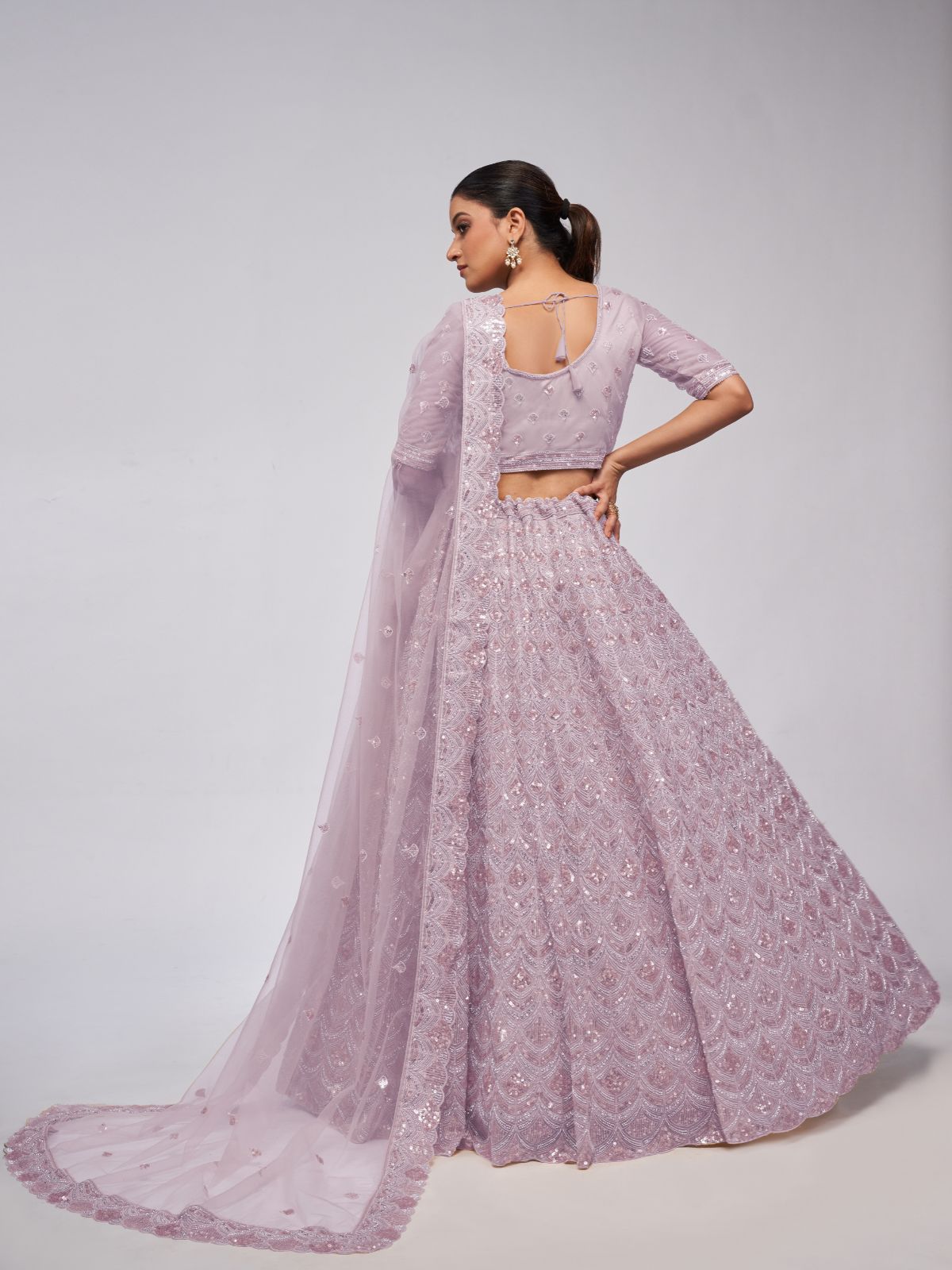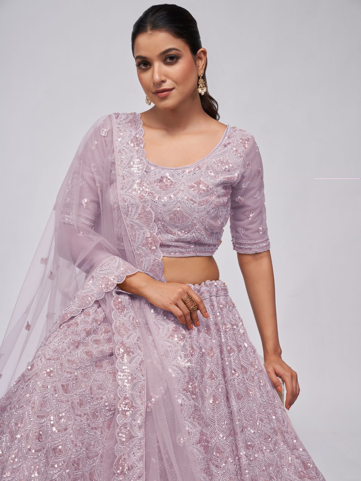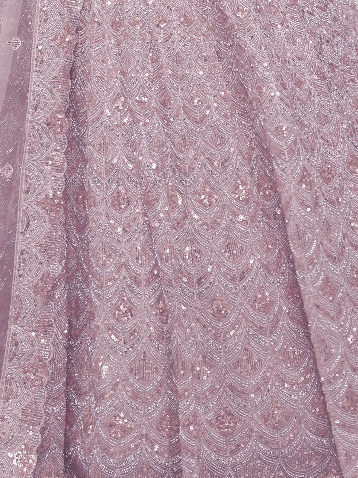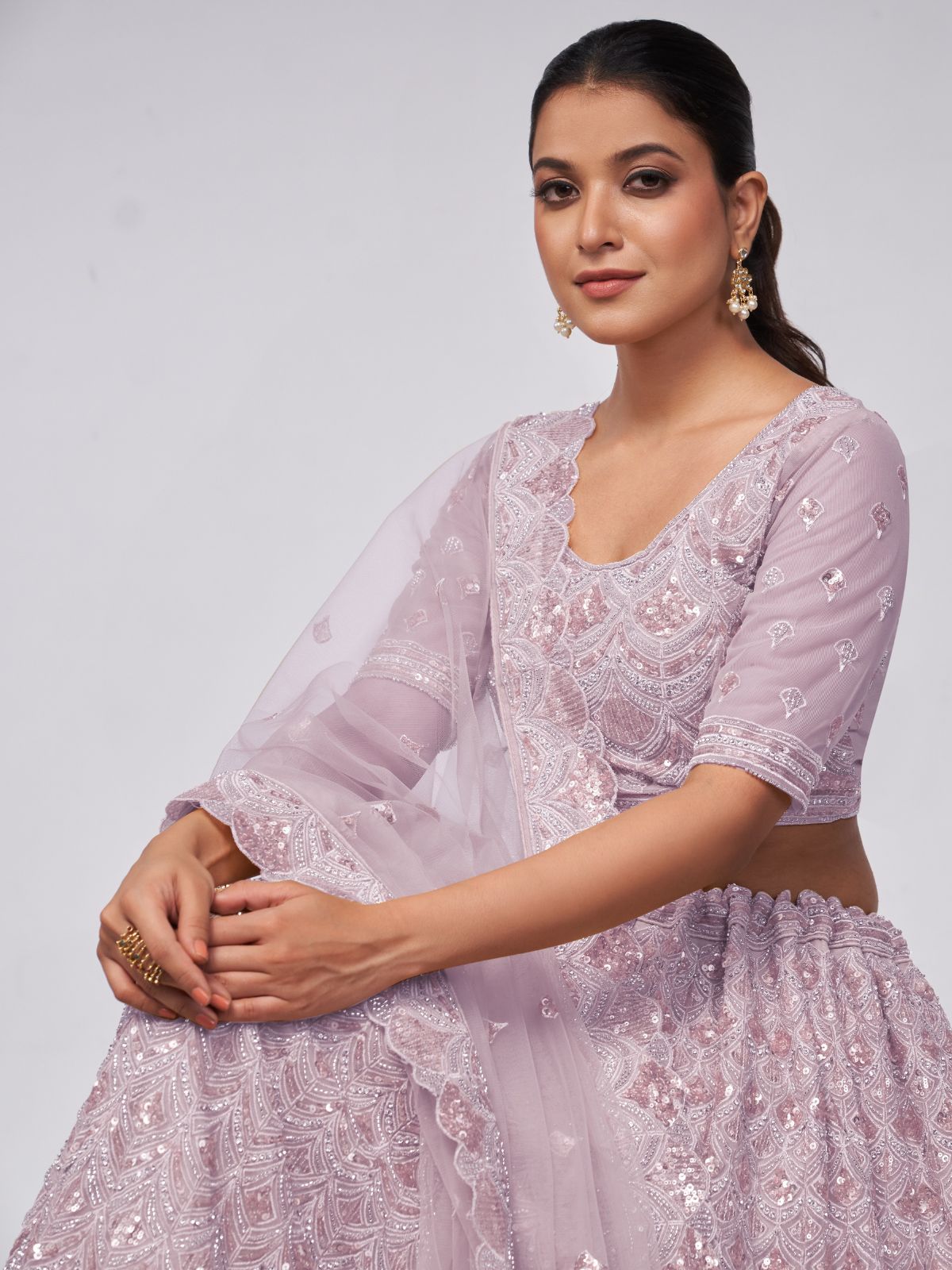 A Mauve lehenga adorned with a leaves pattern embellished with Ivory sequins, stones and cut dana work threaded into diamond and leaves patterns, the dazzling outfit is perfect for the contemporary bride. A complementing scoop neck blouse with a dori fastening at the back is paired with the skirt. The ensemble is rounded off with a matching sheer net dupatta. Pair with nude block heels.