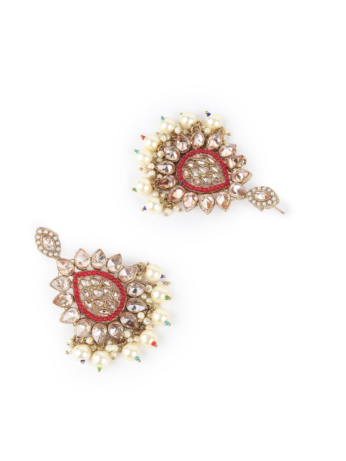This gorgeous set of neck piece with stud earrings is a great accompaniment to your wedding or party outfit. The necklace has multi material decoration on it. Matching drop earrings and mangteeka attached. This is must have in your collection.