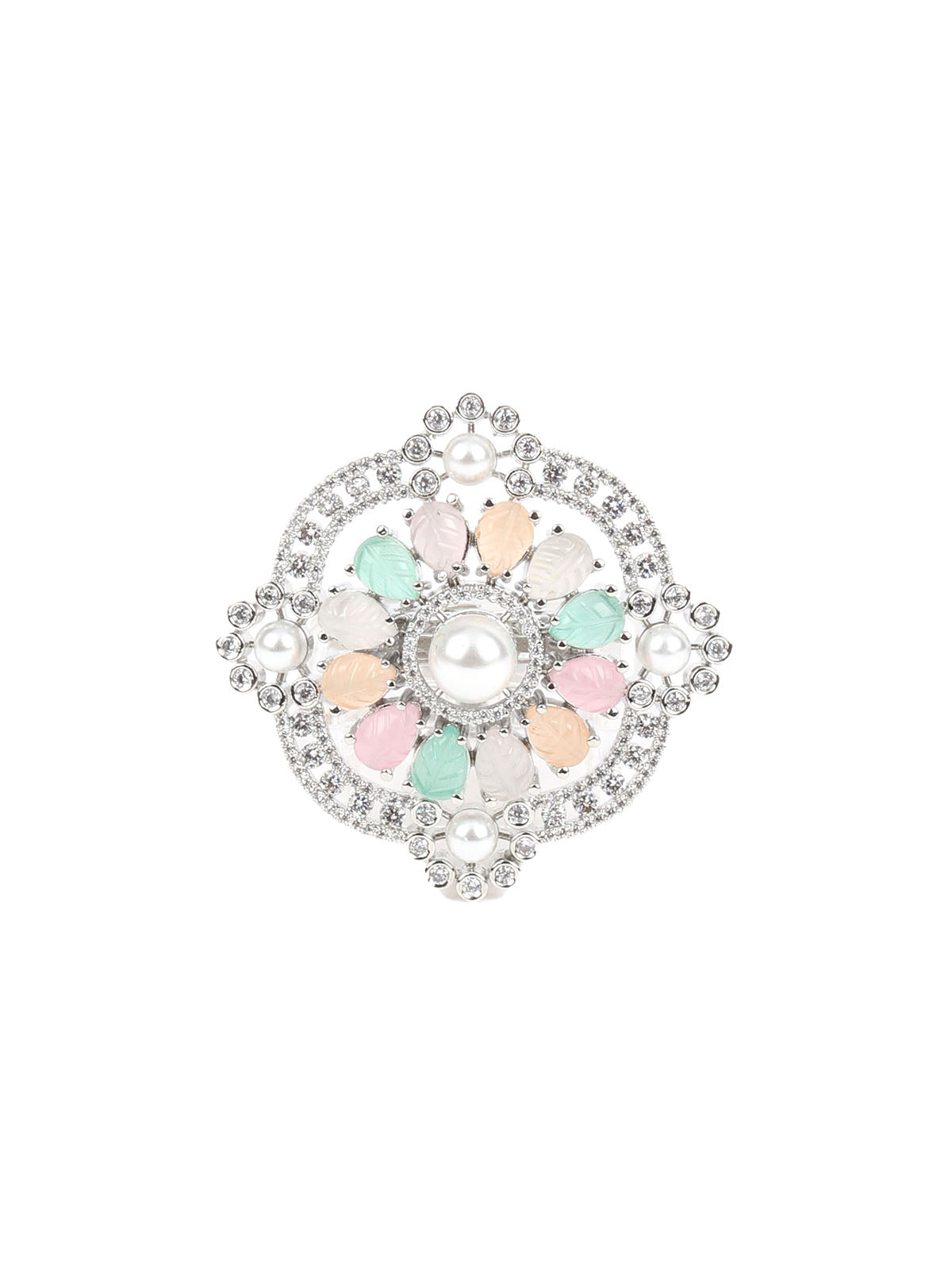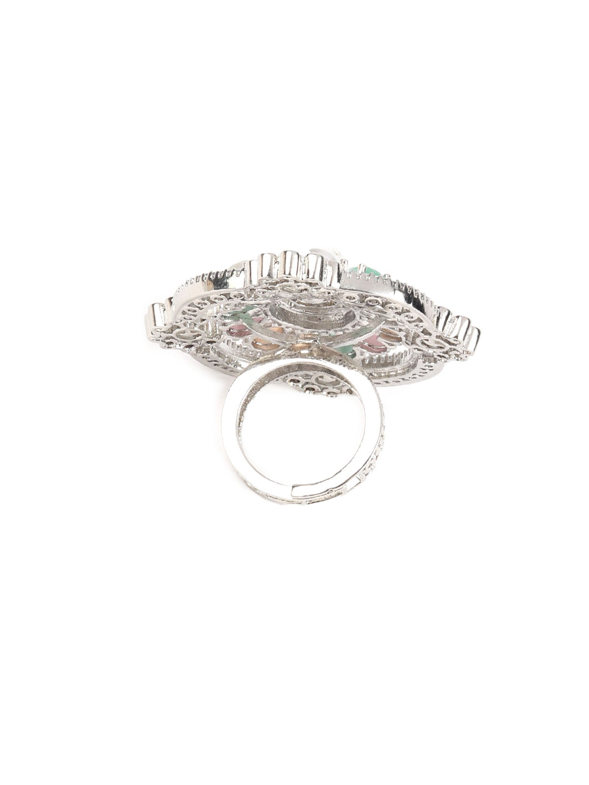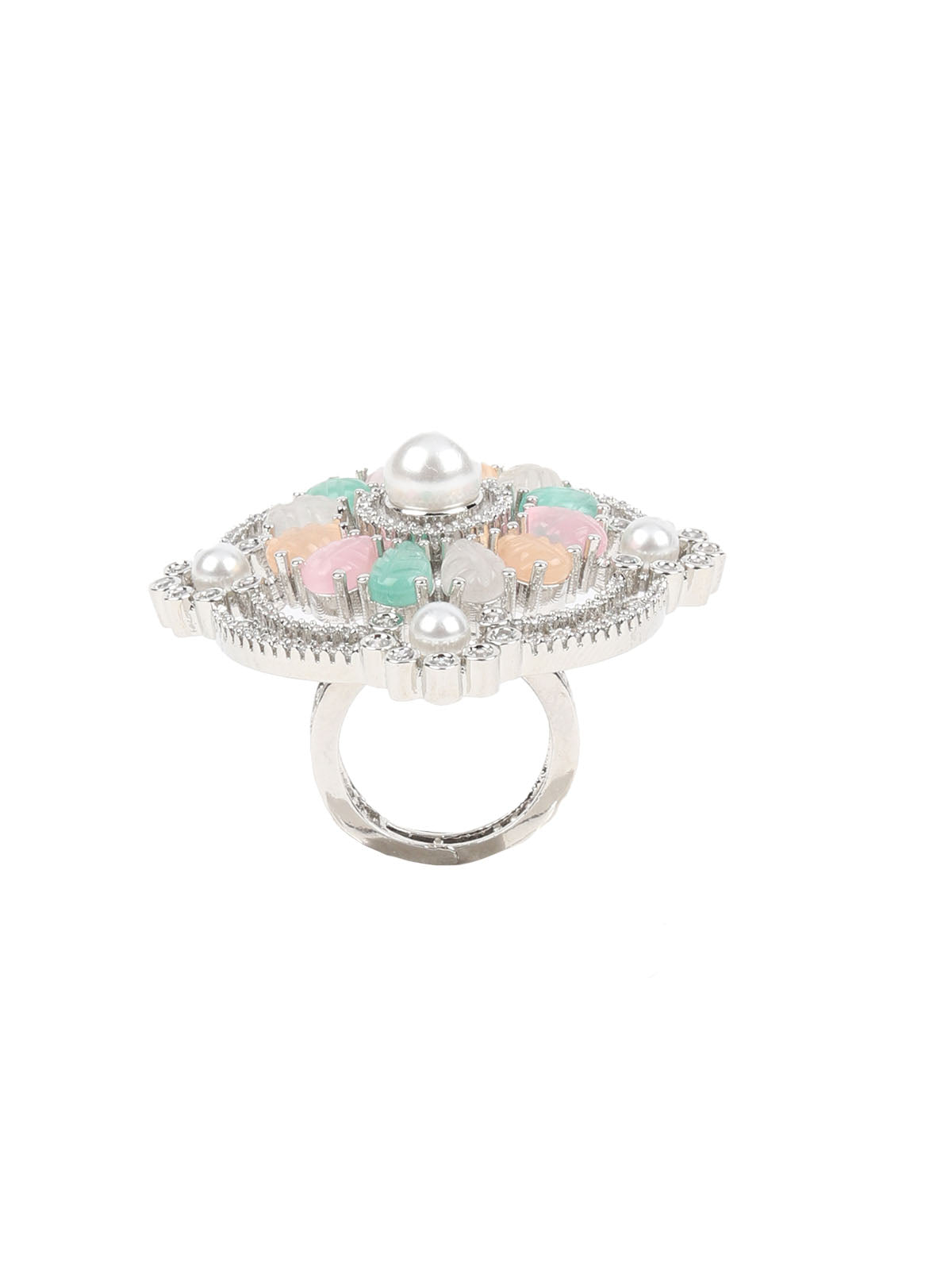 Silver-Plated Adjustable Finger Ring, Has Multicolor Stone-Studded And Pearls Details.