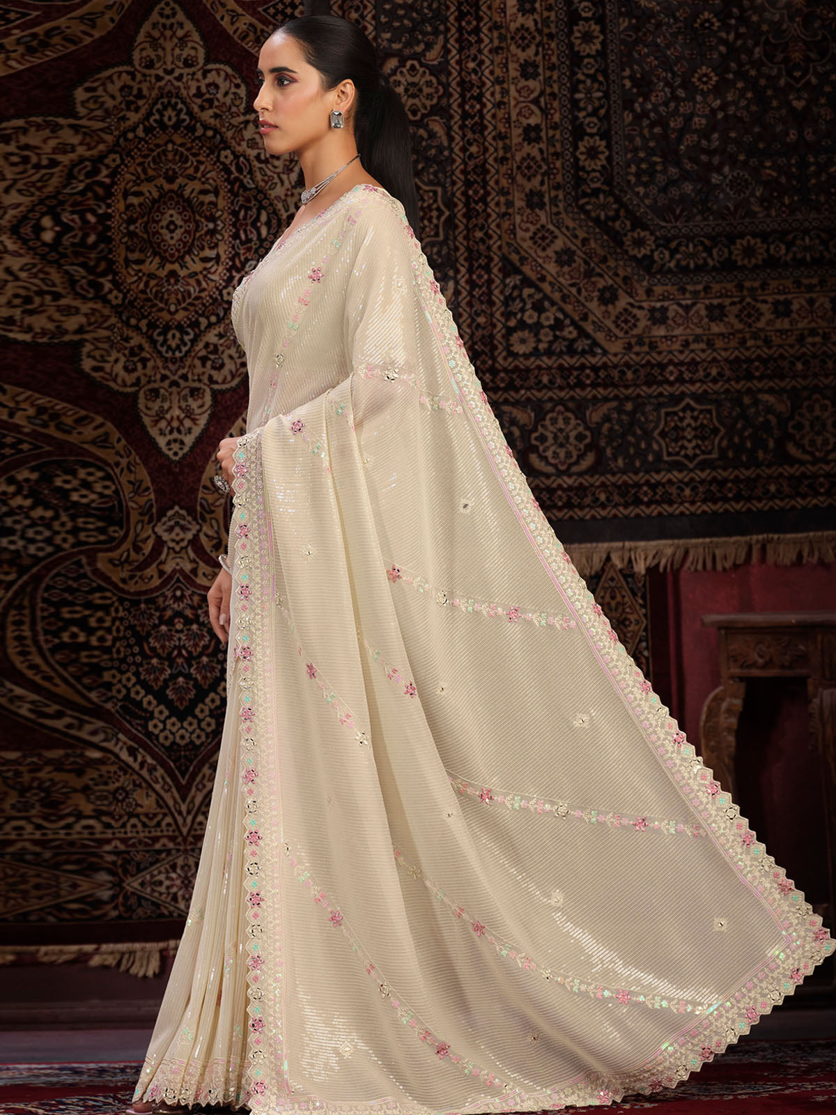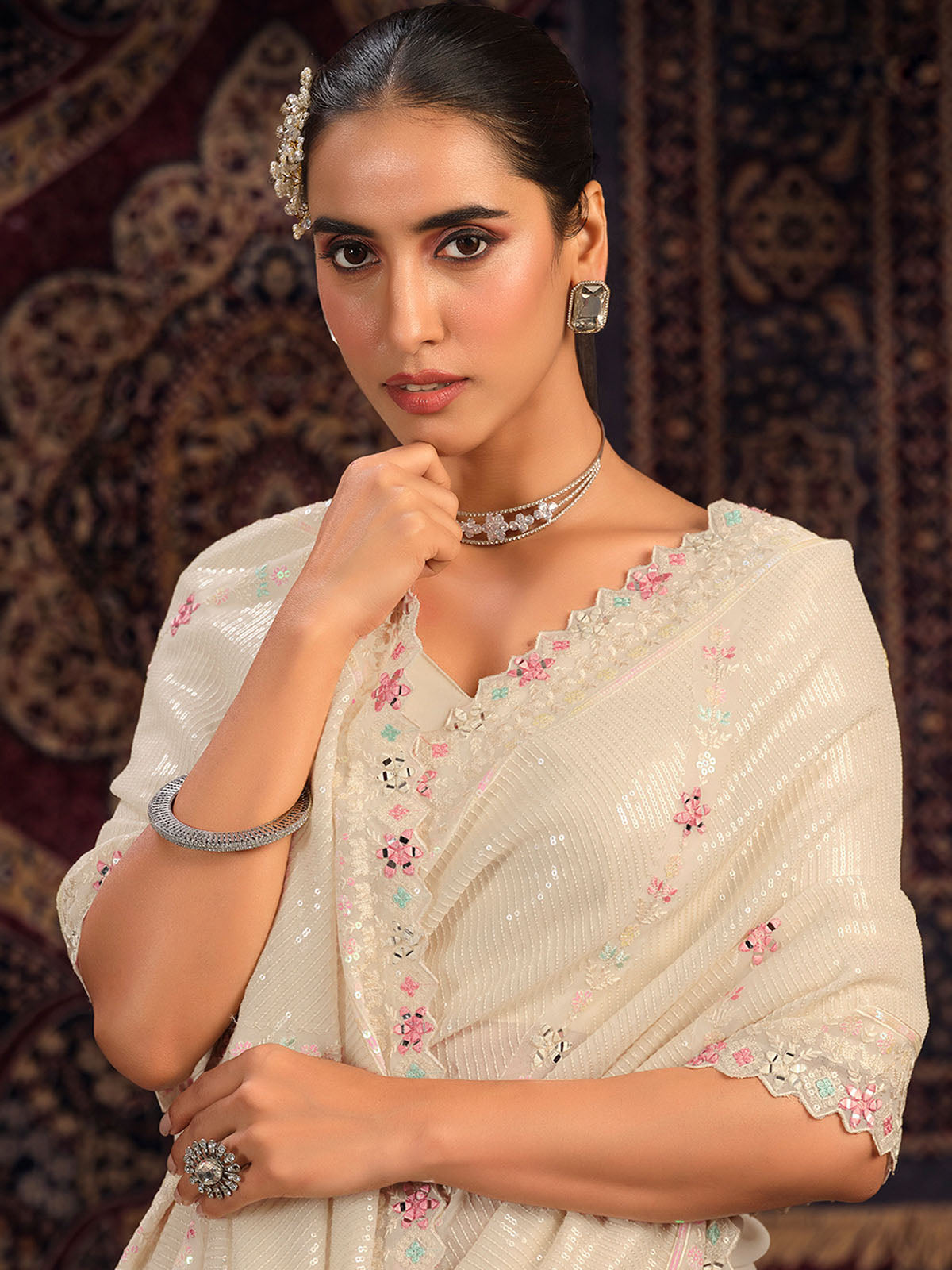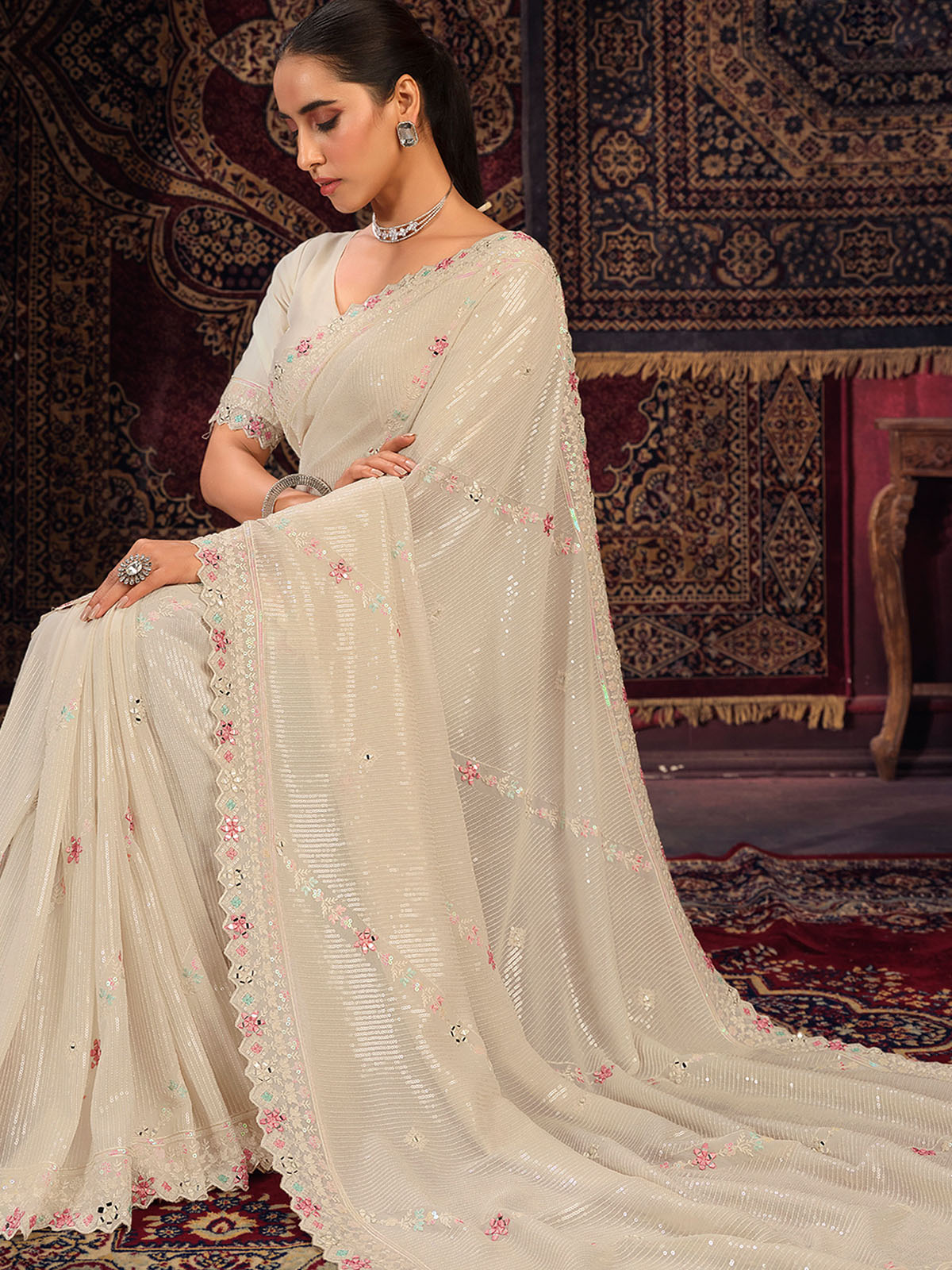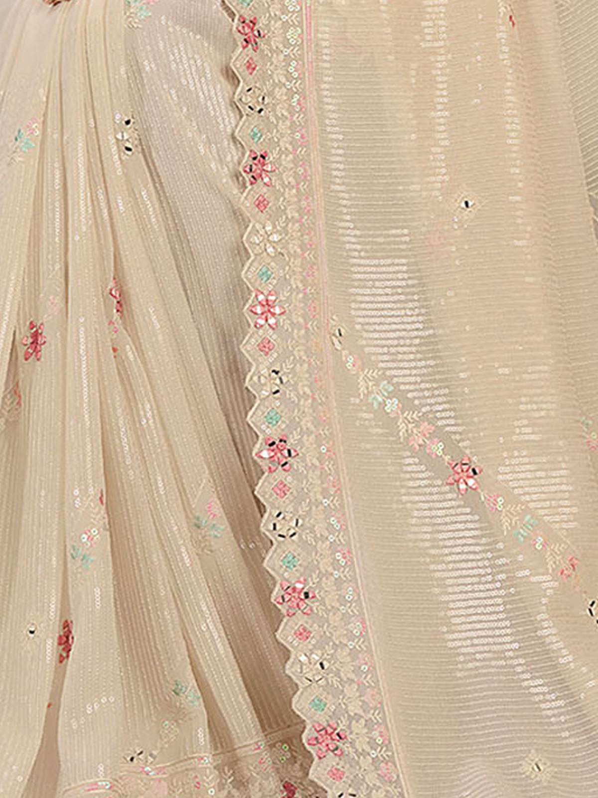 Re-define your style in the beautifully Mirror, Thread, Sequins, saree with a matching blouse. Match it with a clutch and a pair of heeled sandals and you are ready to slay.