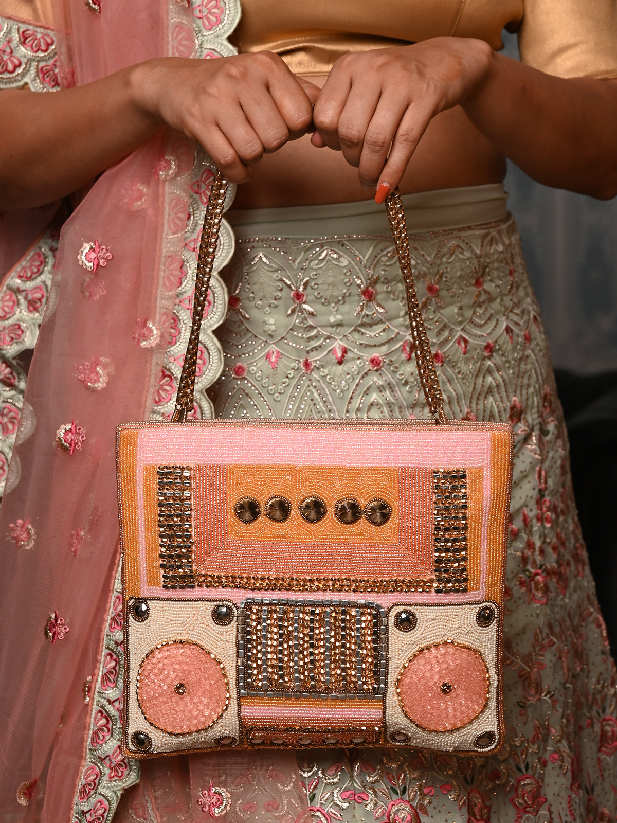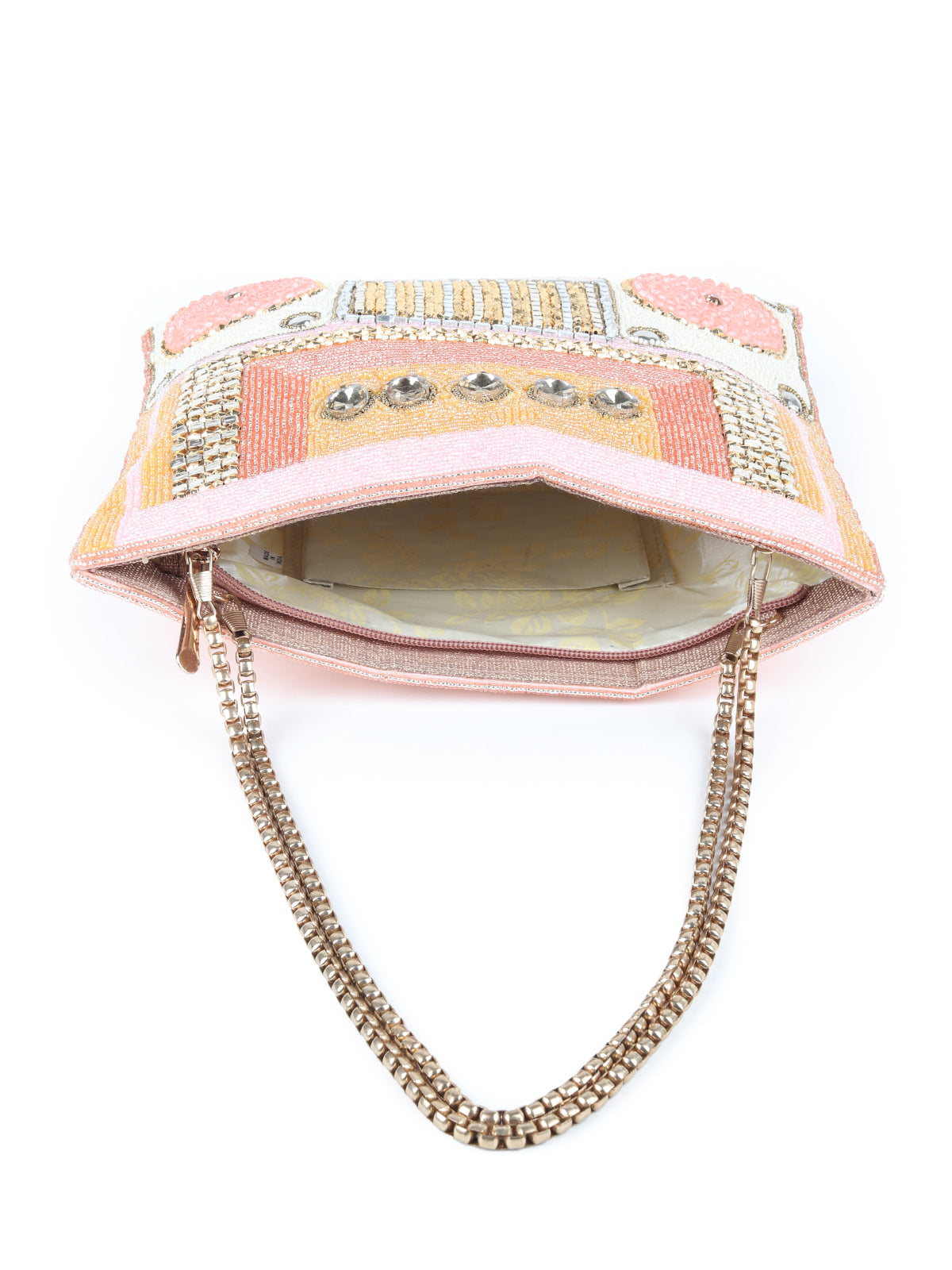 Make a chic statement with Rajwada's Peach Pink Beads Embroidered Hand Bag for Women. Elegant and versatile, it complements any outfit. Shop now and elevate your style