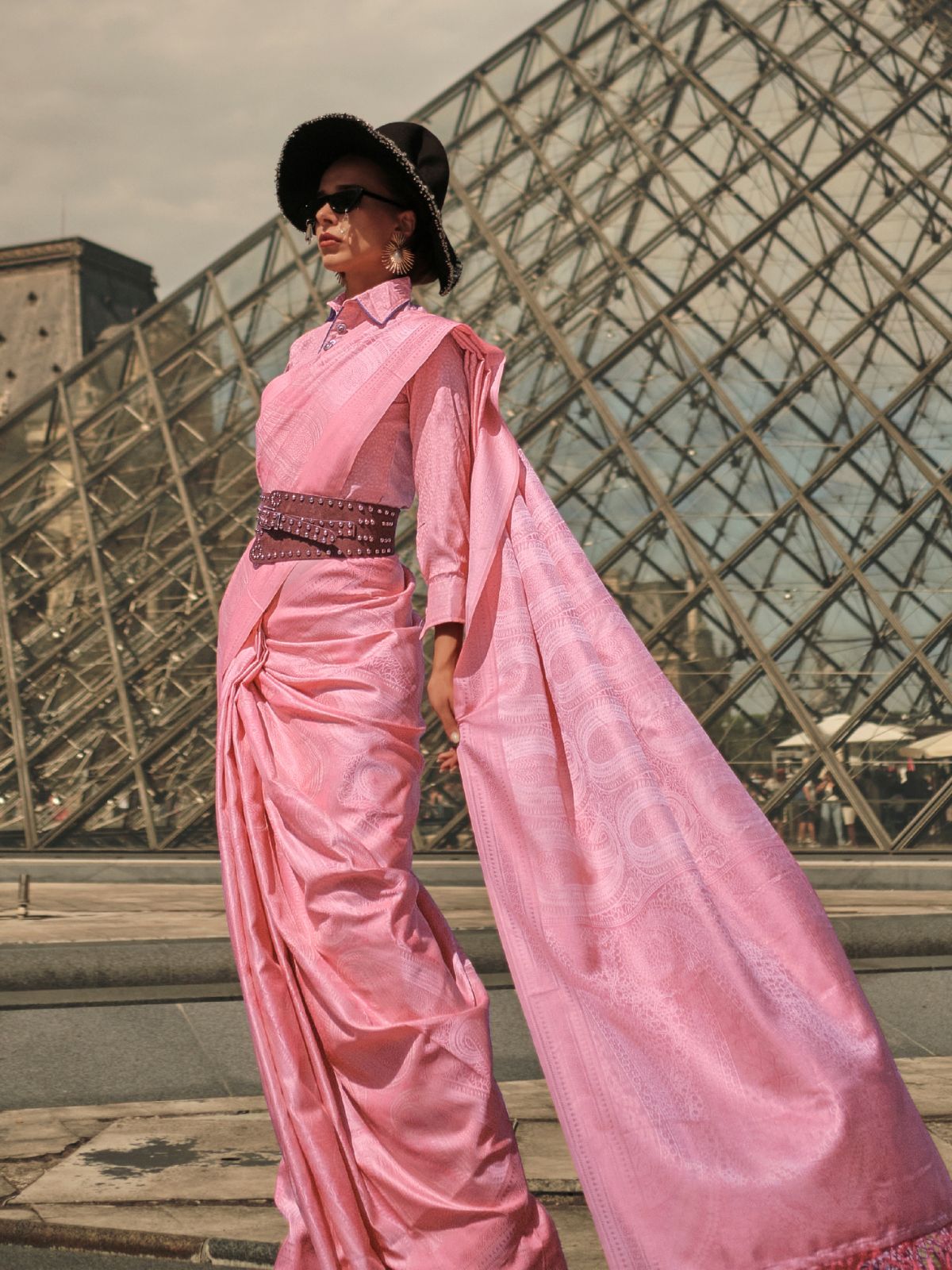 Rajwada Pink Silk Blend Woven Saree With Unstitched Blouse For Women