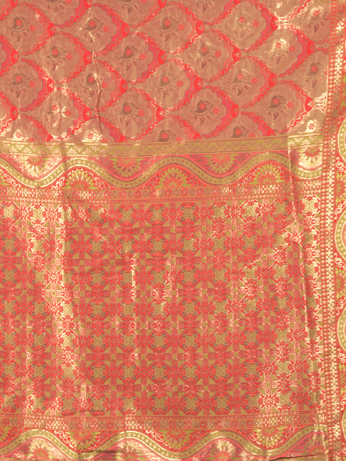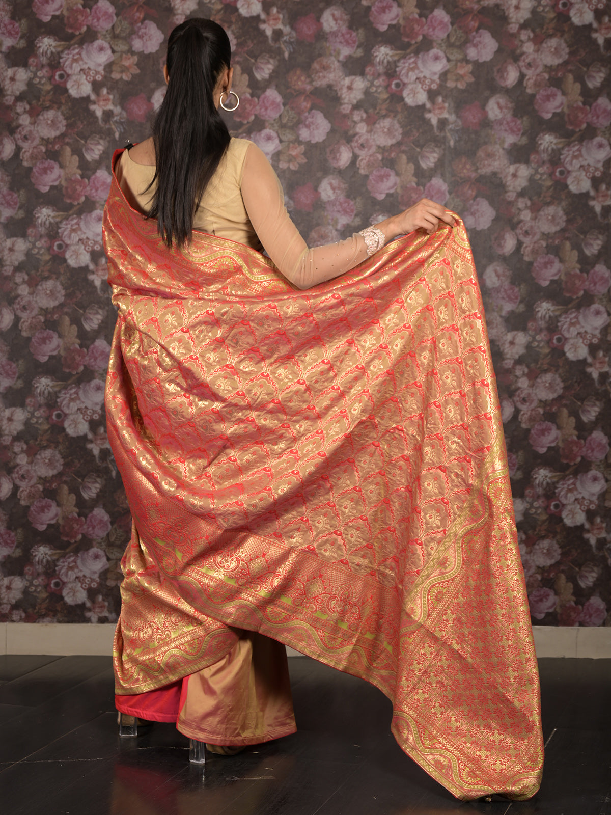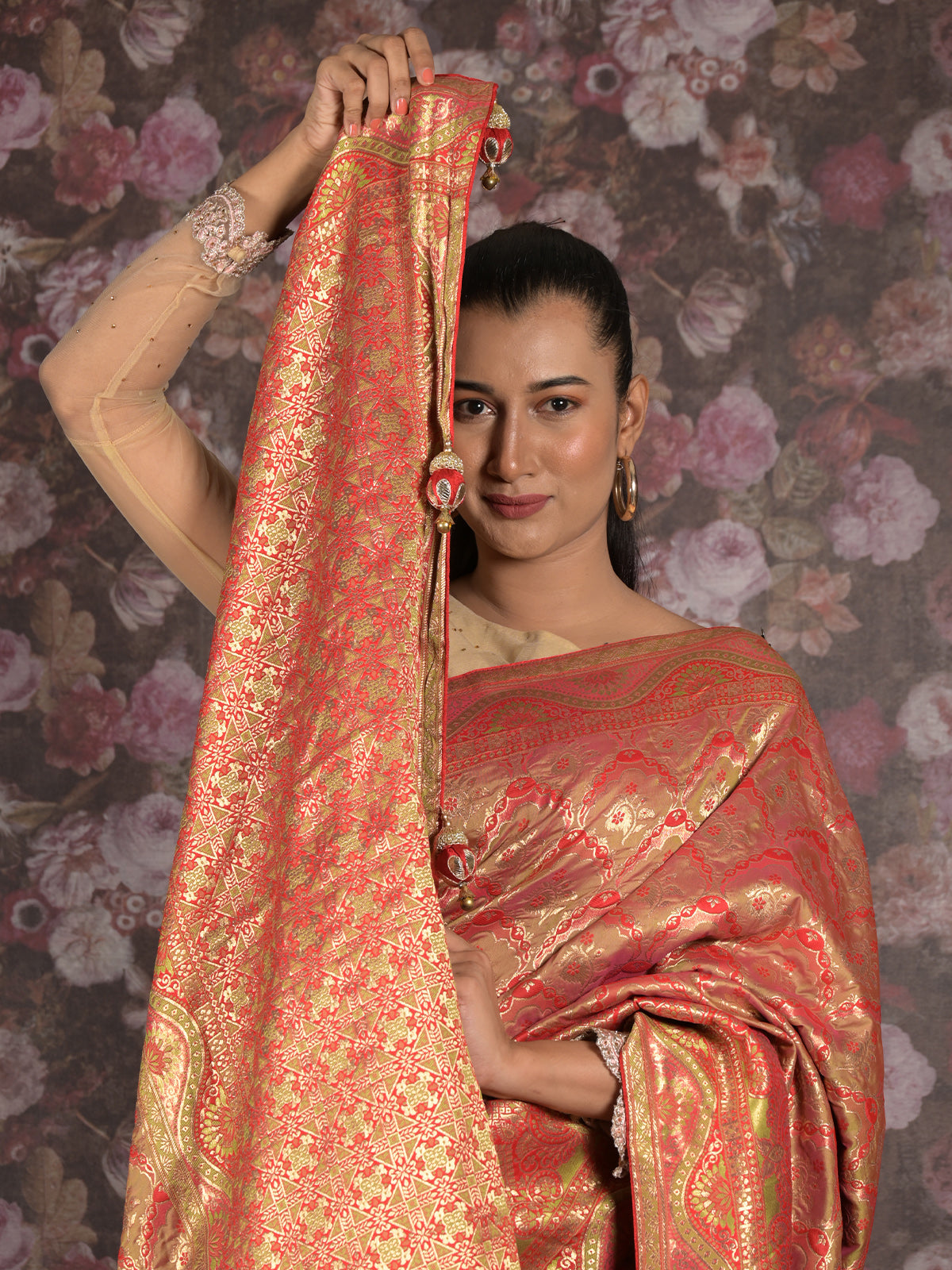Elevate your elegance with Rajwada's exquisite saree. This masterpiece of craftsmanship features intricate design that adds a touch of timeless beauty to your look. Made from premium fabric, this saree is perfect for special occasions, exuding luxury and charm with every drape. Shop now and step into the spotlight! This saree contains different blouse piece (please check the product description), blouse given in the picture is for only photography purpose.