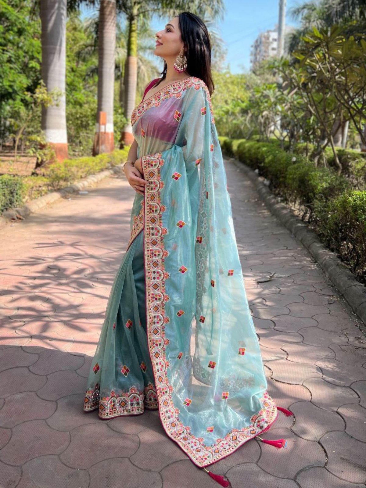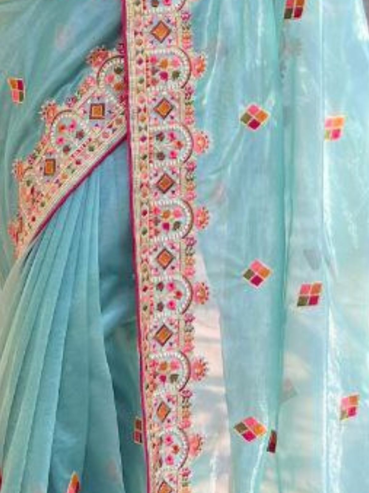 Re-define your style in the beautiful Heavy Embroidery Codding Multi Treads & Sequins Work Saree with a Matching blouse. Match it with a clutch and a pair of heeled sandals and you are ready to slay.