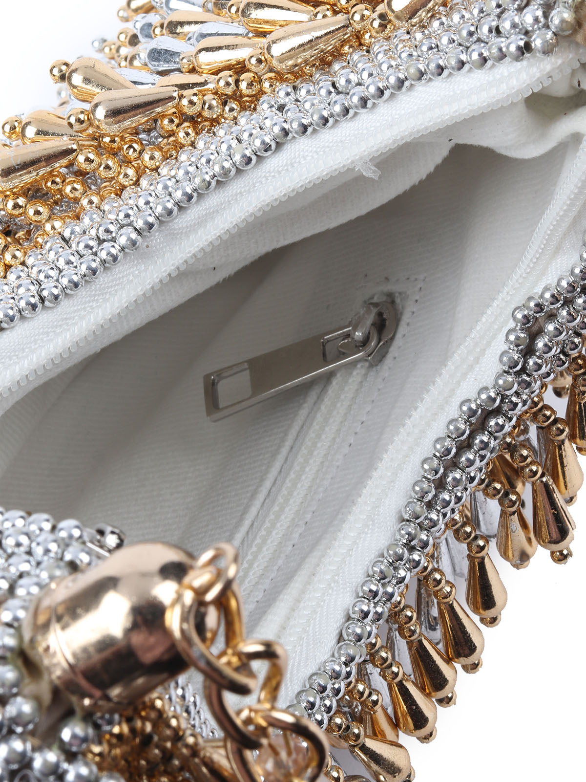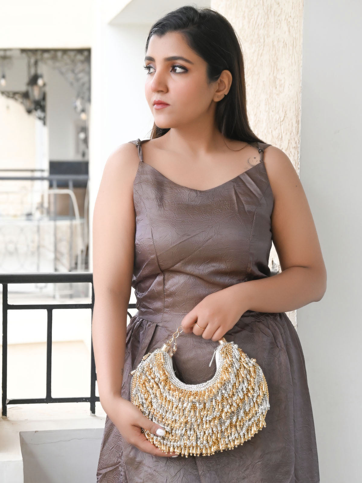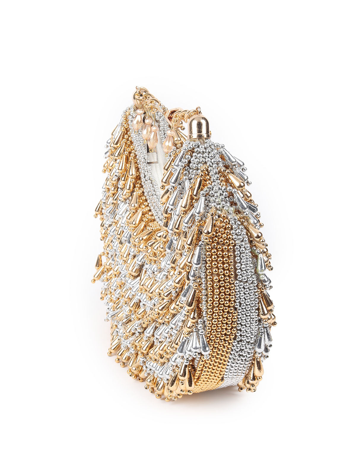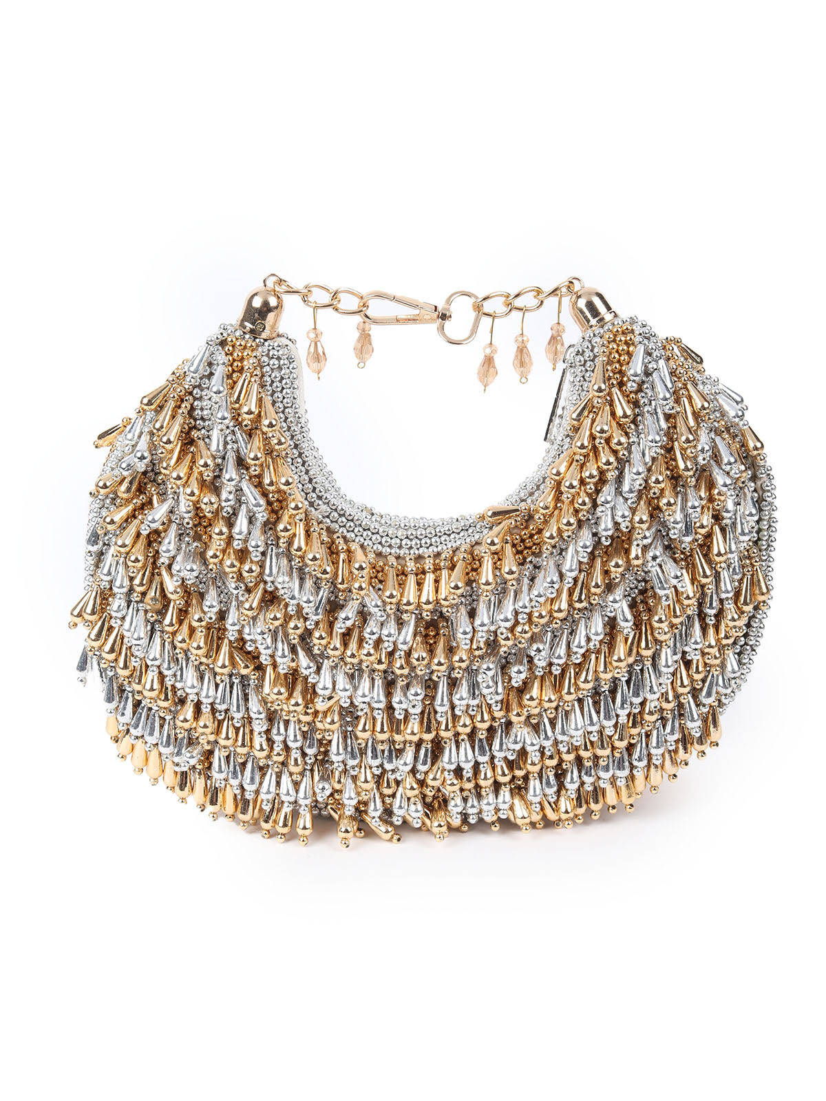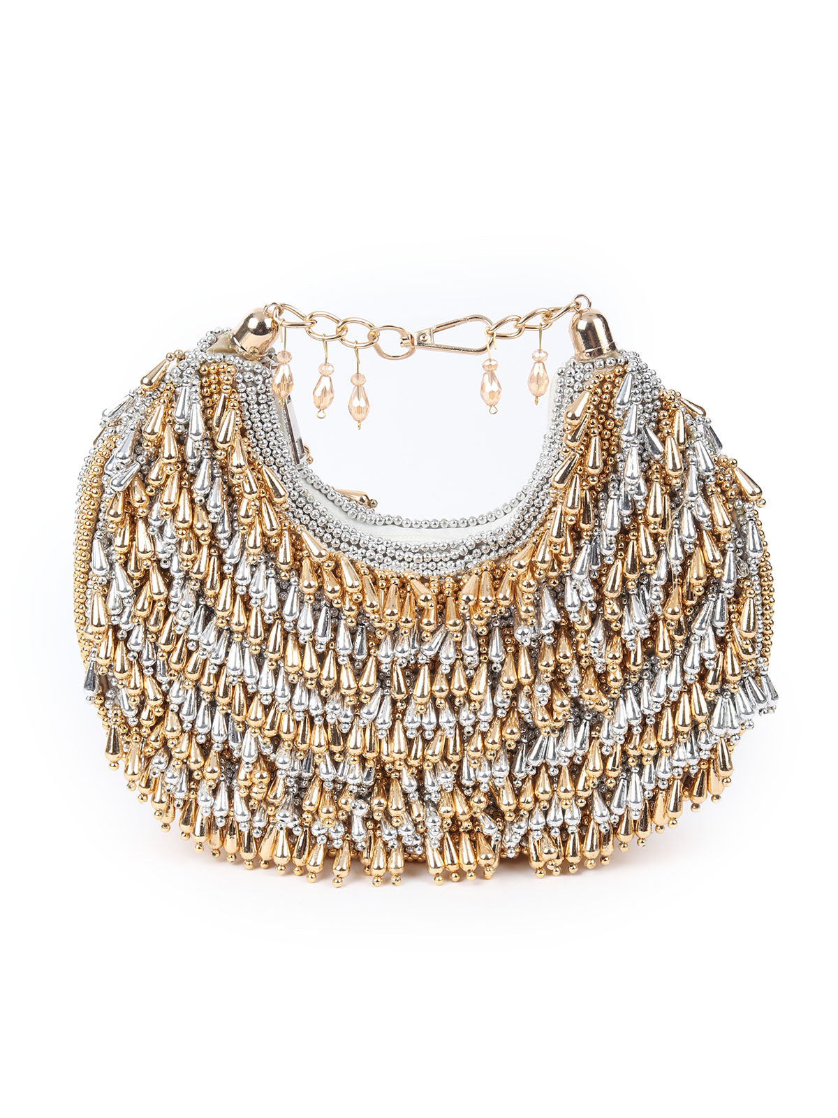 A stunning golden and silver handbag, beautifully adorned with exquisite log beads that cascade like tassels, adding a touch of elegance and charm to any ensemble. Perfect for both casual and formal occasions.