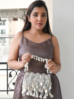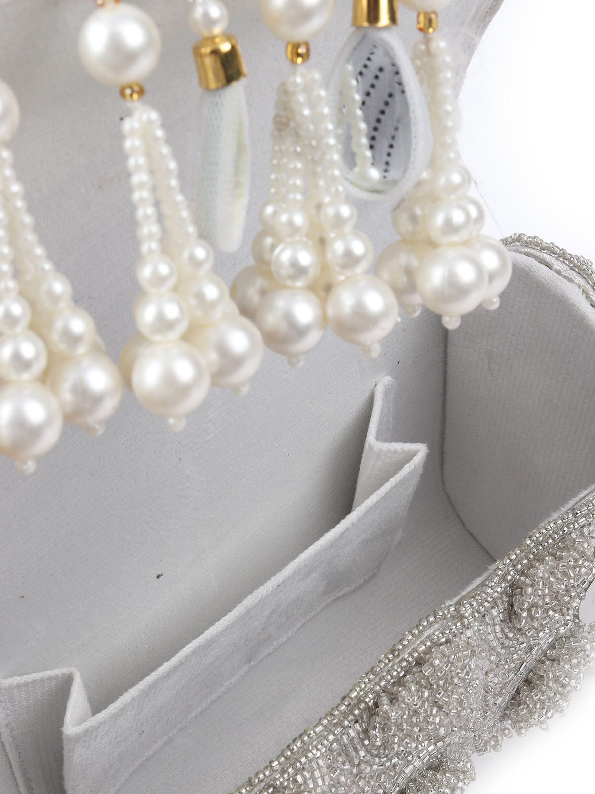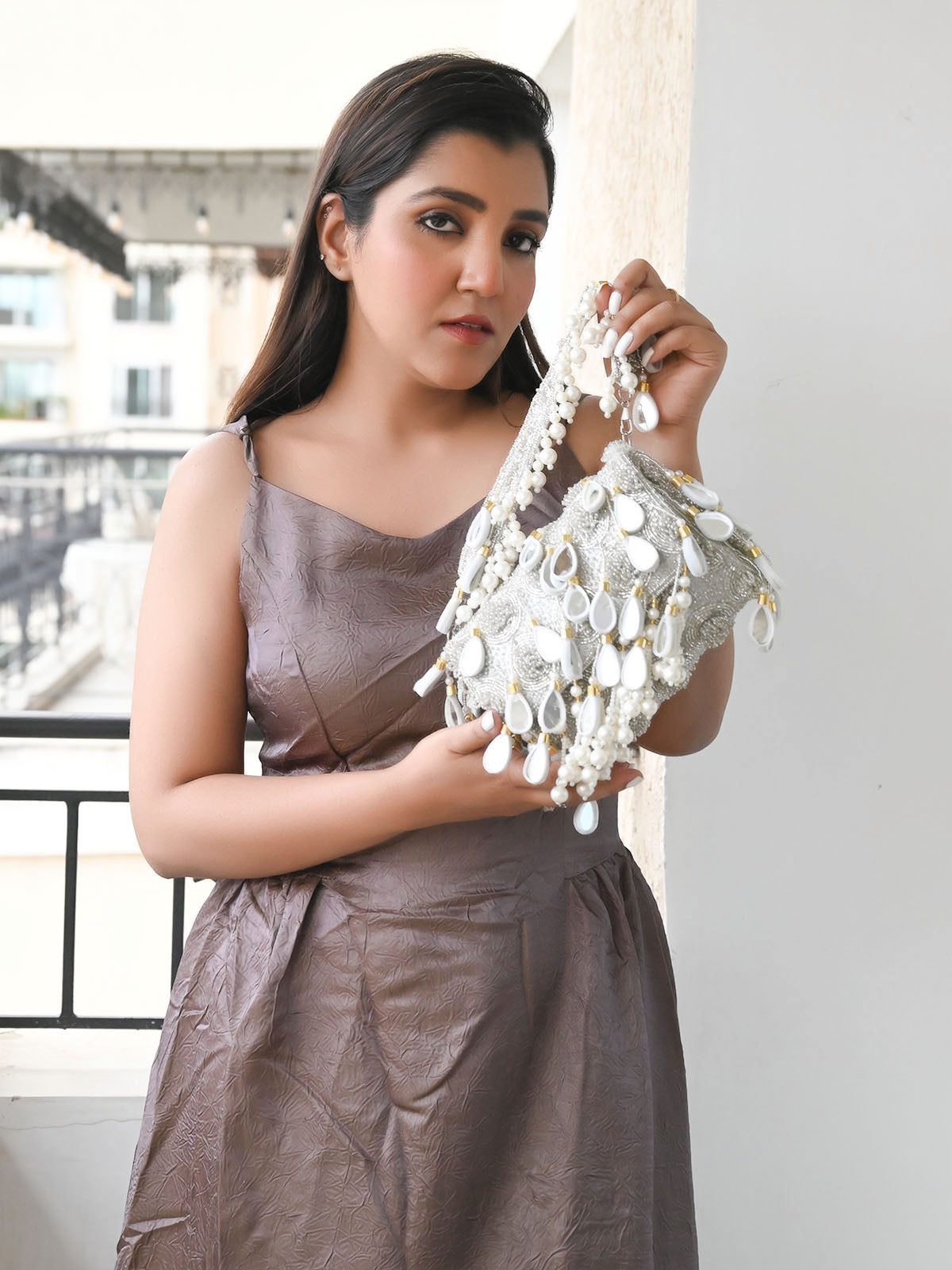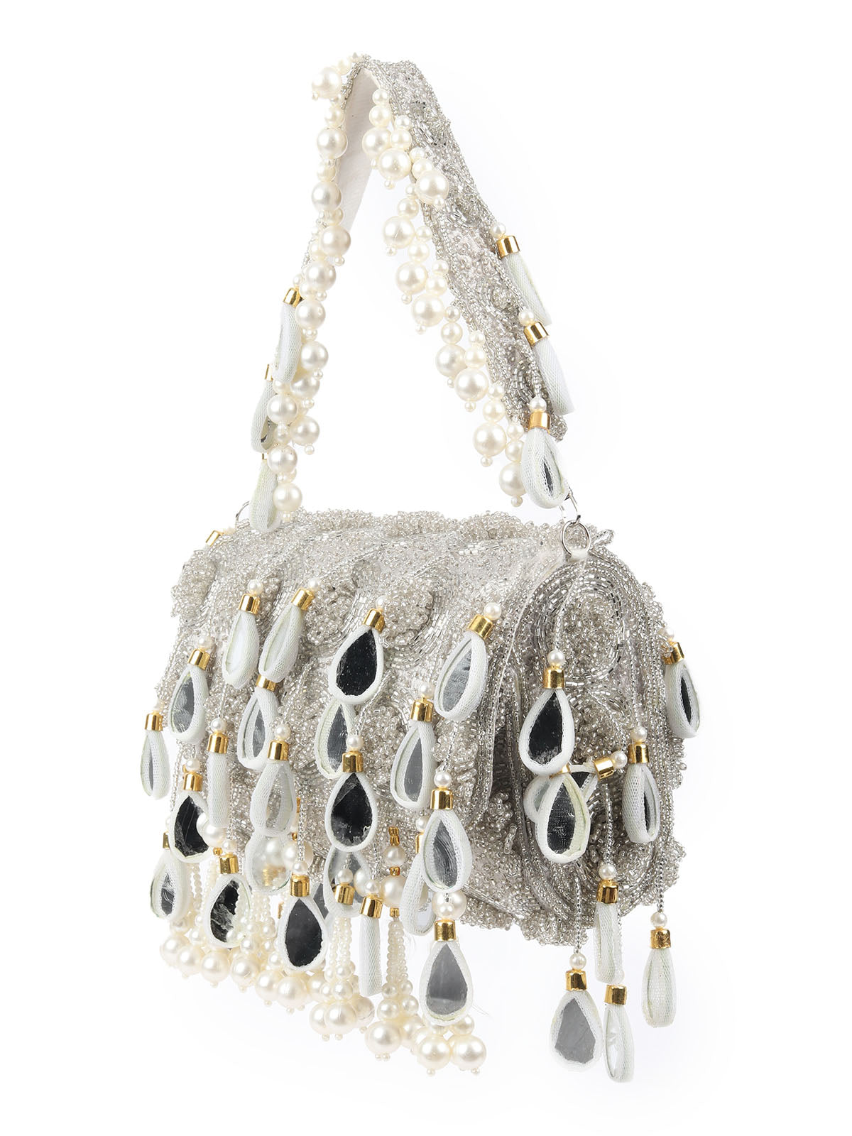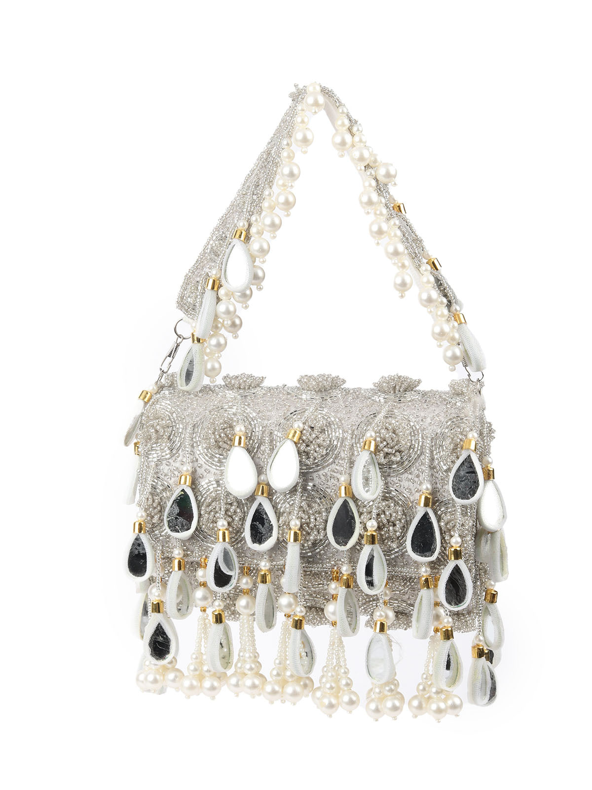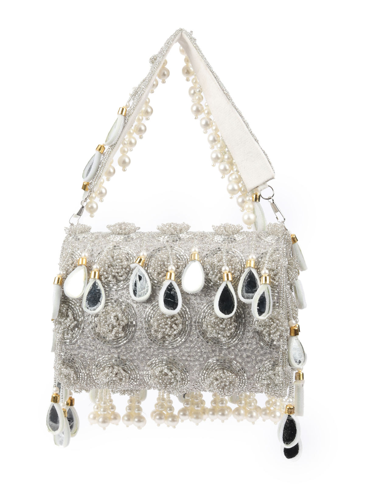 A Mesmerizing and heavy silver bag, fully embellished with shimmering silver beads, intricate cut dana, playful tassels, and beautiful mirror work. The elegant flap adds a touch of sophistication, making it perfect for a glamorous look.