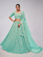 Rajwada Sky Blue Soft Net Embroidered Semi Stitched Lehenga With Unstitched Blouse For Women