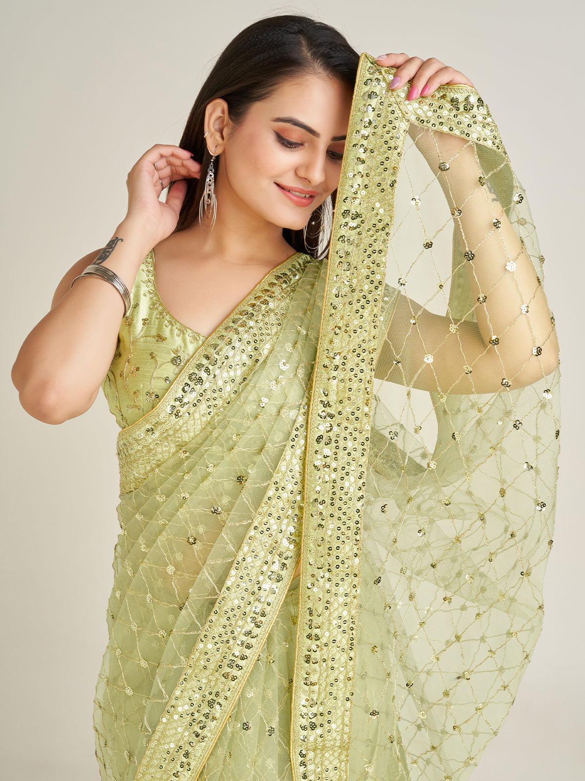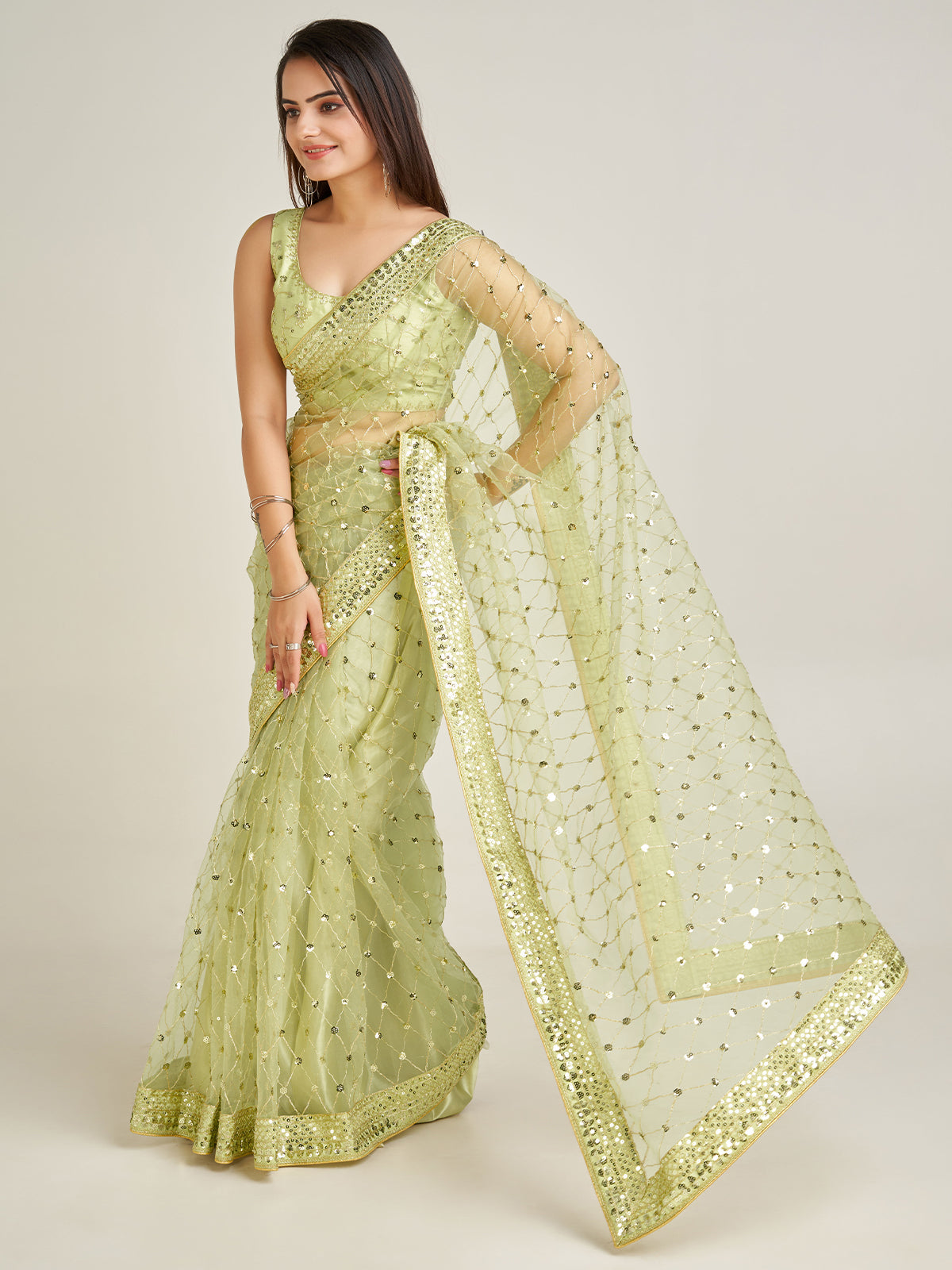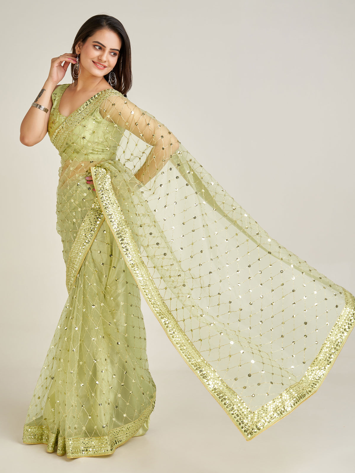 Adorn elegance with Rajwada's Green Net Sequin Saree. Sparkle in sophistication, embrace luxury, and captivate hearts with this exquisite ethnic masterpiece.