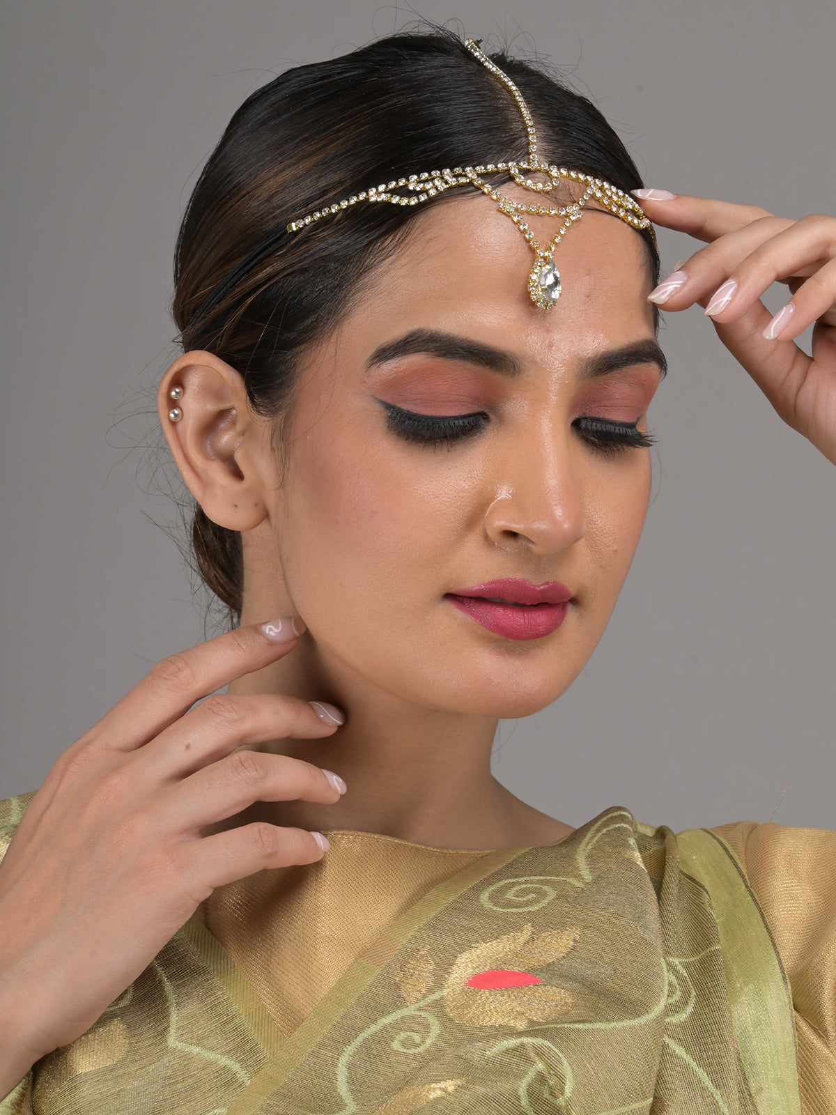 Elevate your style with our exquisite stone studded mathapatti, designed to add a touch of glamour to any outfit. Crafted with precision and adorned with stunning details, this statement head piece is perfect for special occasions.