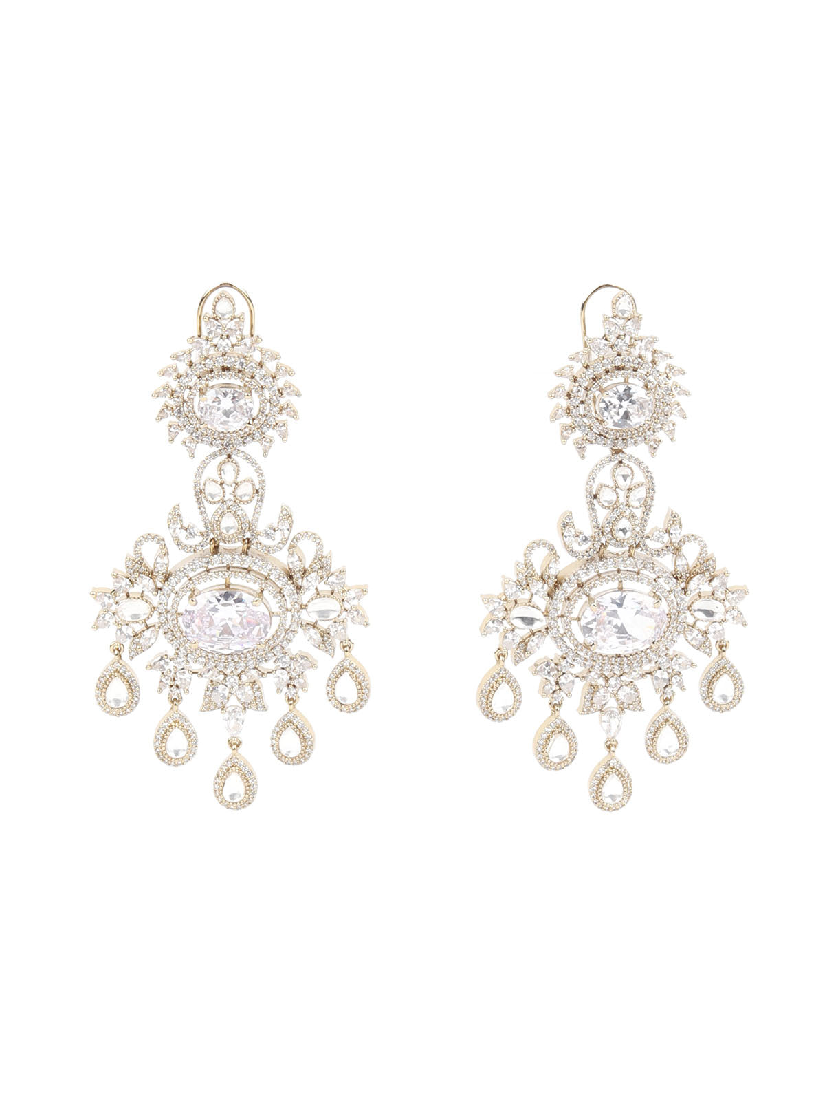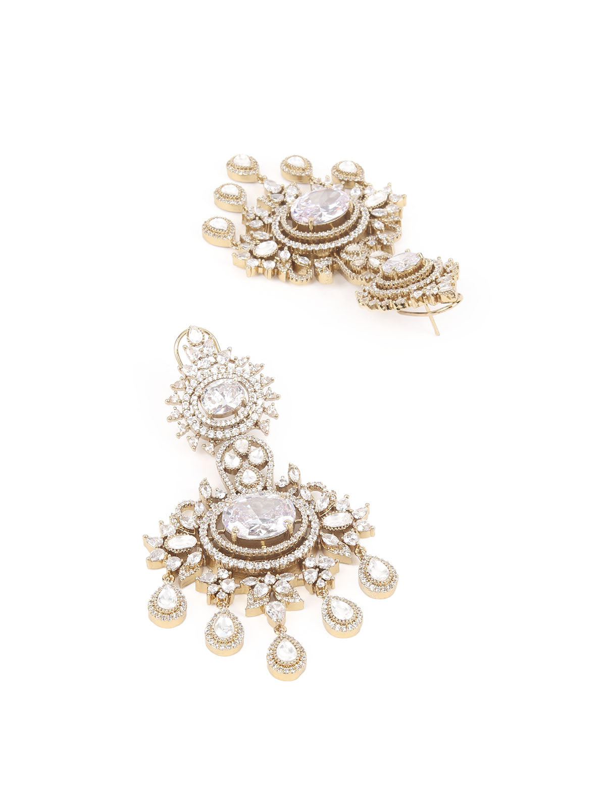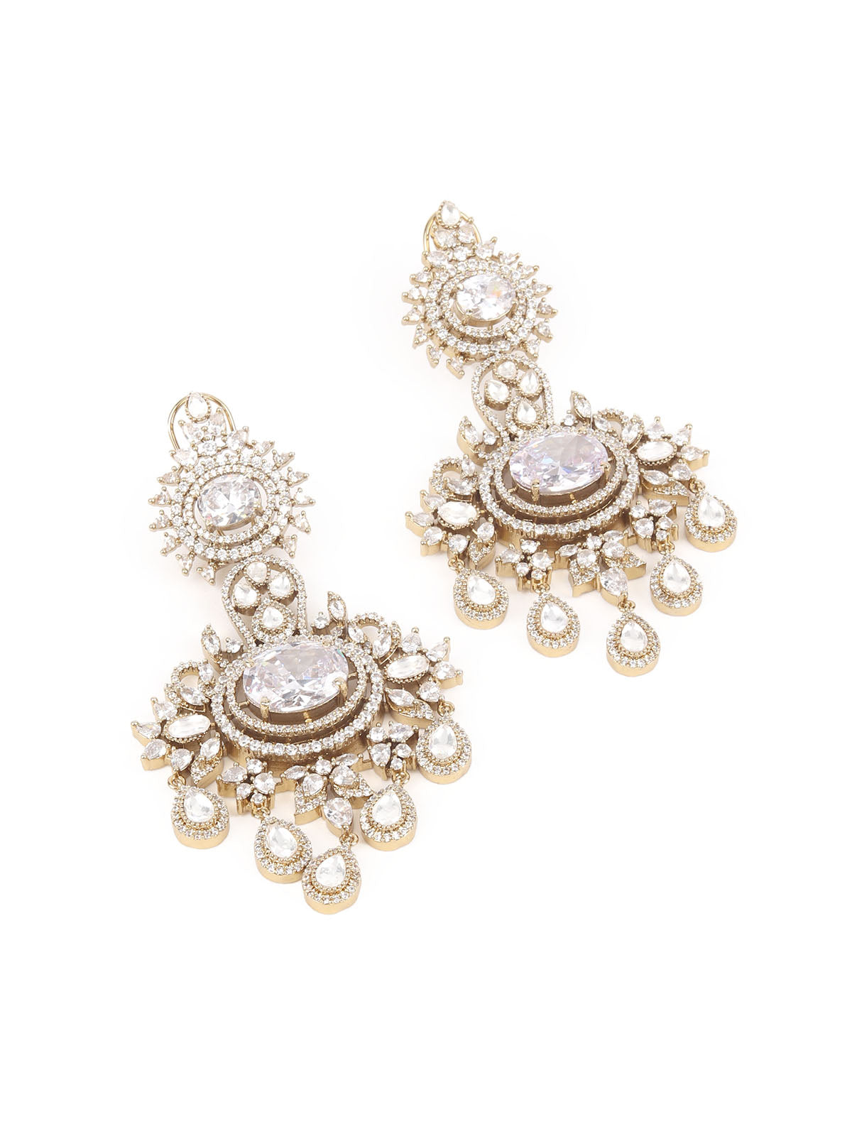 Gold-Toned & Sea Green Contemporary Drop Earrings, Has Artificial Stones And Kundan With Zircon Stone.