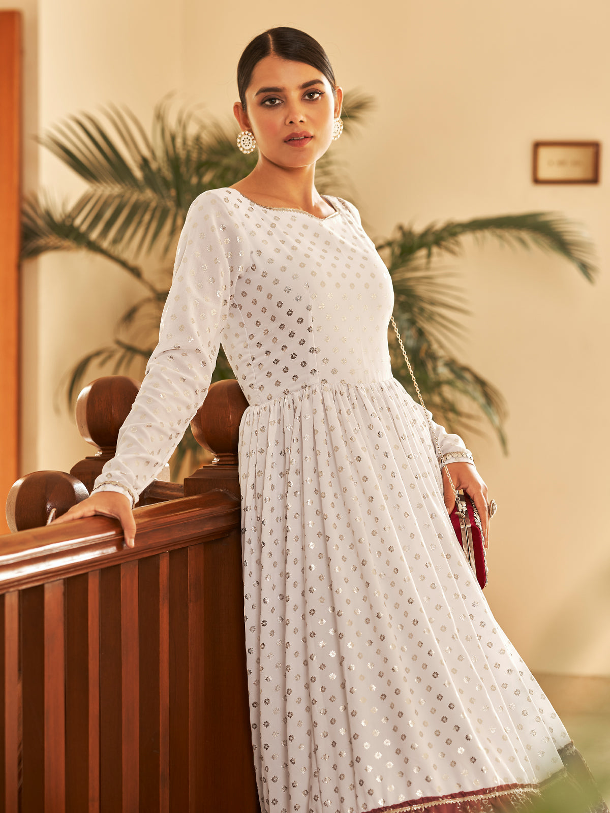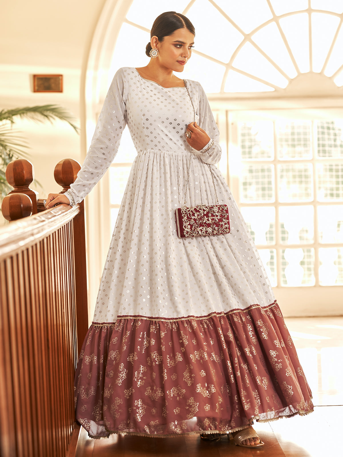 Classic and elegant, this gown will be a perfect addition to your ethnic wardrobe, offering a soothing and pretty vibe the adornment of Metallic Foil Work makes it impeccable