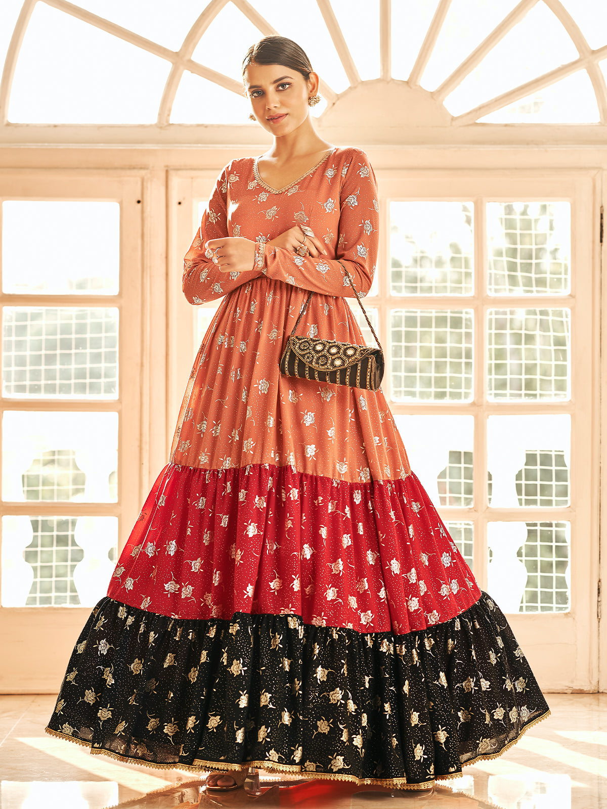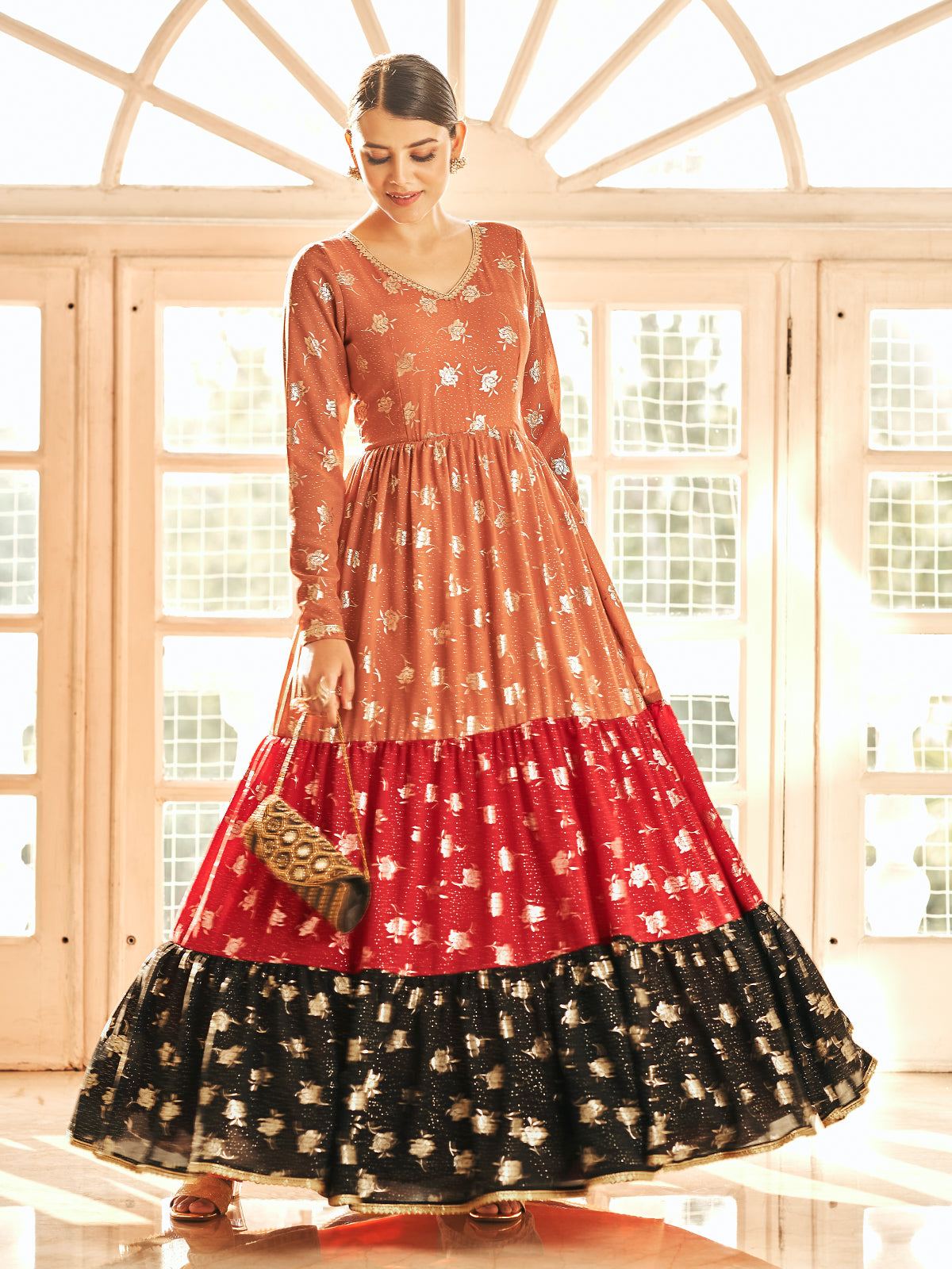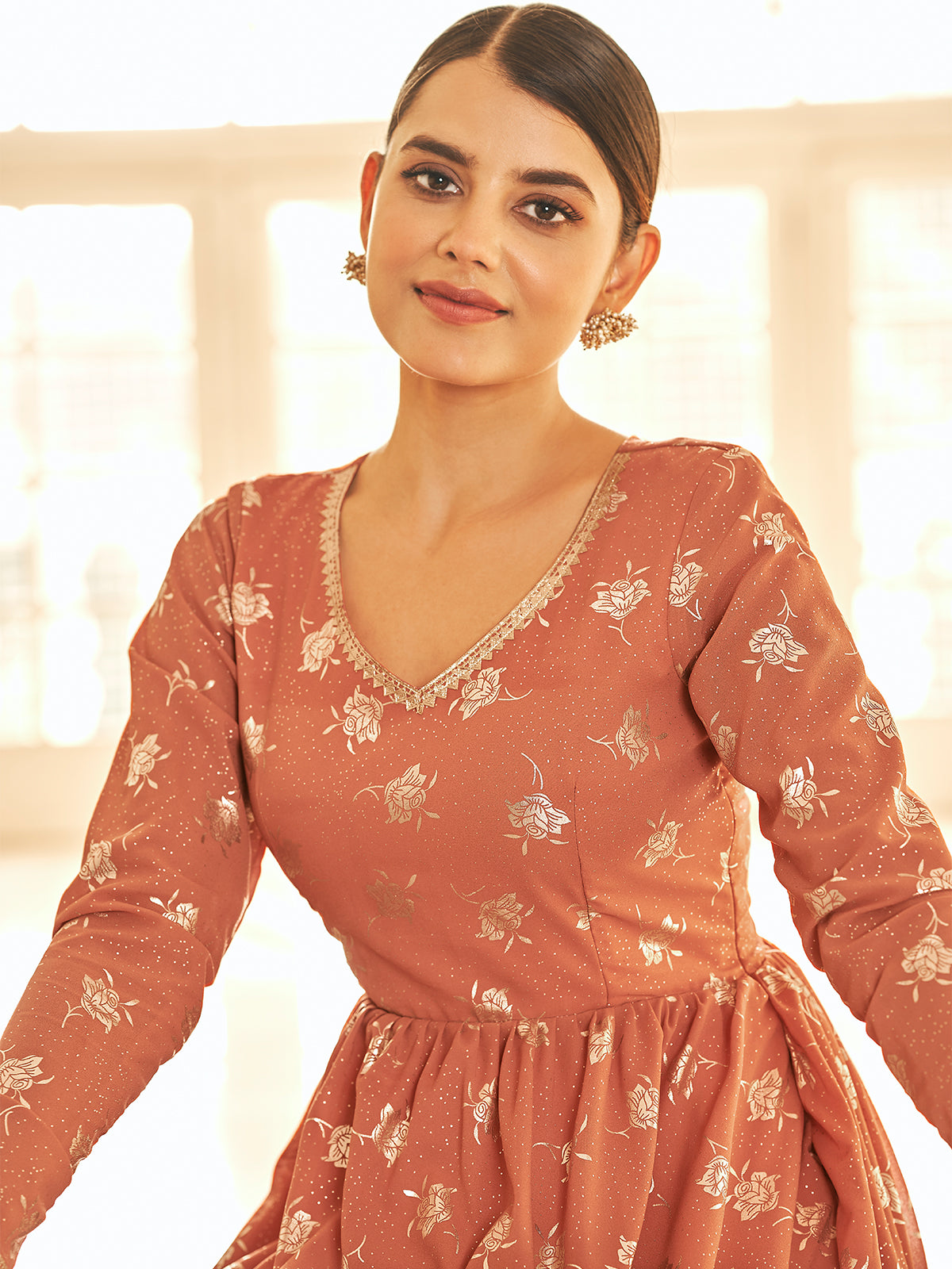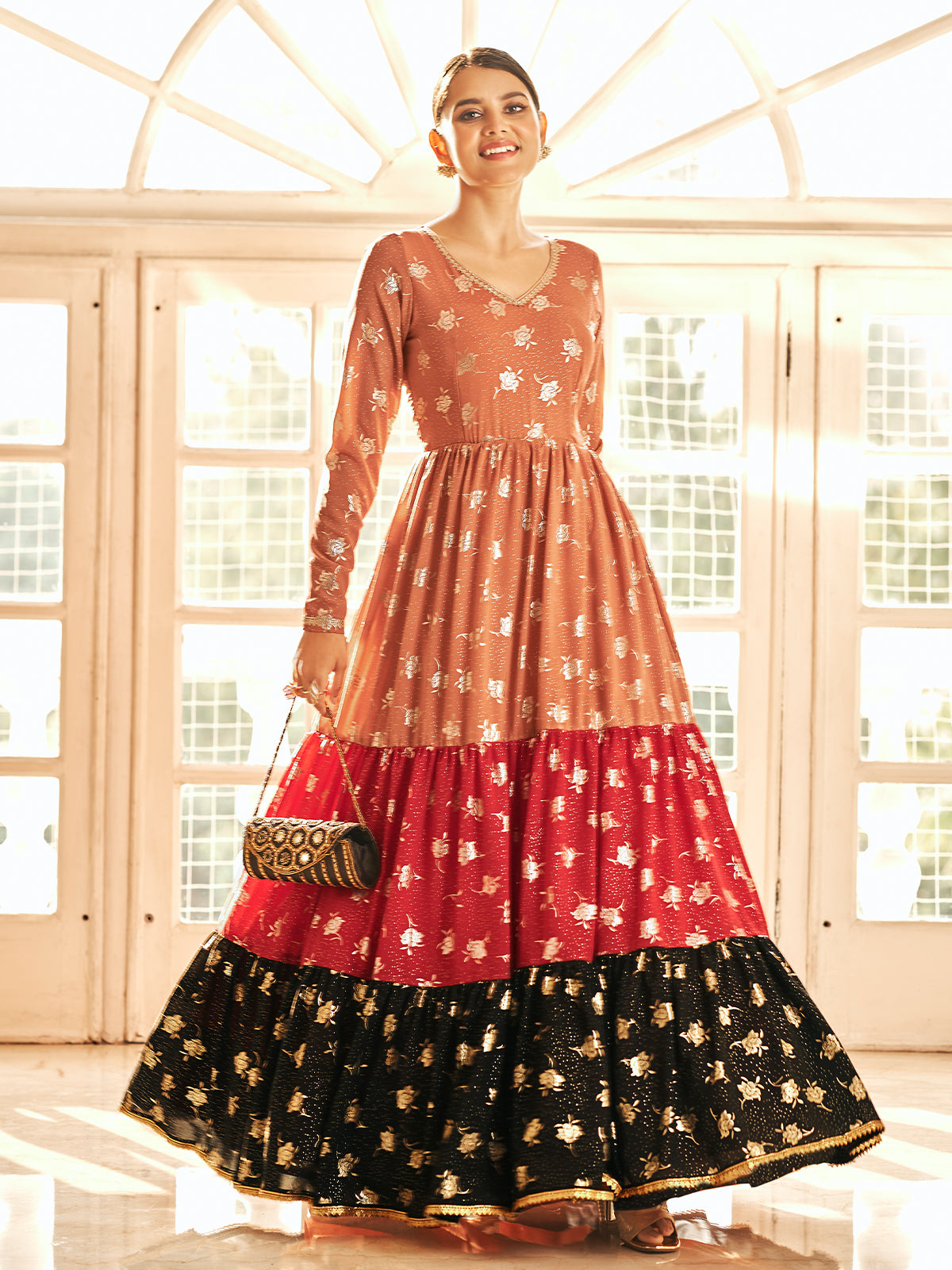 Classic and elegant, this gown will be a perfect addition to your ethnic wardrobe, offering a soothing and pretty vibe the adornment of Metallic Foil Work makes it impeccable.