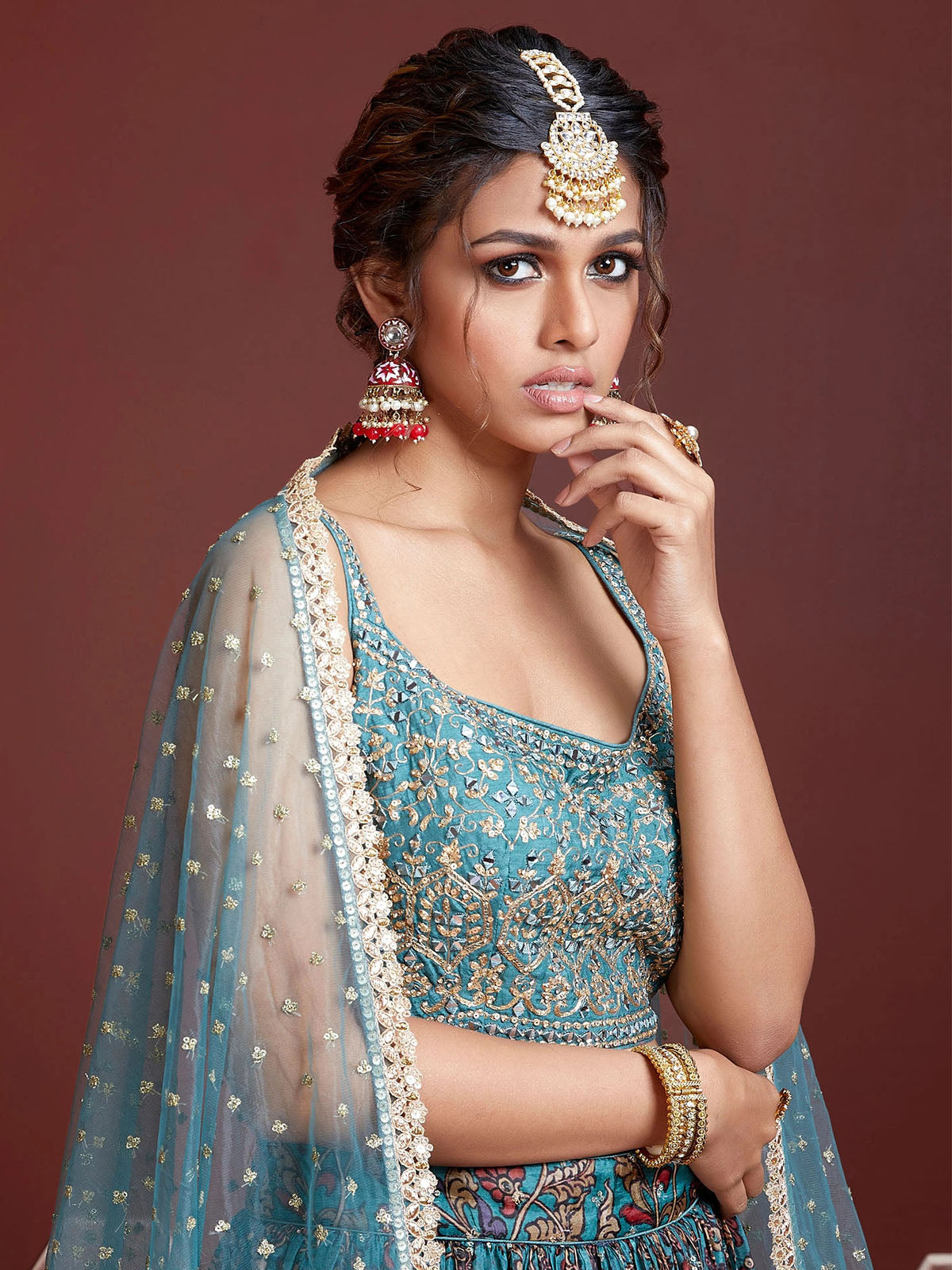 Add light to the celebration called life beaming in this lehenga, choli and dupatta set. Crafted on Heavy Banglori Silk, the set is beautified with Embroidery With real Mirror work.