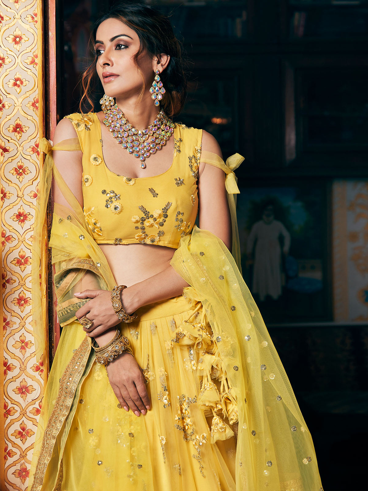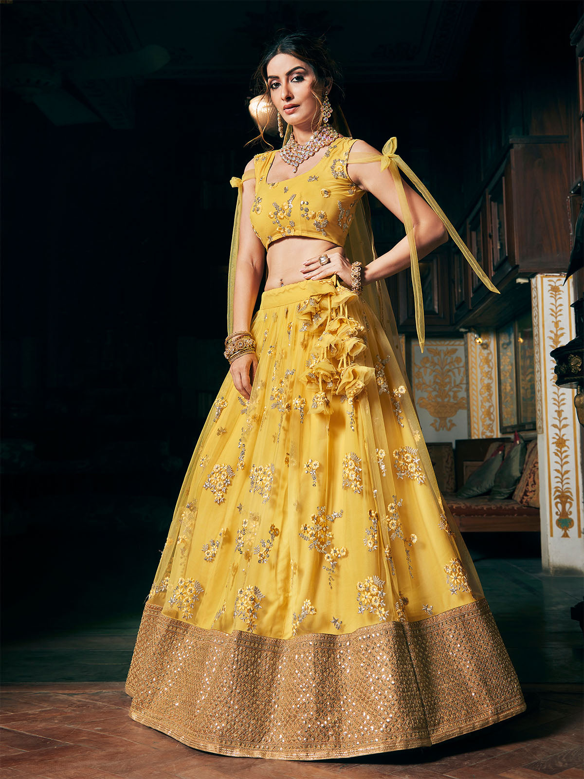 Add light to the celebration called life beaming in this lehenga, choli and dupatta set. Crafted on Net, the set is beautified with embroidery work.