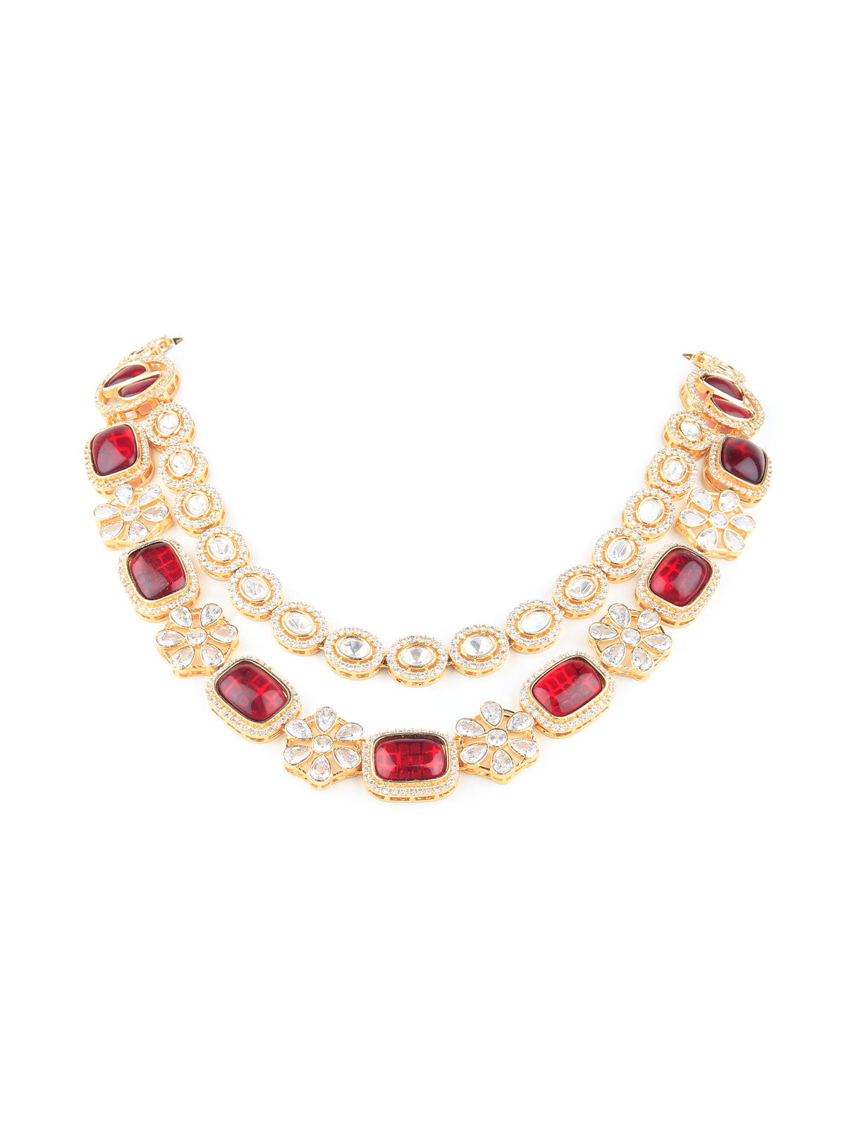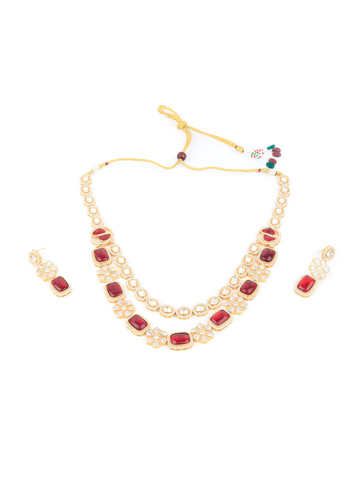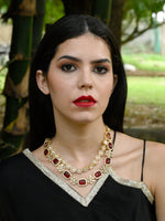 Spruce up your look with this mixed metal neckpiece set, containing royal looking long necklace and matching earrings set. The neckpiece is decorated with red faux stones that is flanked by equally statement earrings.