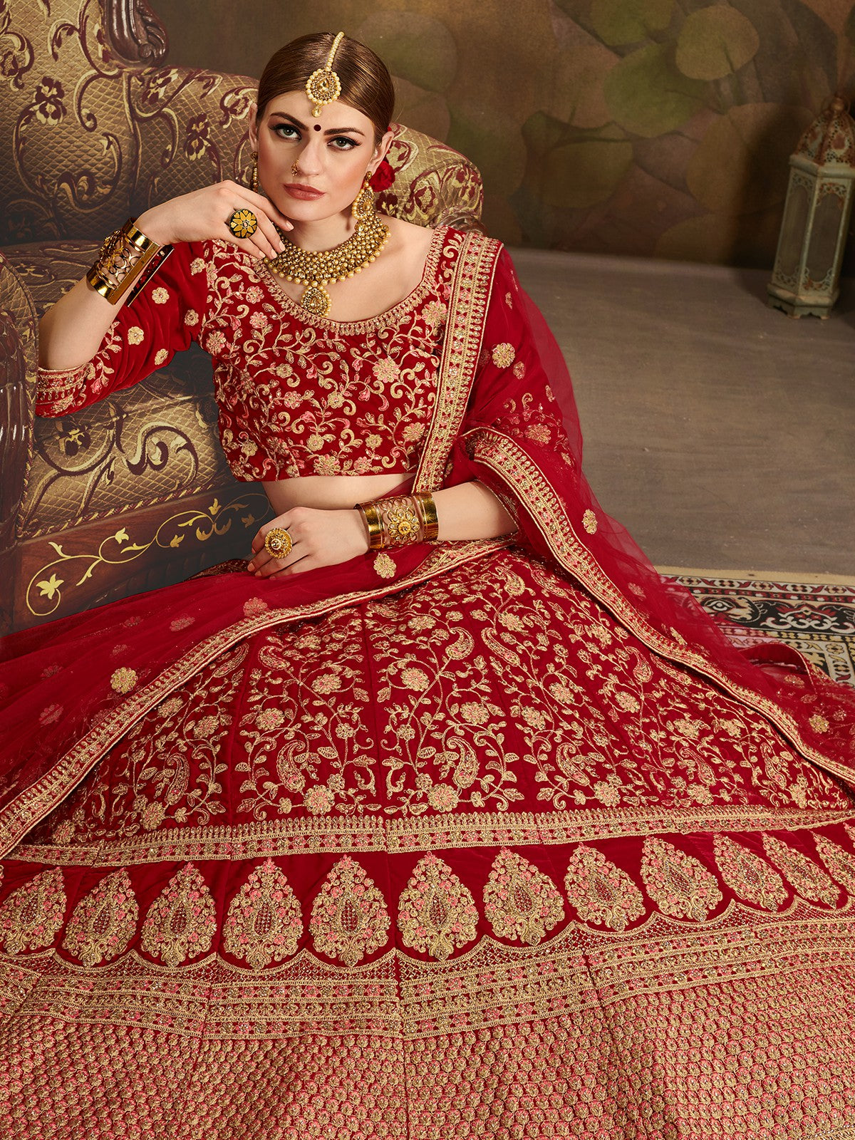 Add light to the celebration called life beaming in this lehenga, choli and dupatta set. Crafted on Pure Velvet, the set is beautified with Embroidered.