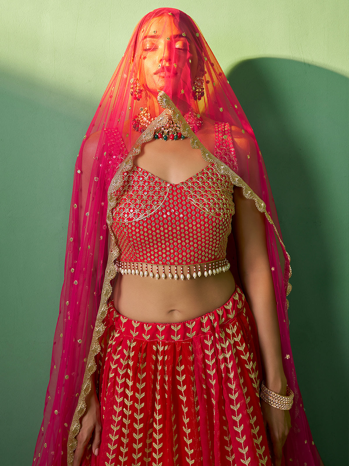 Add light to the celebration called life beaming in this lehenga, choli and dupatta set.