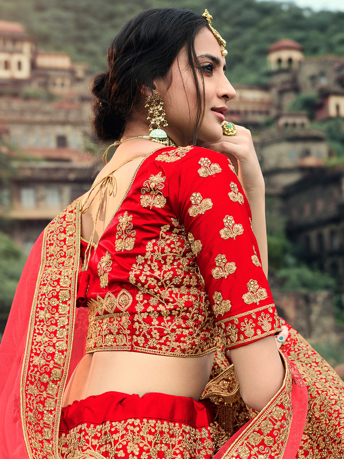 Add light to the celebration called life beaming in this lehenga, choli and dupatta set. Crafted on satin, the set is beautified with Glitter Dori, Zari, Stone, Thread work.