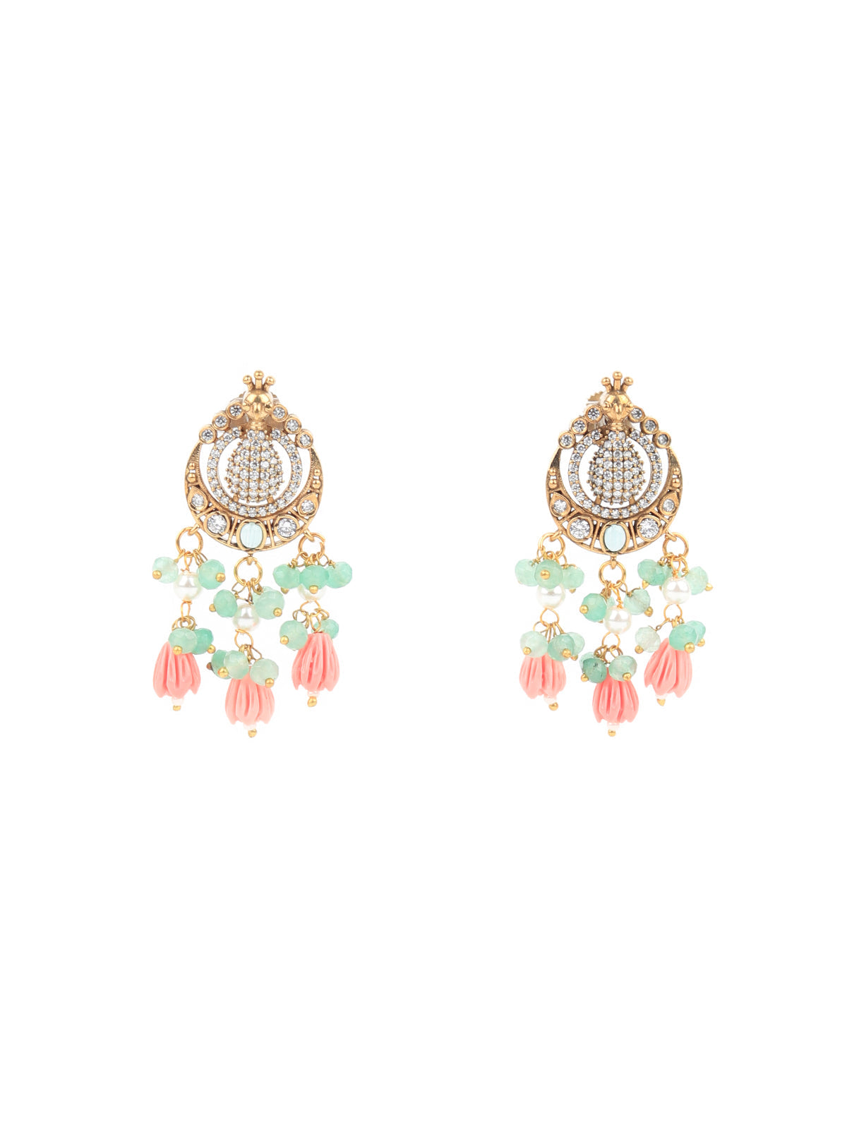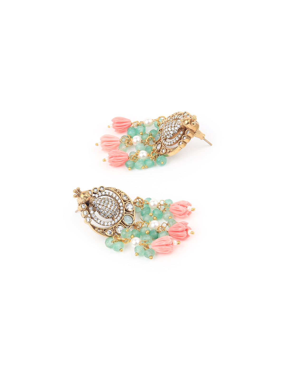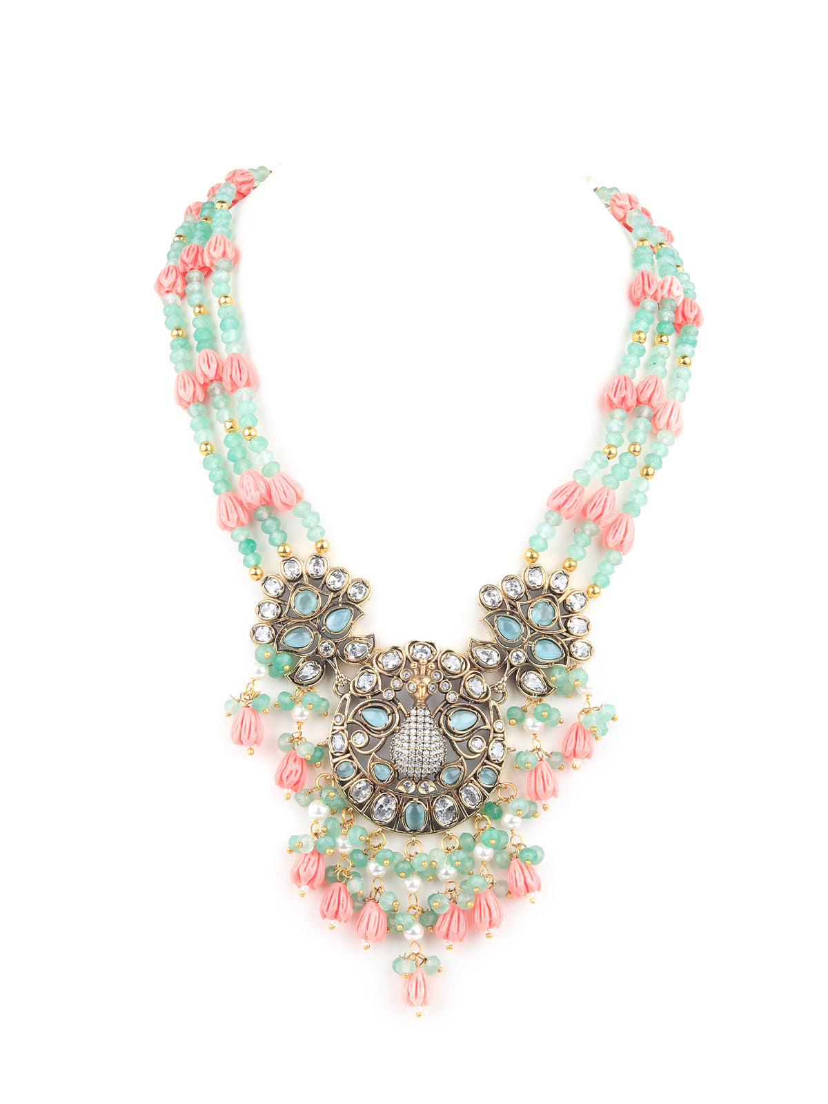 This gorgeous set of neck piece with stud earrings is a great accompaniment to your wedding or party outfit. The necklace has stones work on it. The neckpiece is flanked with matching earrings. The collection and setting of faux stones lends grandeur to this piece. This is must have in your collection.