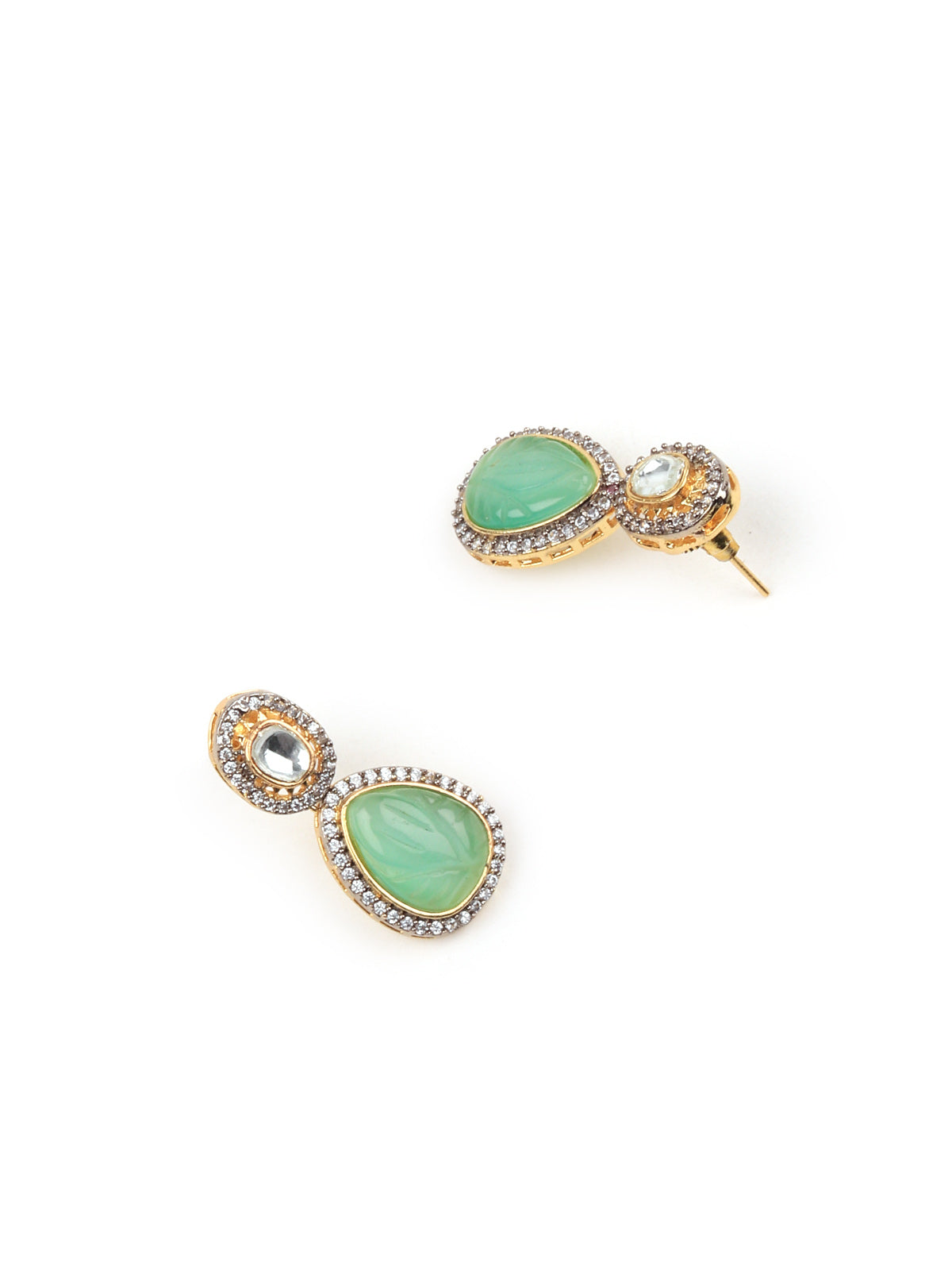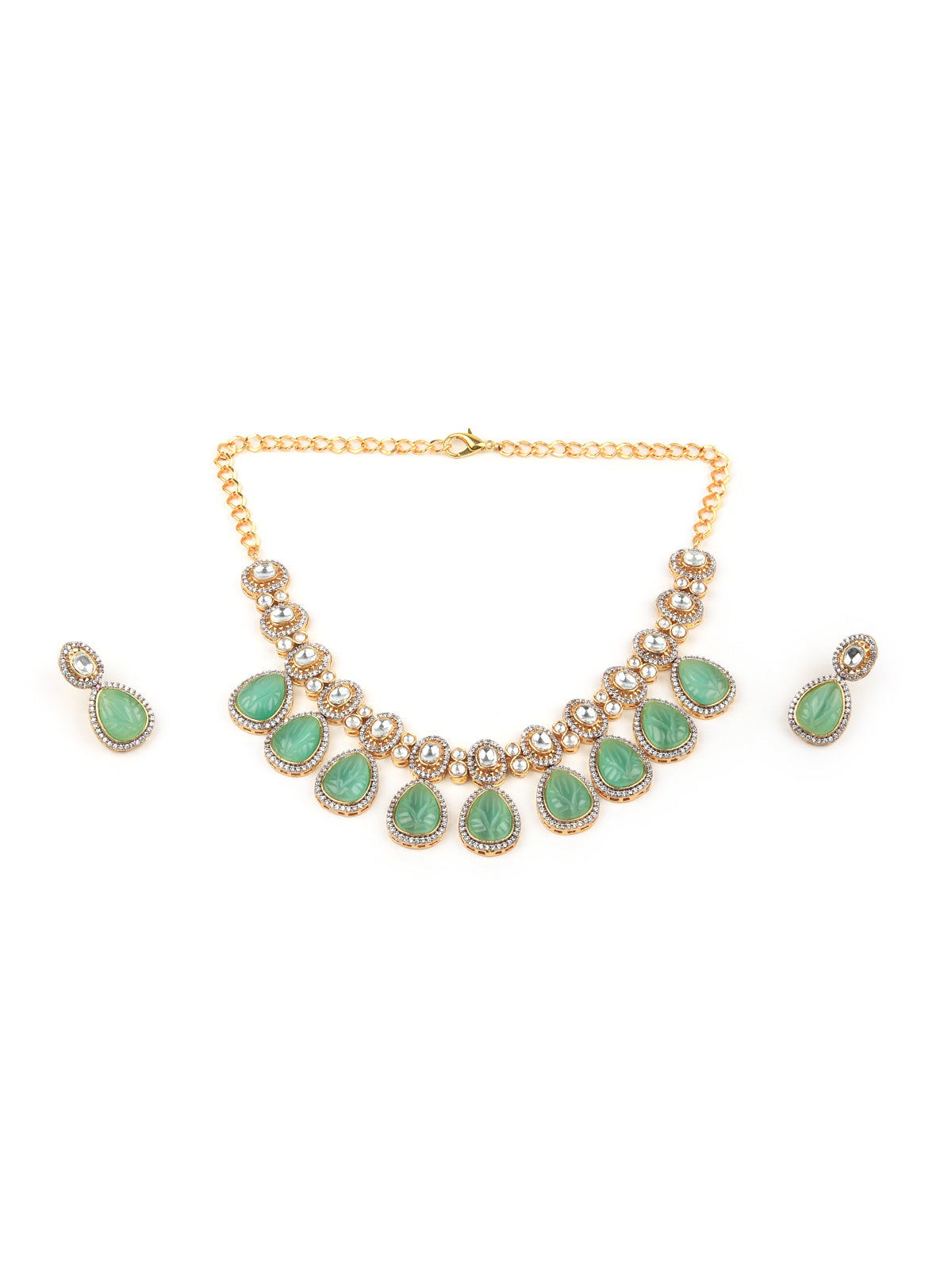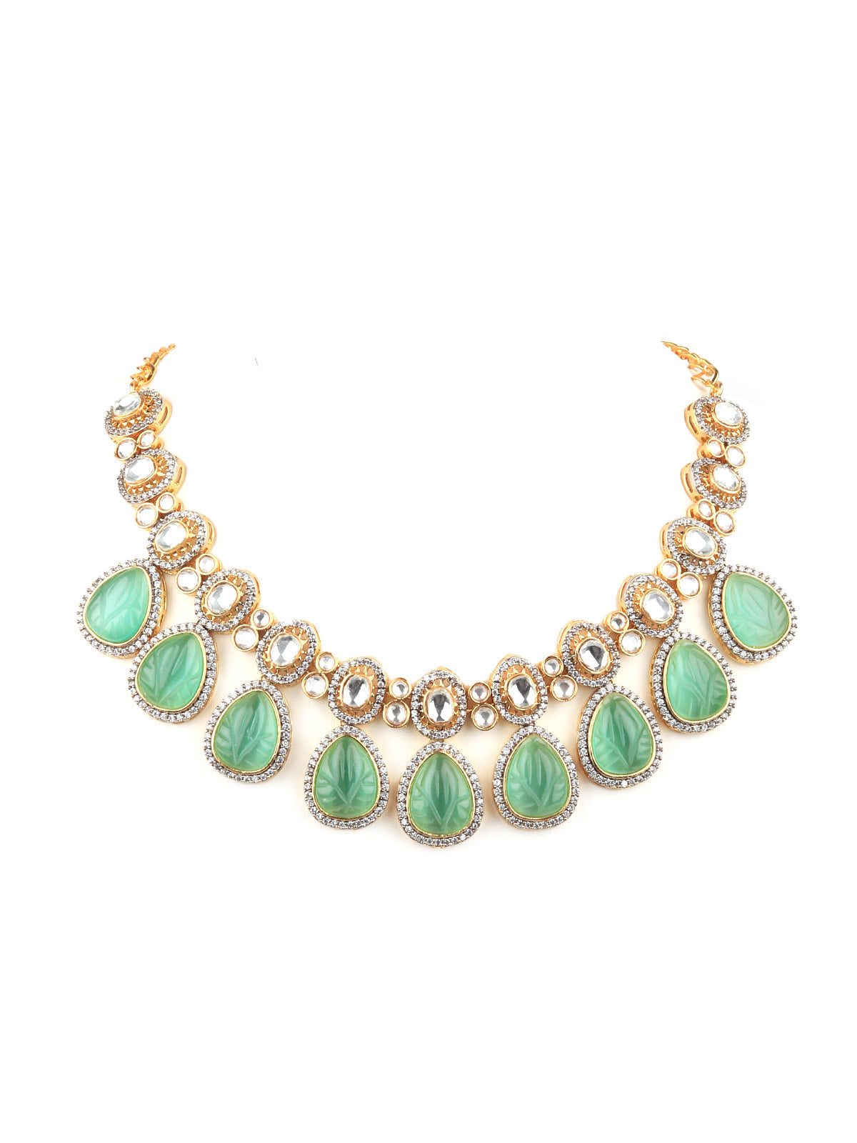 This gorgeous set of neck piece with dangling earrings is a great accompaniment to your wedding or party outfit. The necklace has Kundan and beads on it. The collection and setting of faux stones lend Victorian grandeur to this piece. This is must have in your collection.