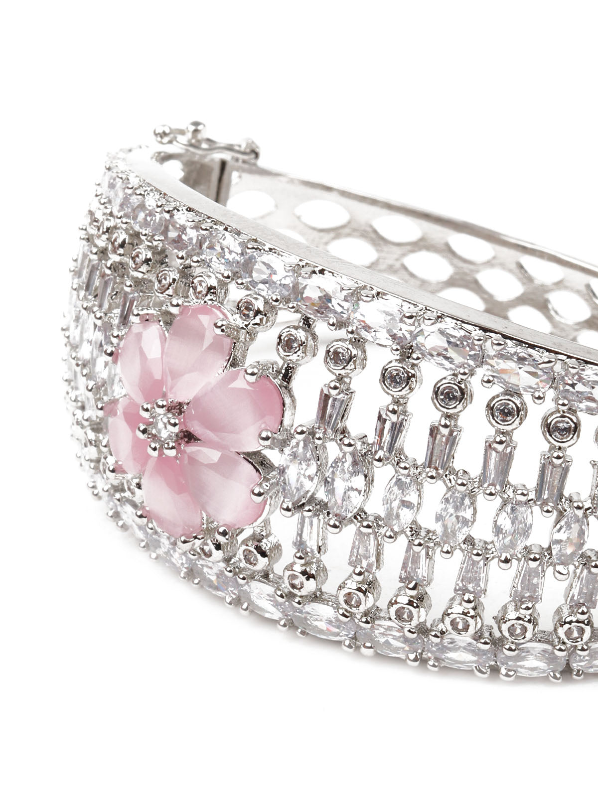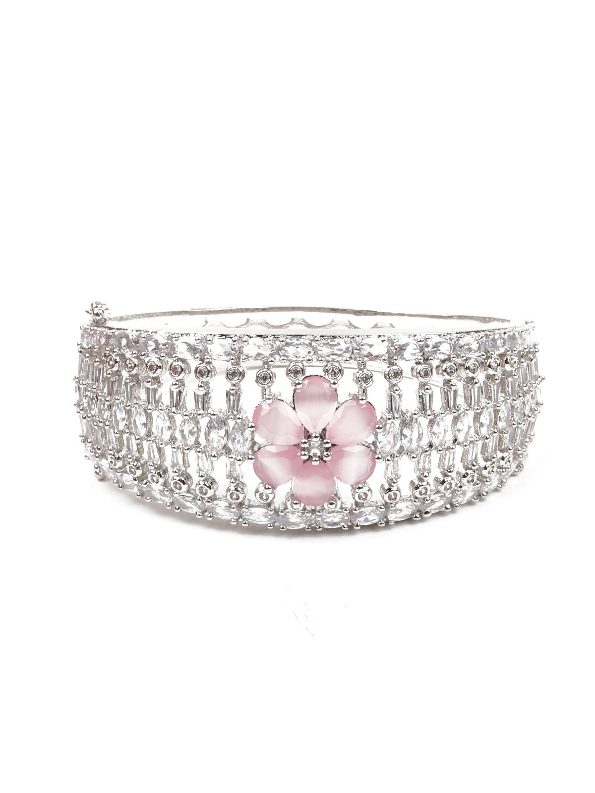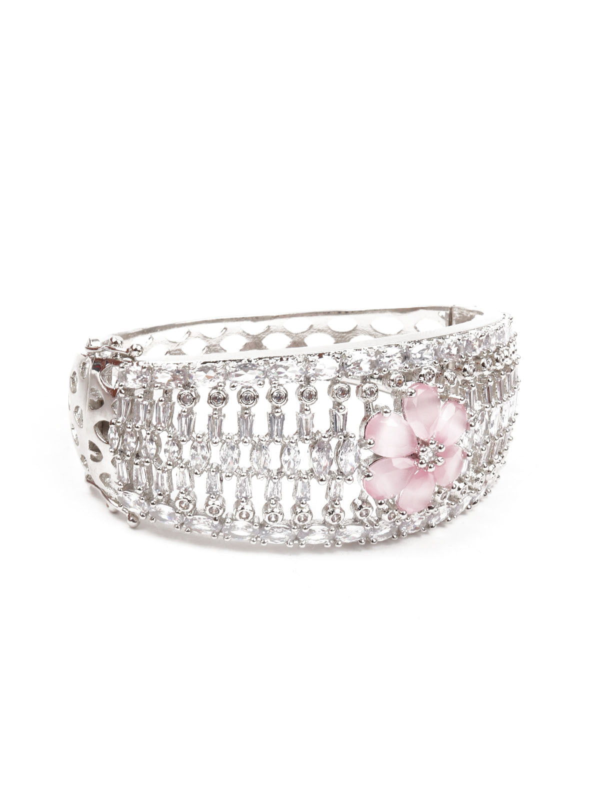 The silver and pink plated bracelet is studded with an interesting embellishment over it. This is a standalone piece crafted to gain compliments.