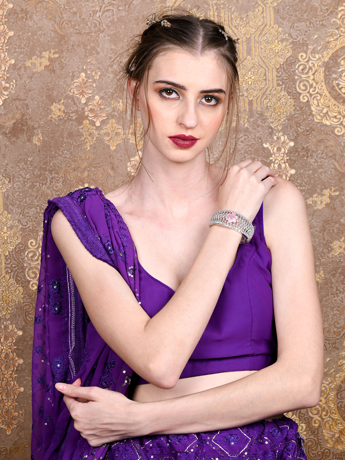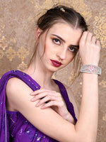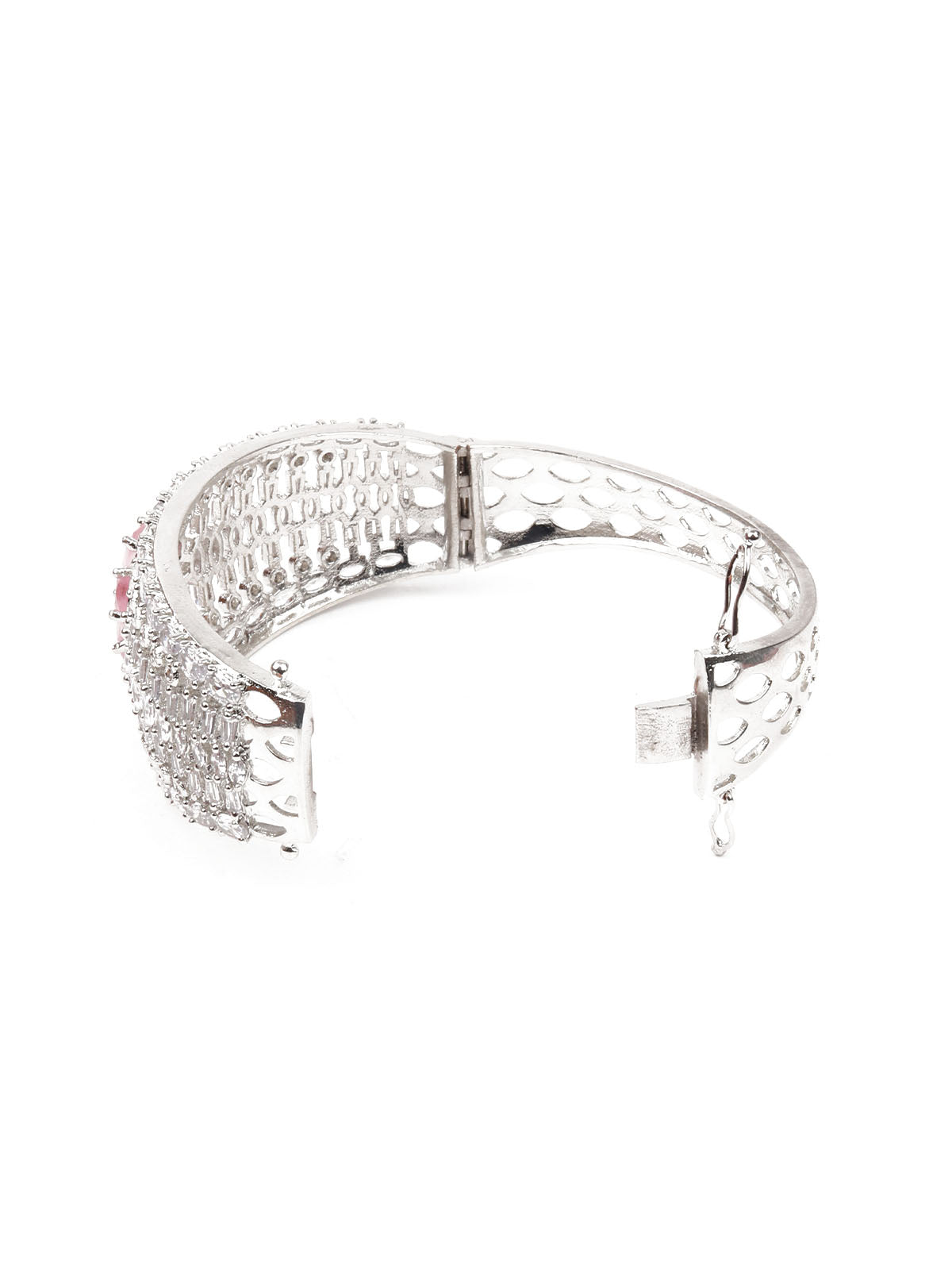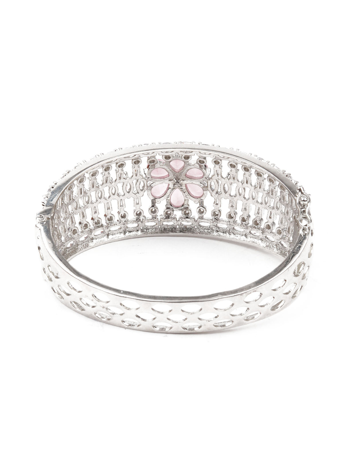 The silver and pink plated bracelet is studded with an interesting embellishment over it. This is a standalone piece crafted to gain compliments.