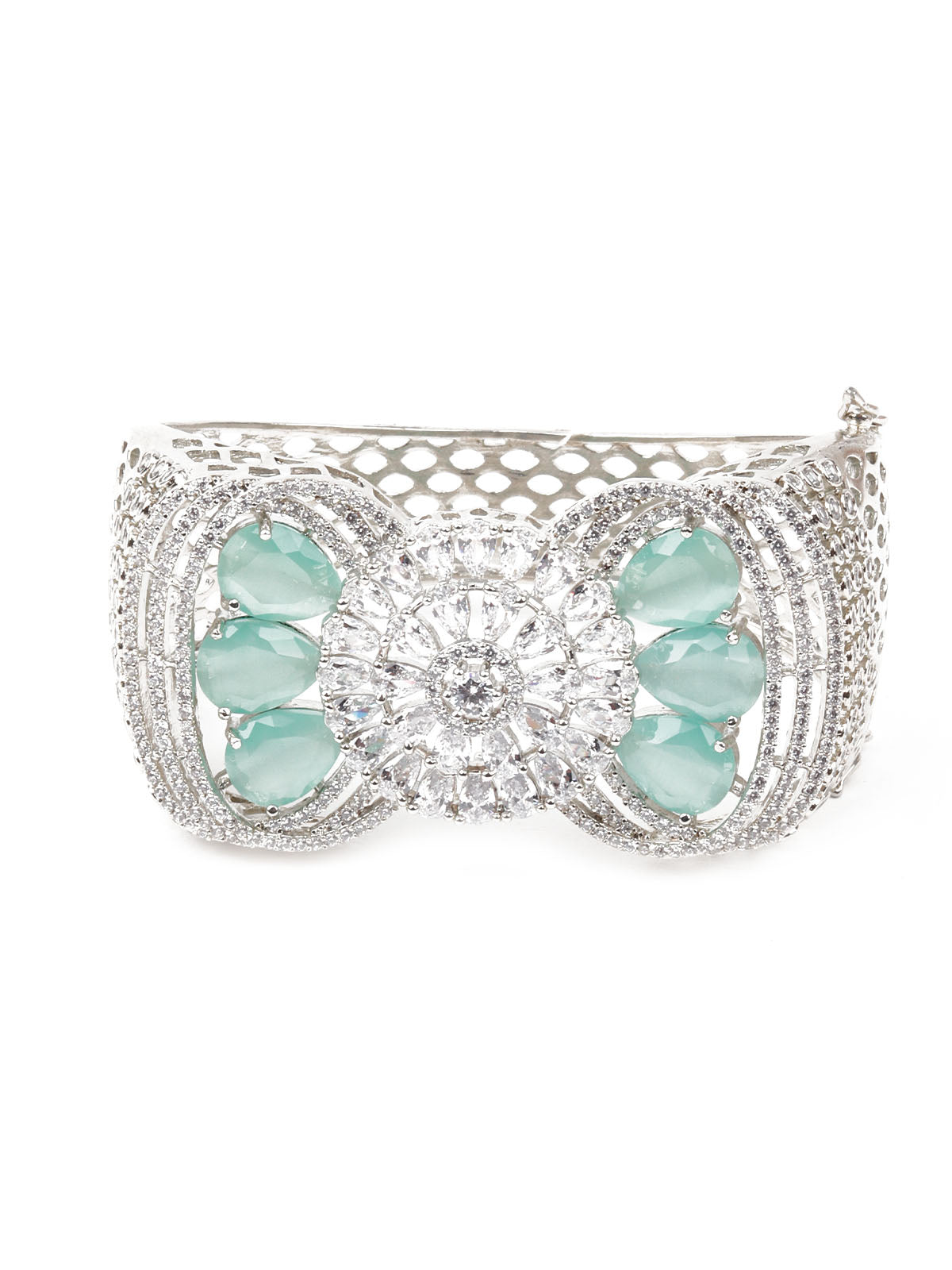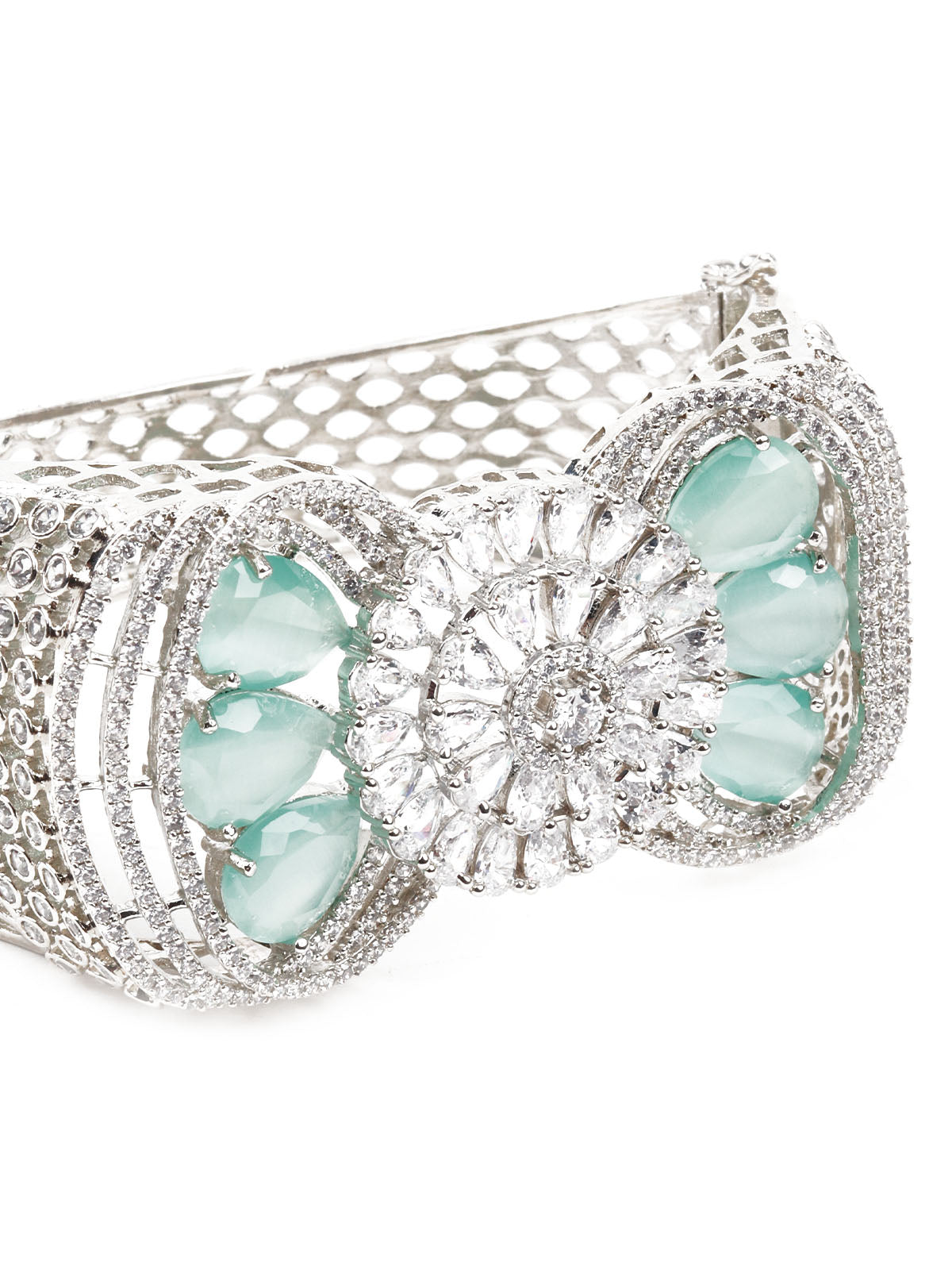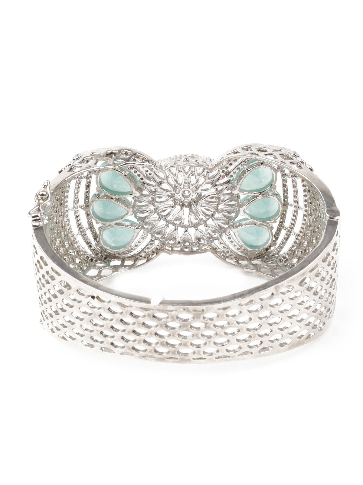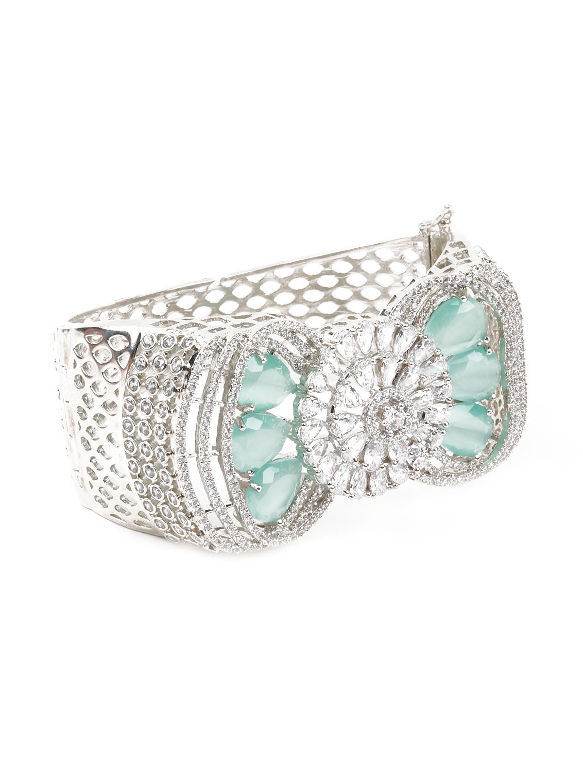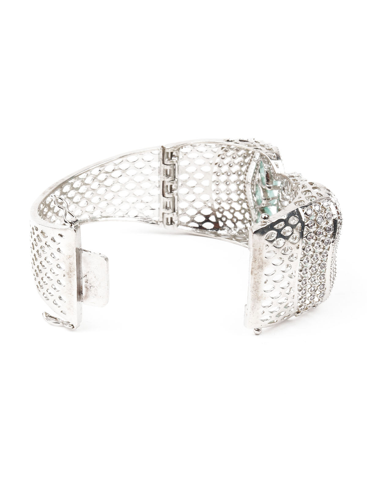 The silver and sea green plated bracelet is studded with an interesting embellishment over it. This is a standalone piece crafted to gain compliments.