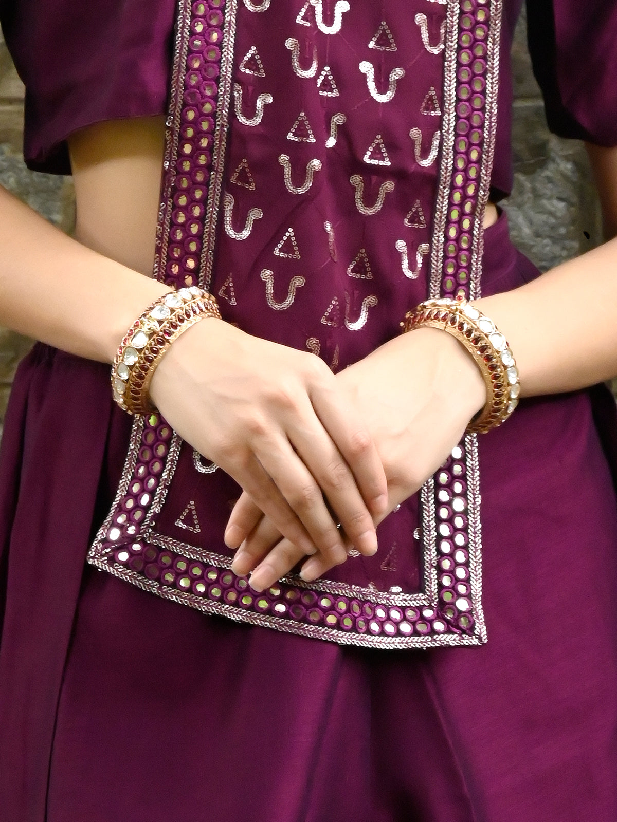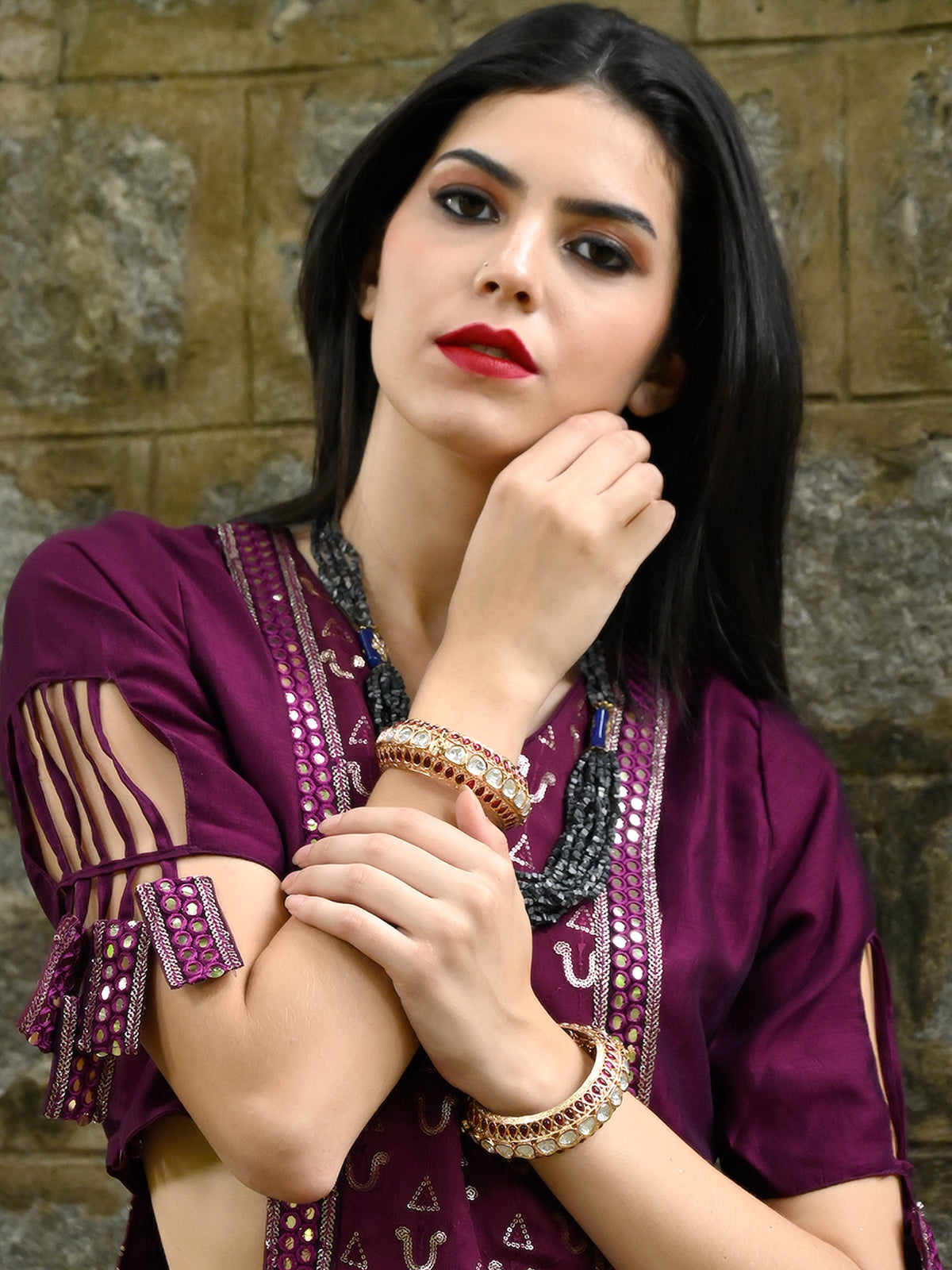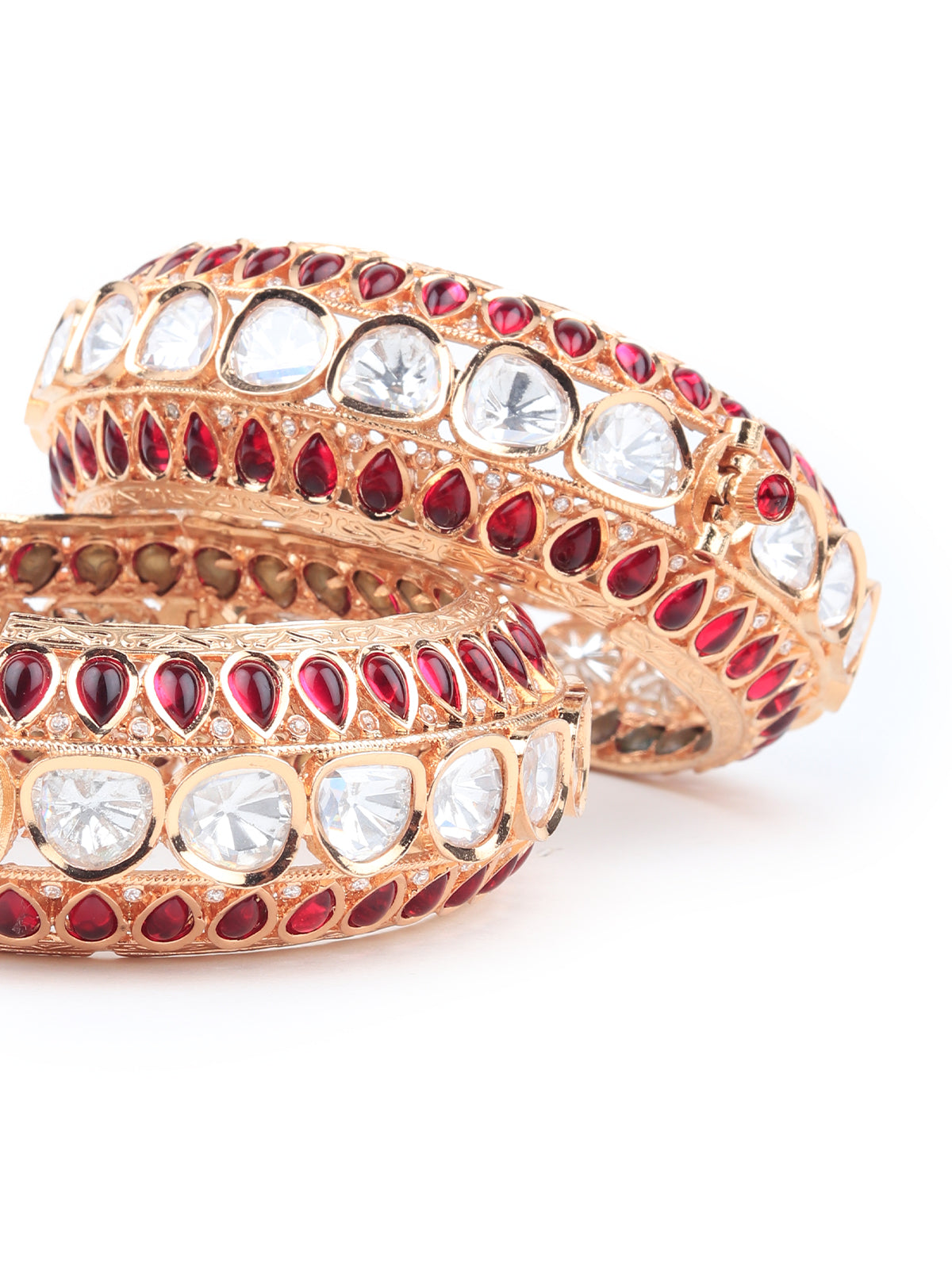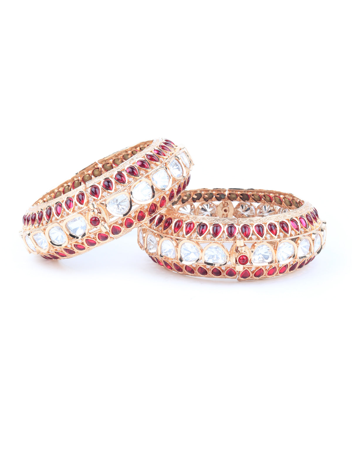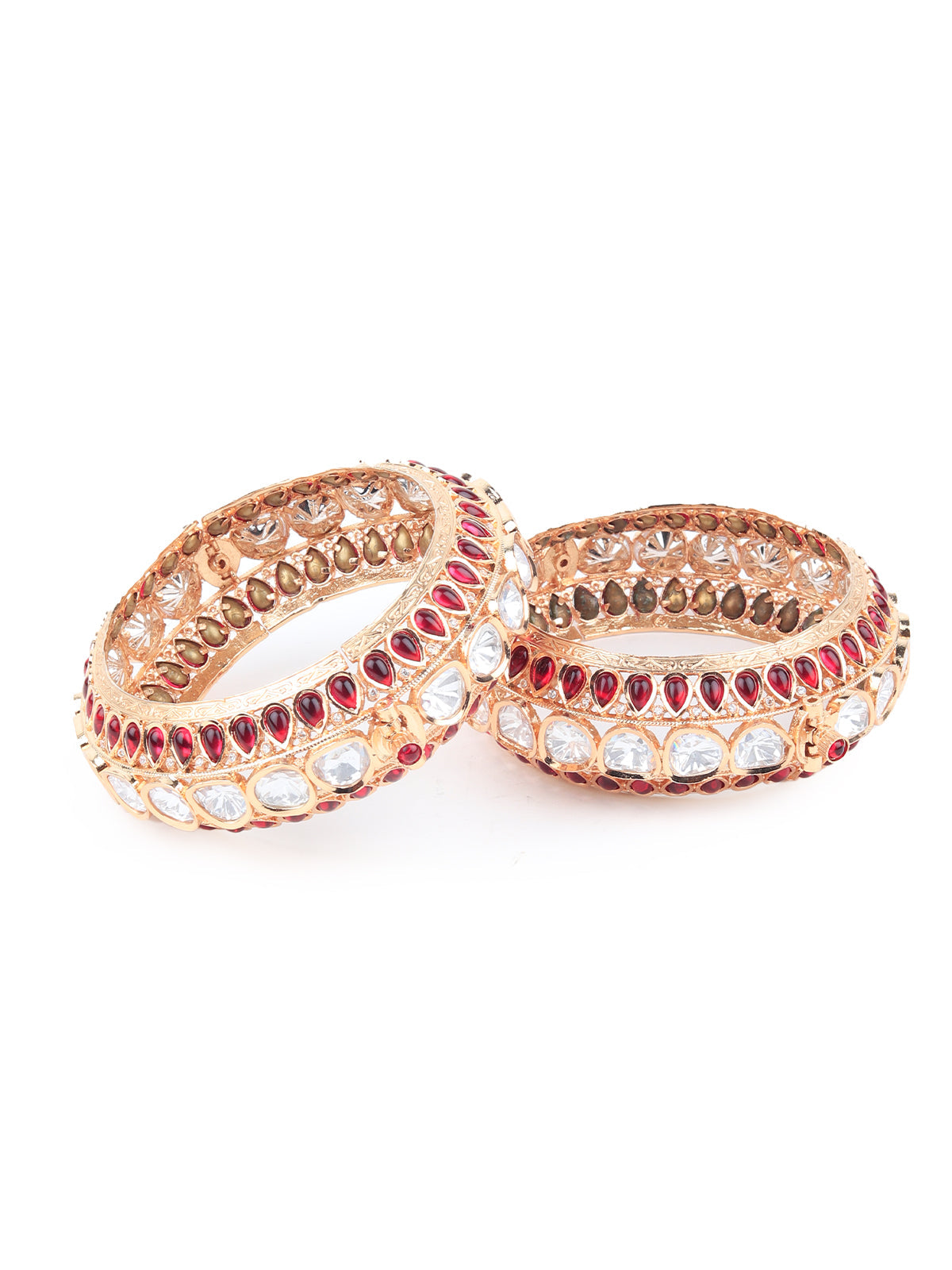 The Golden plated bangle has beautiful red and white stones and kundan studded over it. This is a standalone piece crafted to gain compliments.