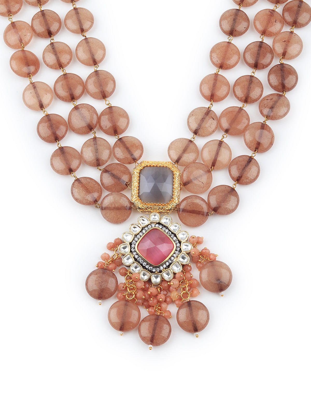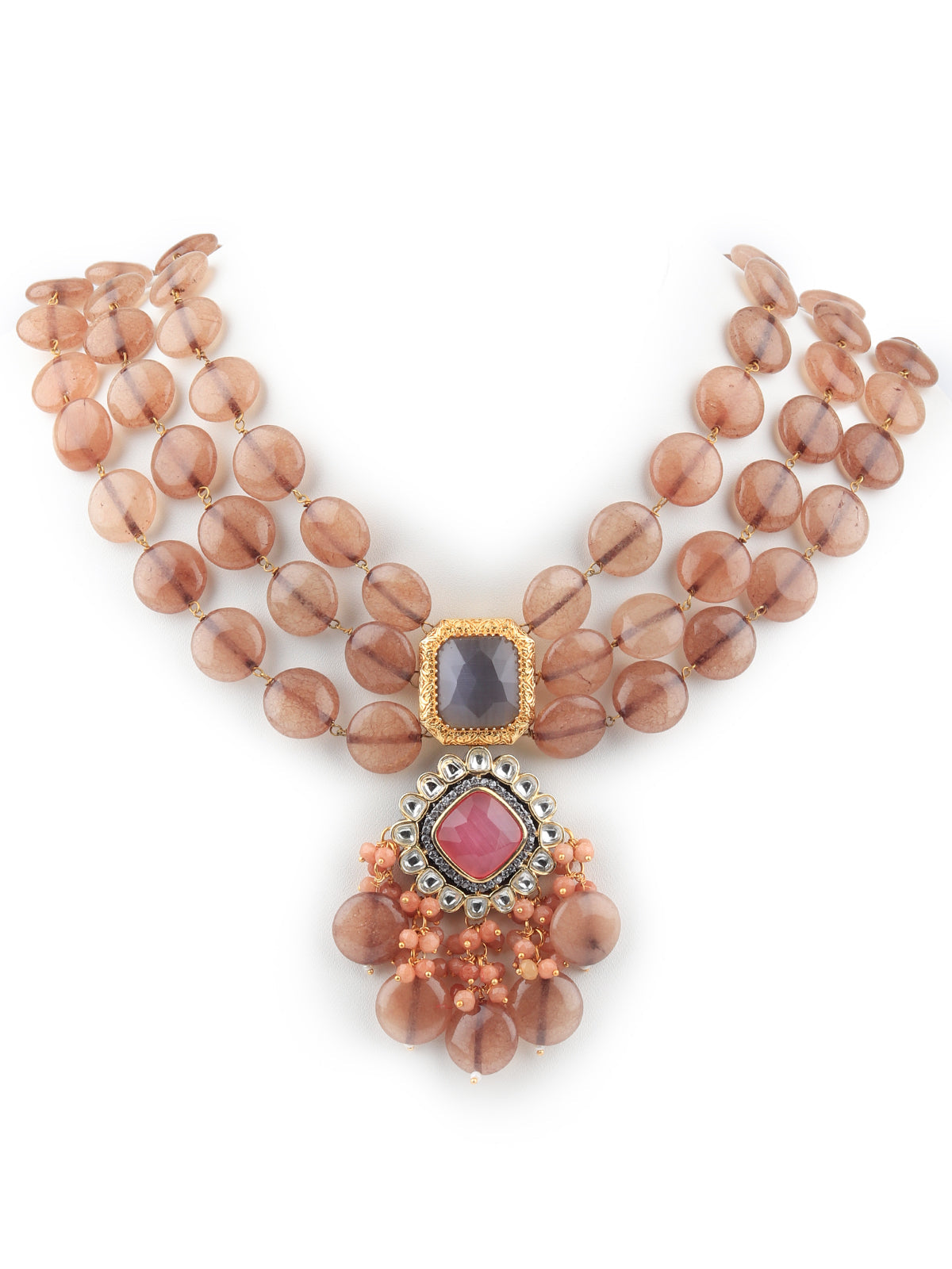 This gorgeous set of neck piece with dangling earrings is a great accompaniment to your wedding or party outfit. The necklace has Kundan and beads on it. The collection and setting of faux stones lend Victorian grandeur to this piece. This is must have in your collection.