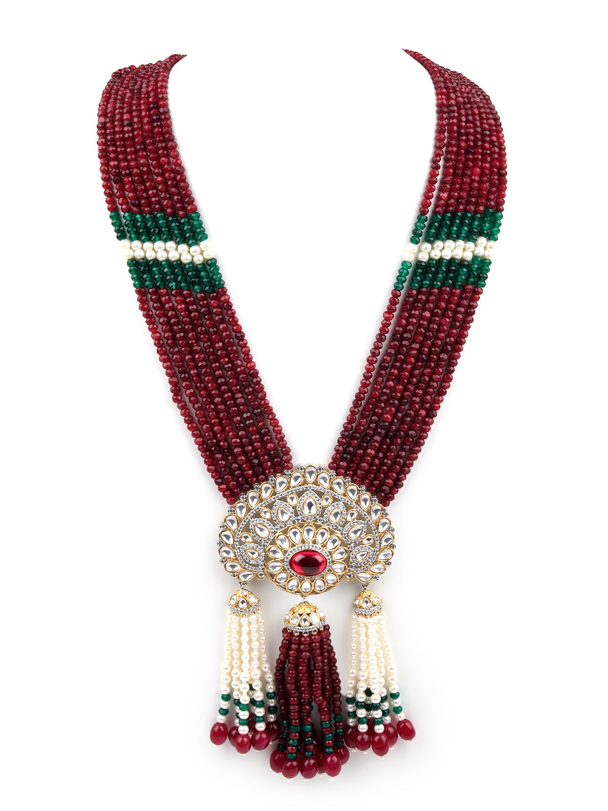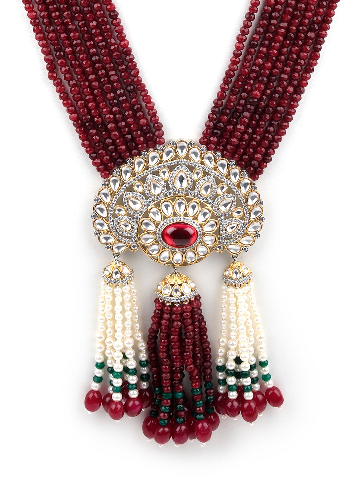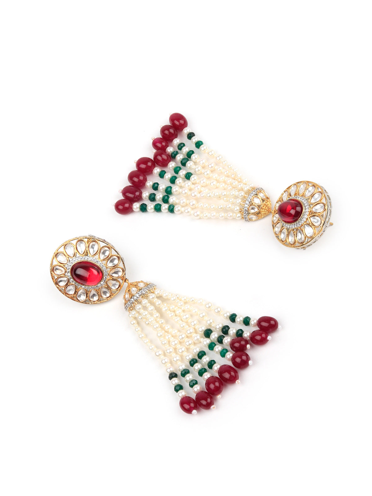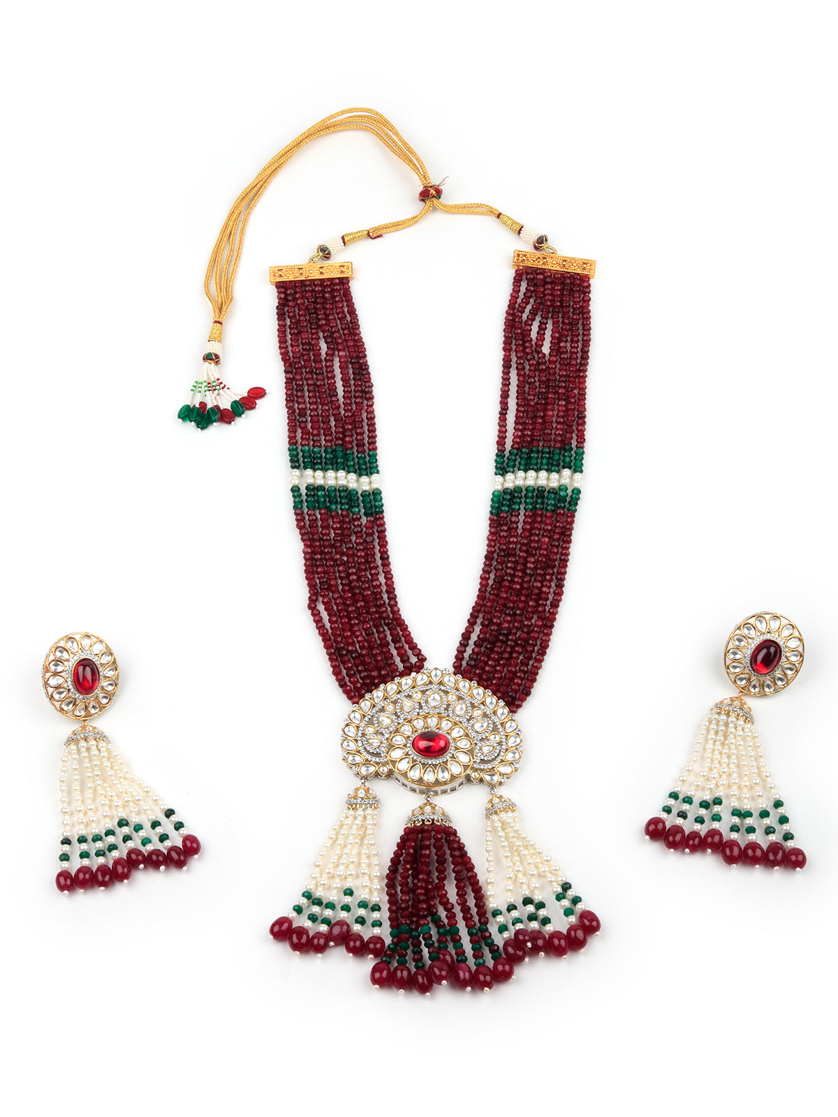 This gorgeous set of neck piece with dangling earrings is a great accompaniment to your wedding or party outfit. The necklace has Kundan and beads on it. The collection and setting of faux stones lend Victorian grandeur to this piece. This is must have in your collection.