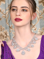 Spruce up your look with this white stone studded choker necklace, that comes with matching earrings and mangteeka. The intricately designed choker neckpiece is decorated with white faux stones and is flanked by statement earrings and matching maangteeka. The set is beautified with stone and intricate work. 1. Intricate design 2. Studded with white faux stones 3. Compliments Indian look 3. Choker Necklace Pattern 4. With Matching Earrings and maangtika