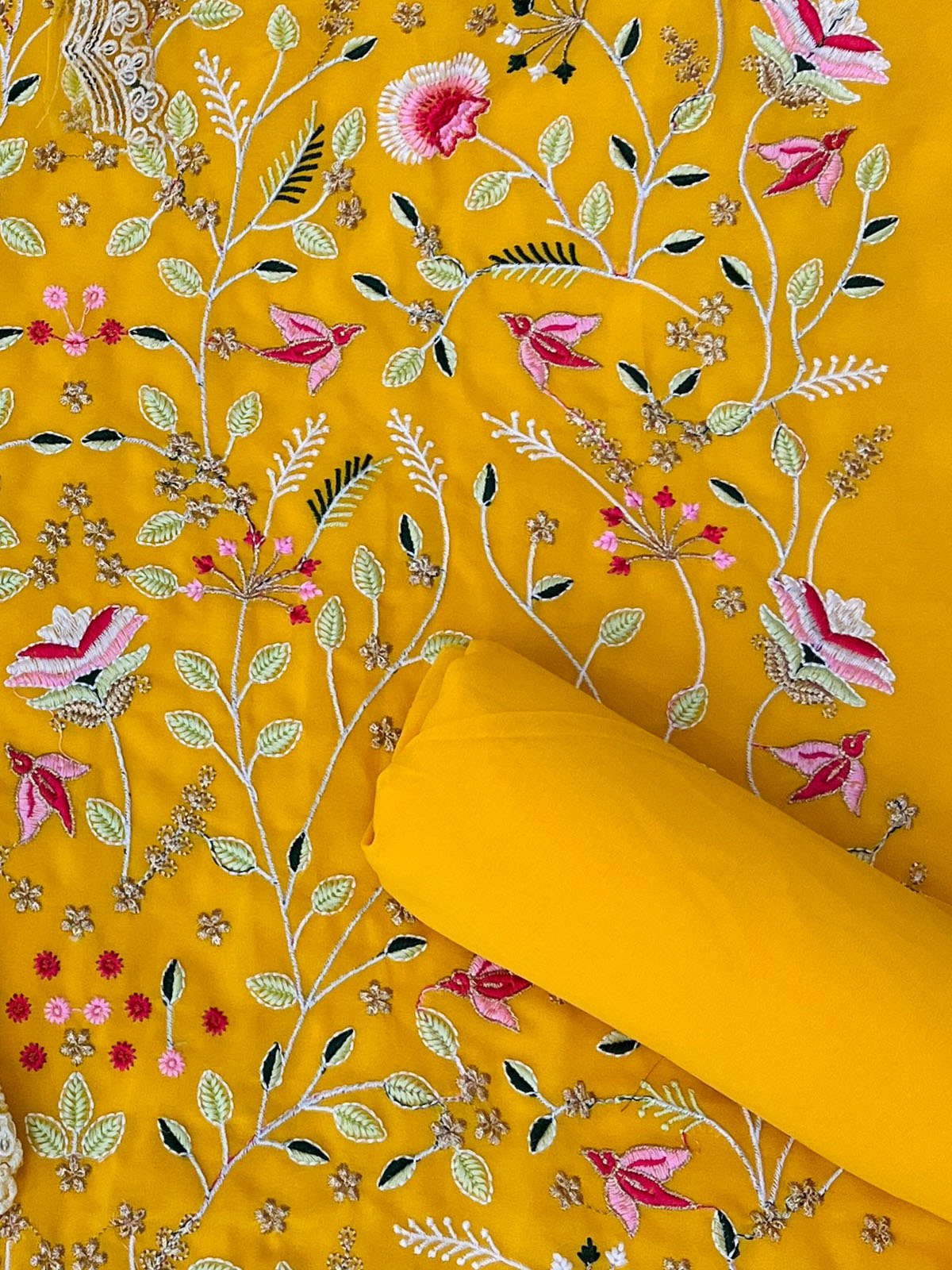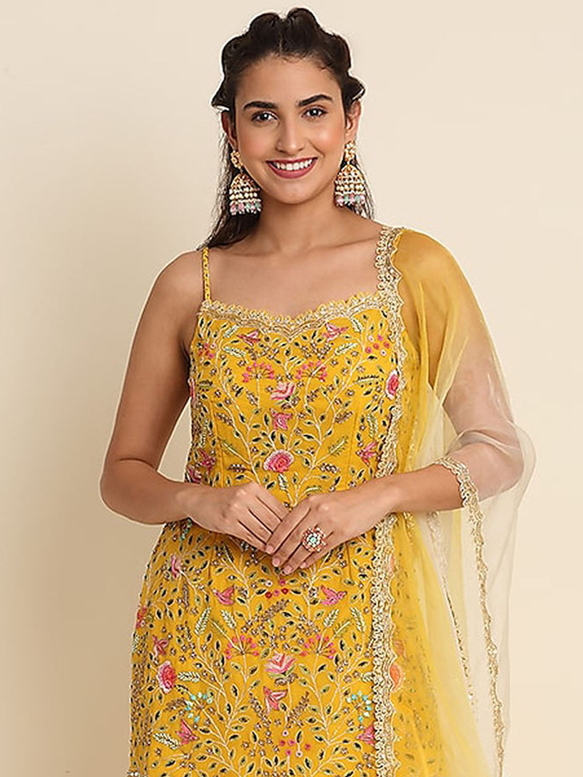 Design, style and pattern will add to your beauty as you dress in this Yellow sharara suit. This georgette suit is beautifully adorned with designer floral sequence embroidery work adding to its grace. This suit comes along with georgette bottom, santoon inner and embroidered net Dupatta. Women can buy this suit for upcoming parties, sangeet wear, engagement functions and family occasions, basically where ever you want to be in the limelight.